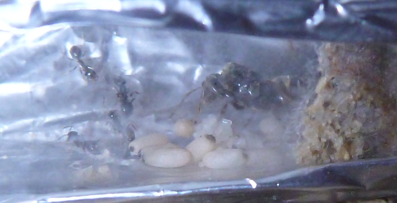 Die Eier werden vornehmlich im Eingang gelagert, wo sich auch die meisten Arbeiterinnen und manchmal die