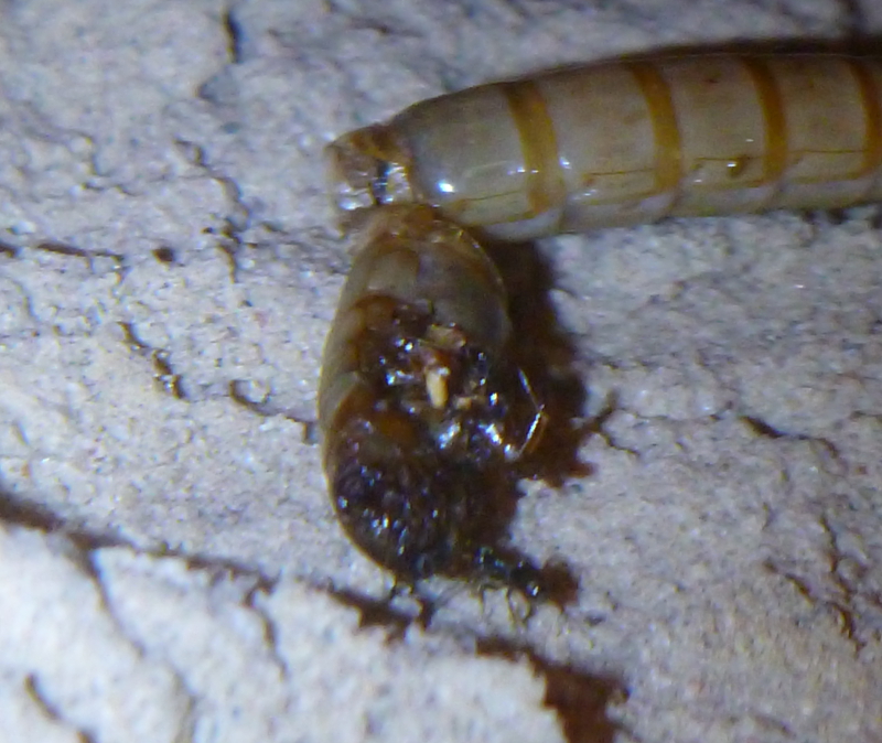 An Futter gibt es - bis meine Heimchenbestellung eintrifft - vor allem Zophobas-Würmer. Dabei scheinen die Beinchen am interessantesten zu sein.