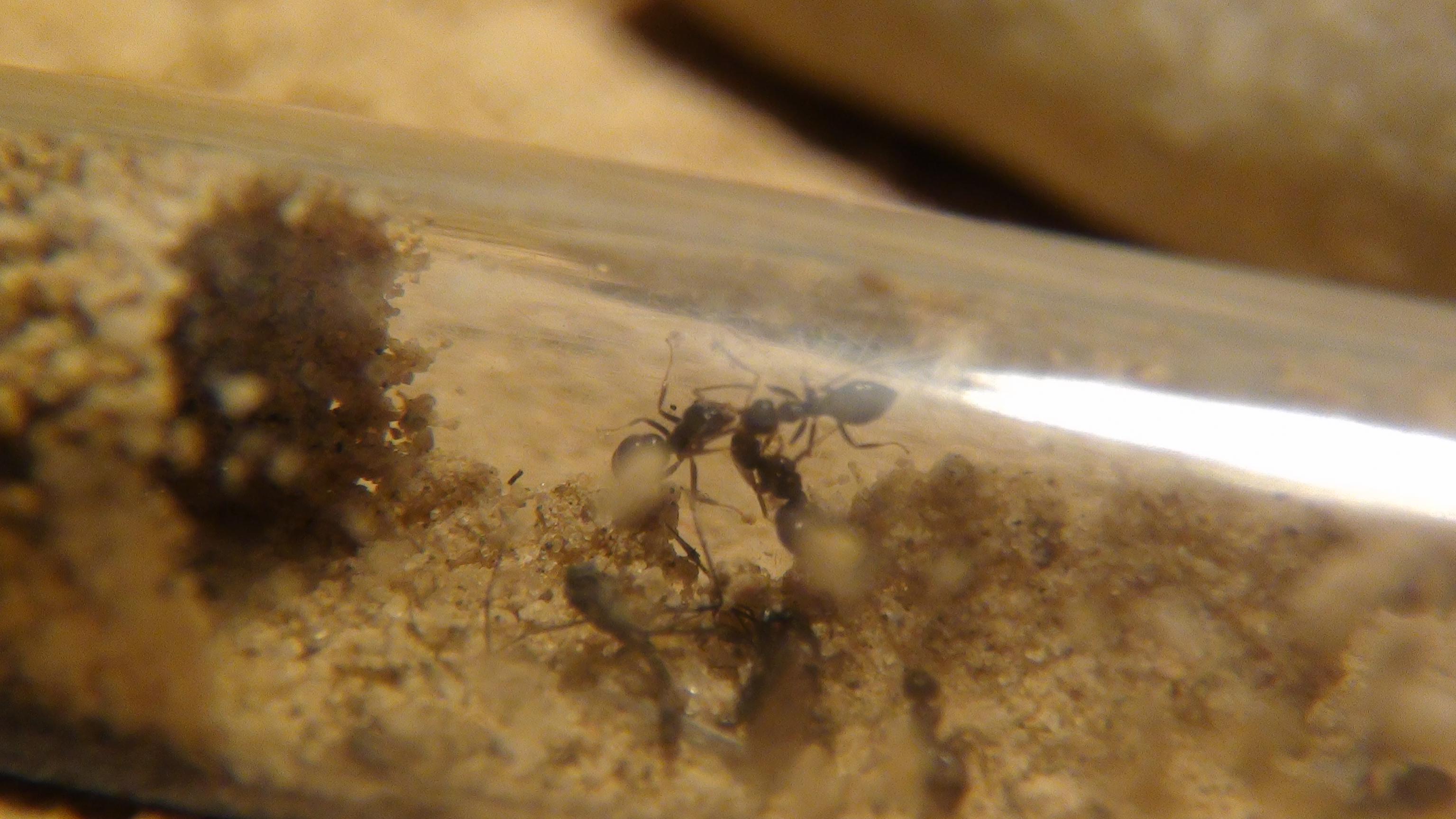 Was mir noch aufgefallen ist, dass sie immer Löcher in den Boden gegraben haben. Bald haben sie gemerkt, dass es nicht weit runter geht. Trotzdem machten sie weiter. Am Anfang störte es mich, später war es mir dann egal. Es passierte auch nichts. So wie ich es sehen konnte, waren die Löcher verbunden, es waren aber fast keine Ameisen da unten. Was man aber gut sehen konnte, dass die Sand-Lehm Mischung an den Eingängen feuchter war als der andere Bodengrund.