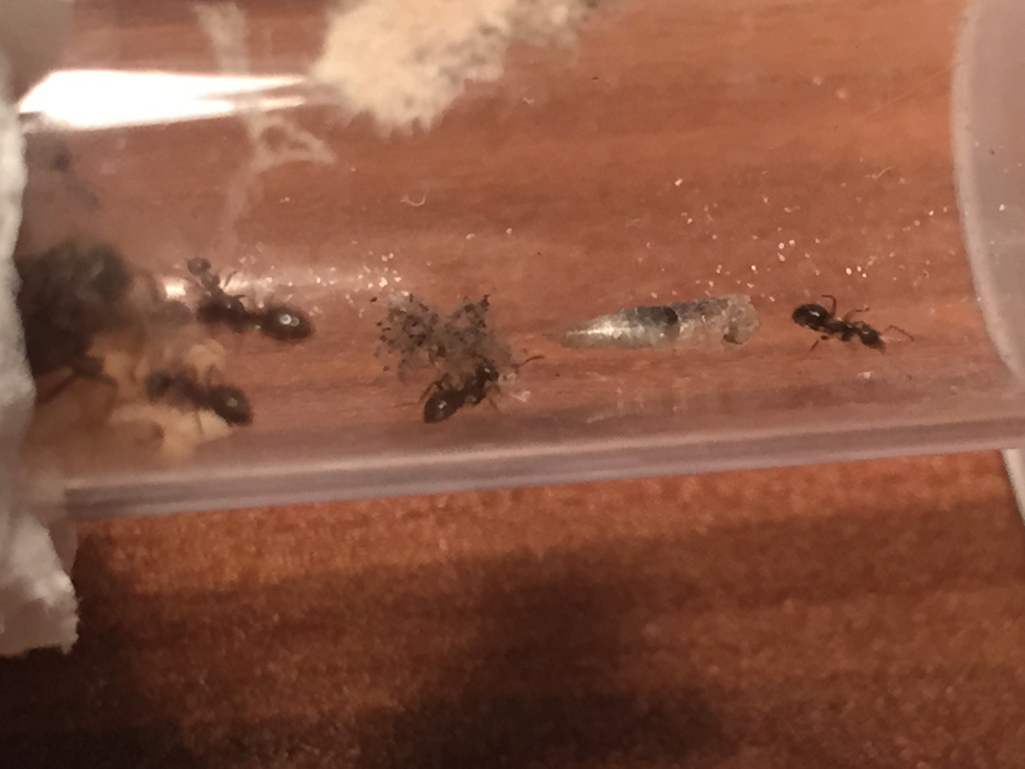 Ich kann nicht sagen, ob es zu dem Zeitpunkt tatsĂ€chlich eine AmeisenstraĂe gab, jedoch haben es die Ameisen geschafft, einen kleinen Riss in der Plastikbox der Fliegen(zu klein fĂŒr die Fliegen) zu finden, und sĂ€mtliche lebenden Tiere, sowie die Maden der Fliegen zu fangen, zu zerlegen, und weg zu schaffen.