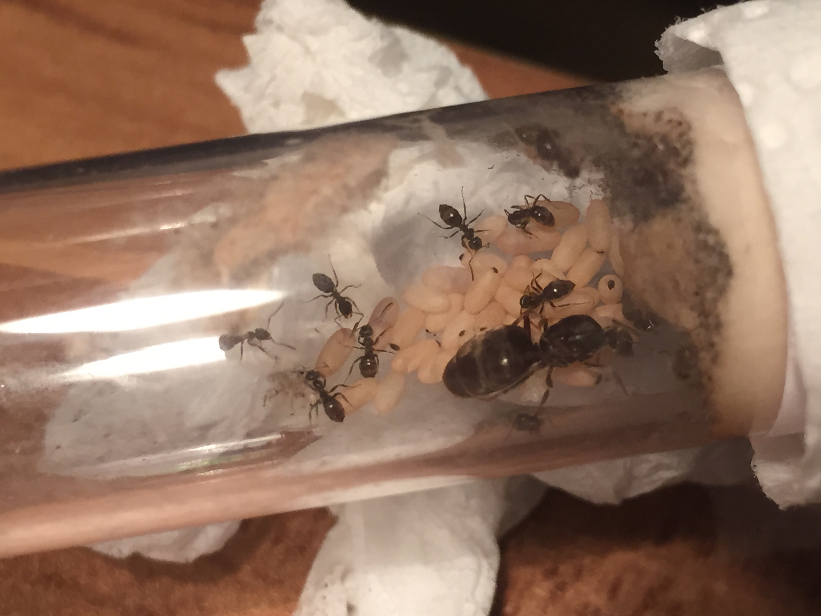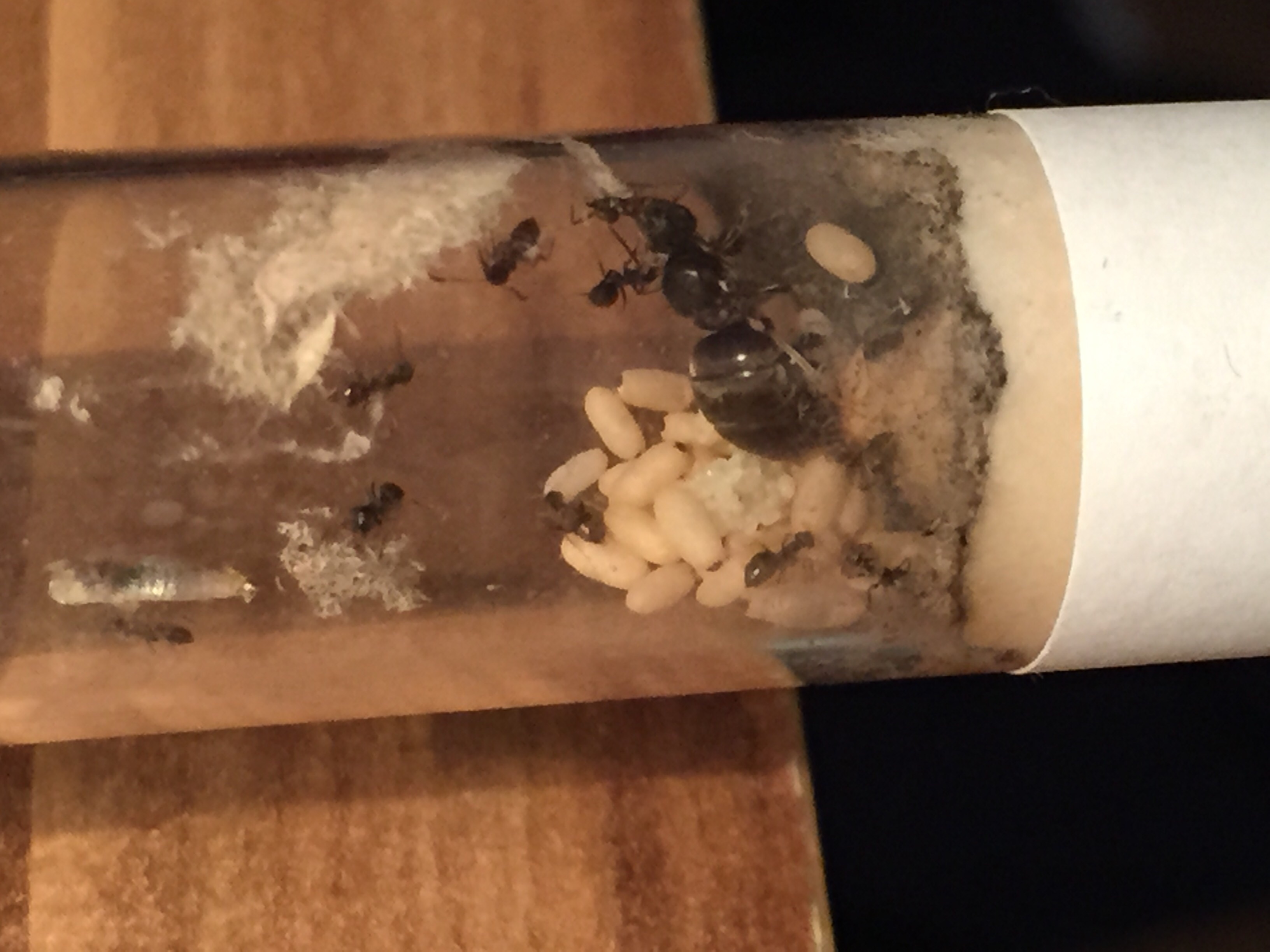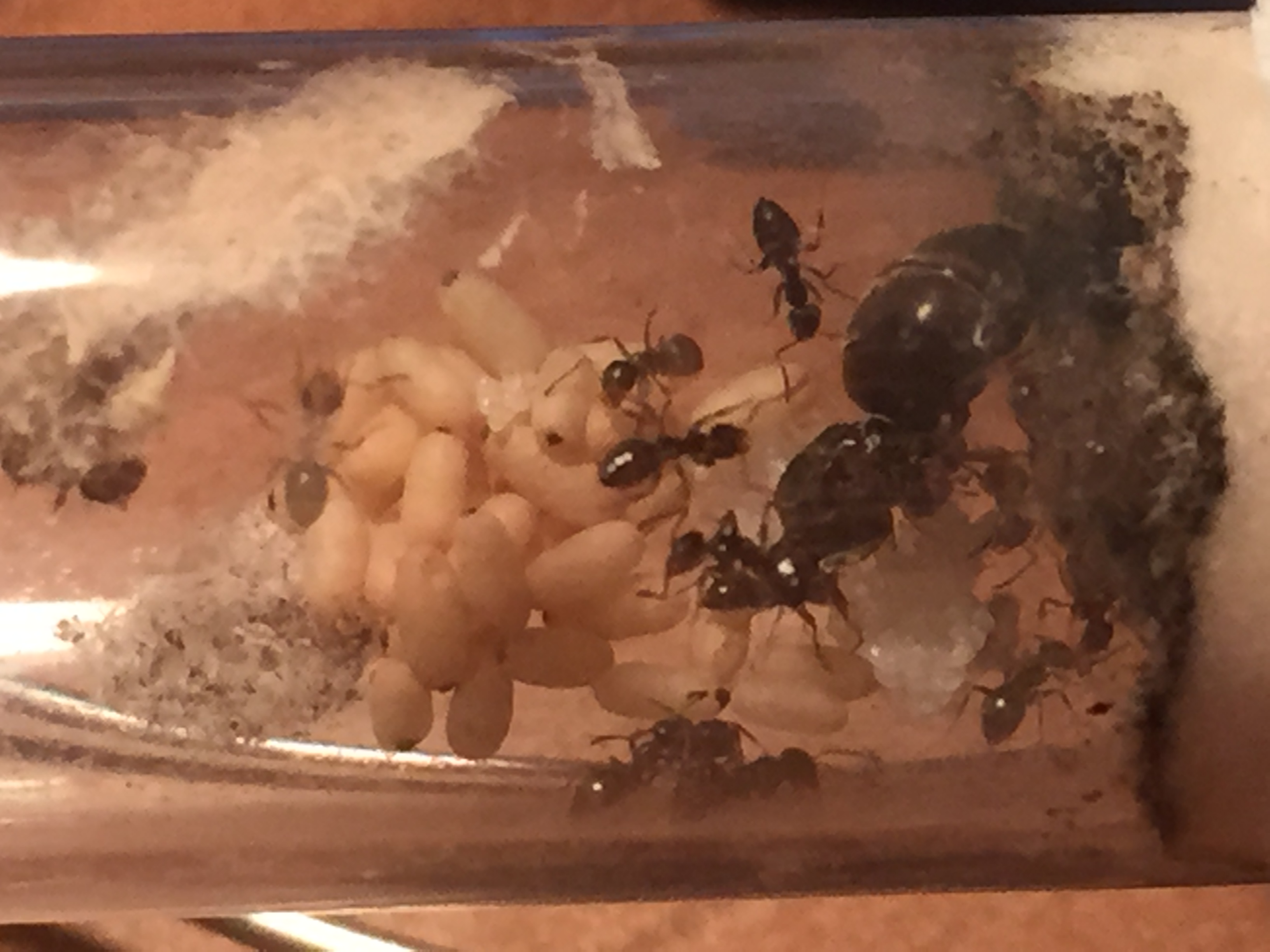 Auch die Anzahl der Arbeiter kann ich lediglich auf so 25-35 schĂ€tzen, denn es sind alleine gestern 5 neue Arbeiterinnen geschlĂŒpft (einfach zu erkennen an den 5 sehr sehr hellen Tierchen).