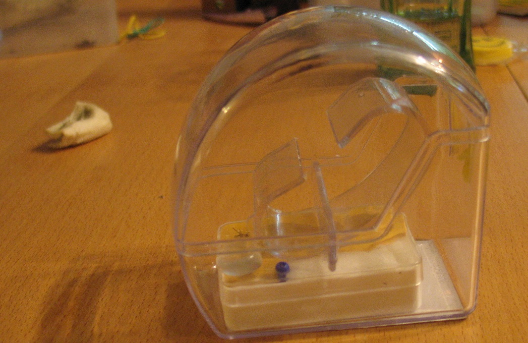 Ich habe nun aus einem kleinen Kästchen eine Miniarena gemacht, in der ich Honig (derzeit Zuckerwasser) und Proteine direkt auf dem Nest anbiete. Mit dem eigentlichen Schlauchsystem hat das leider nichts mehr zu tun, aber wenigstens ist der Platz den sie haben sehr begrenzt.