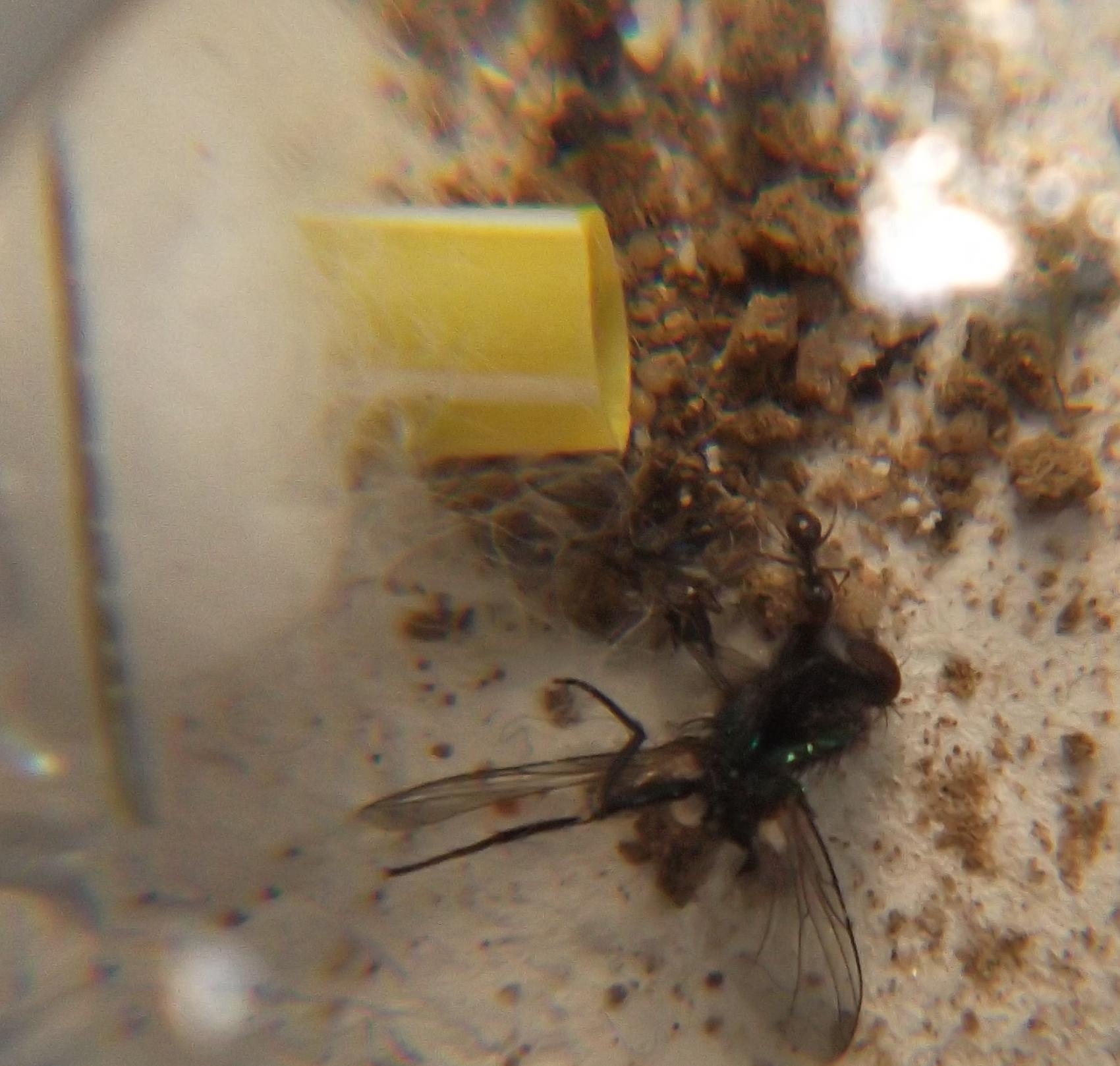 Nachtrag: Auch hat diese Kolonie es bislang unterlassen den Eingang zu verschließen. Dafür hat sie das Fliegenstück unter das mit Honigwasser getränkte Taschentuchstück gestopft. Soll mir recht sein. Es ist mir schon anderweitig aufgefallen, daß Ameisen Insektenteile zu feuchten Stellen transportieren.