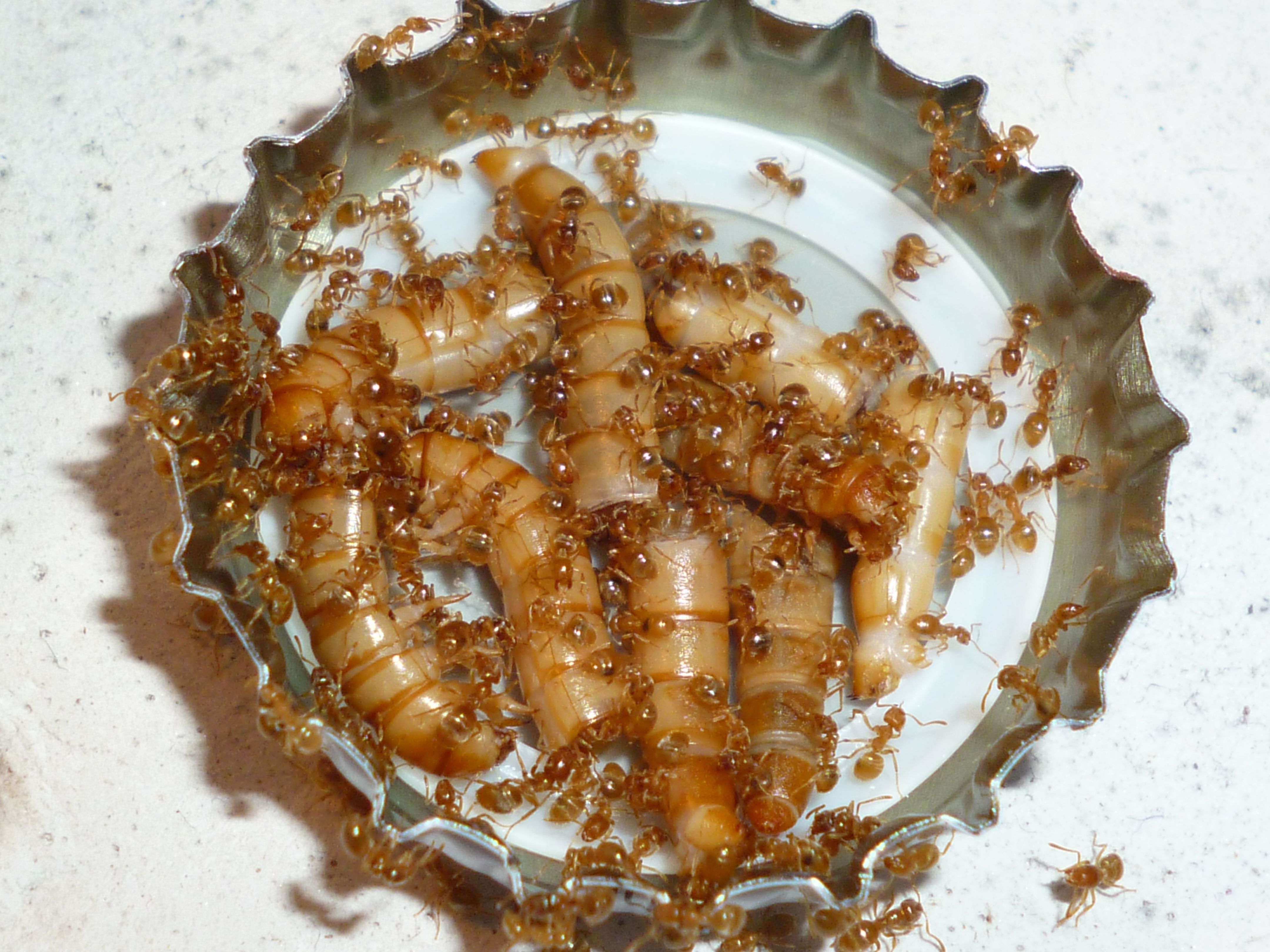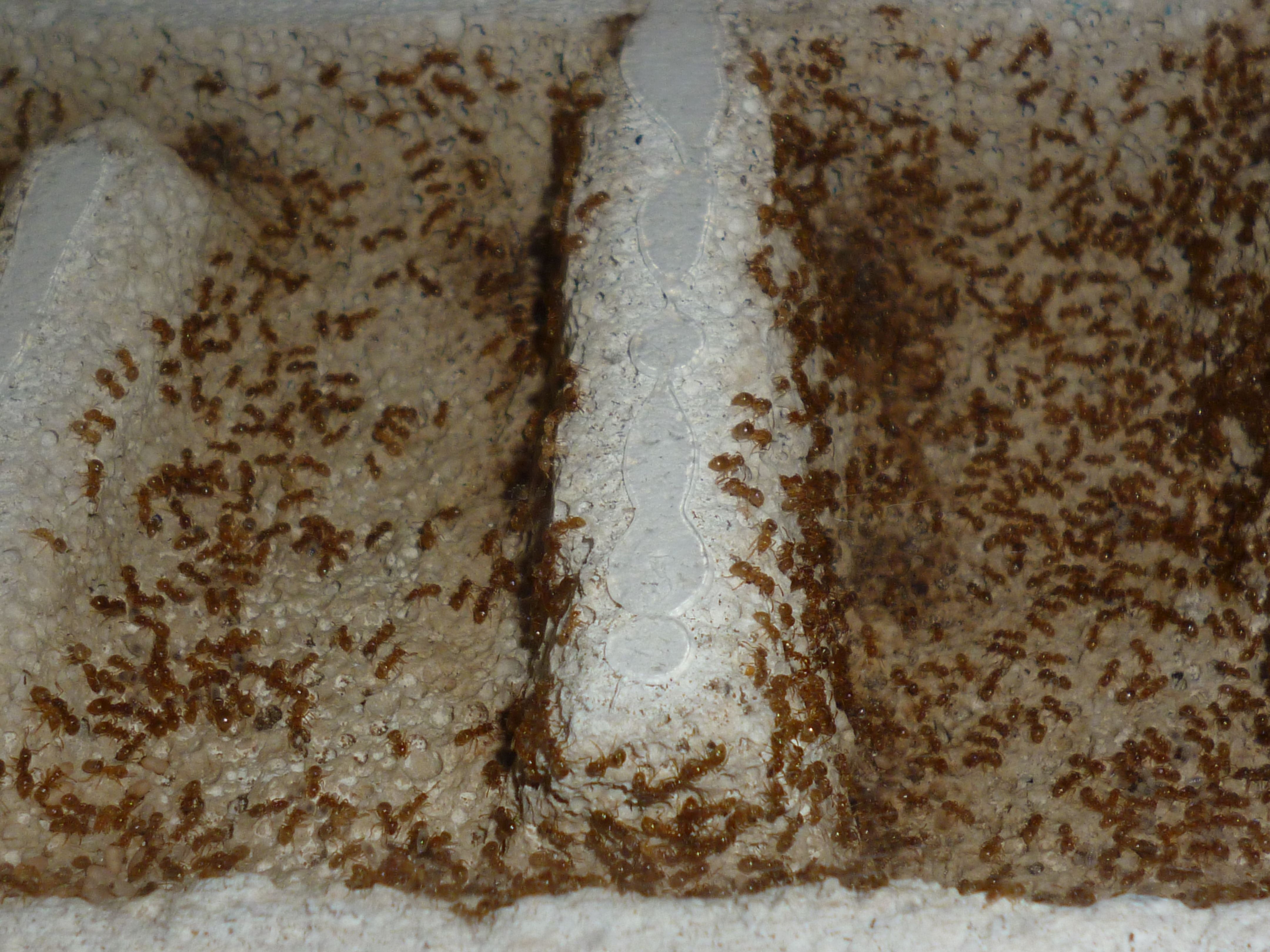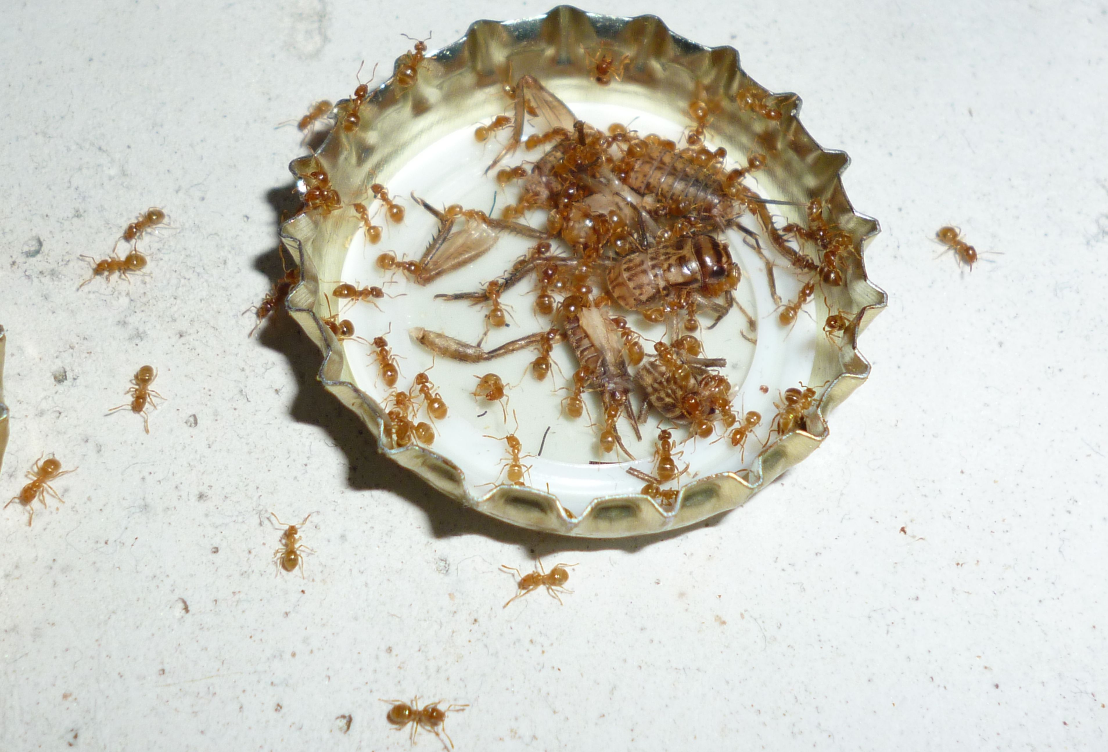 Die Haltung in einer Glas-Arena hat mit den Lasius flavus super funktioniert, sie haben alle Abfälle ganz reinlich in den Ecken der Arena auf Müllhaufen aufgehäuft, und sonst ist die ganze Arena peinlich sauber geblieben. Nun ja, abgesehen von Insektenresten, die sich nicht zerkleinern konnten, und dann an Ort und Stelle verblieben sind. Die Strategie der L. flavus ist eher das Aushöhlen von Futtertieren, denn das Zerkleinern.