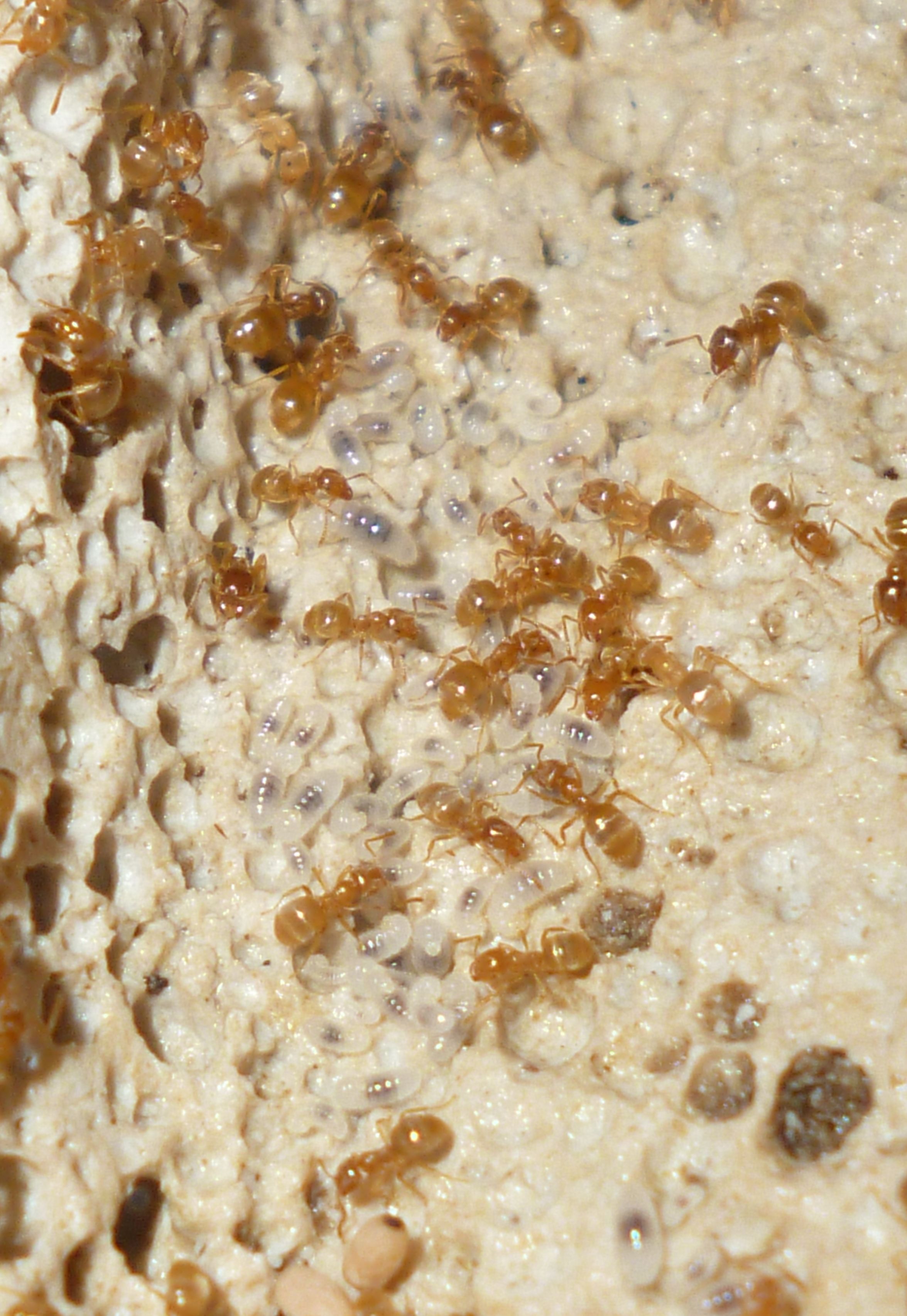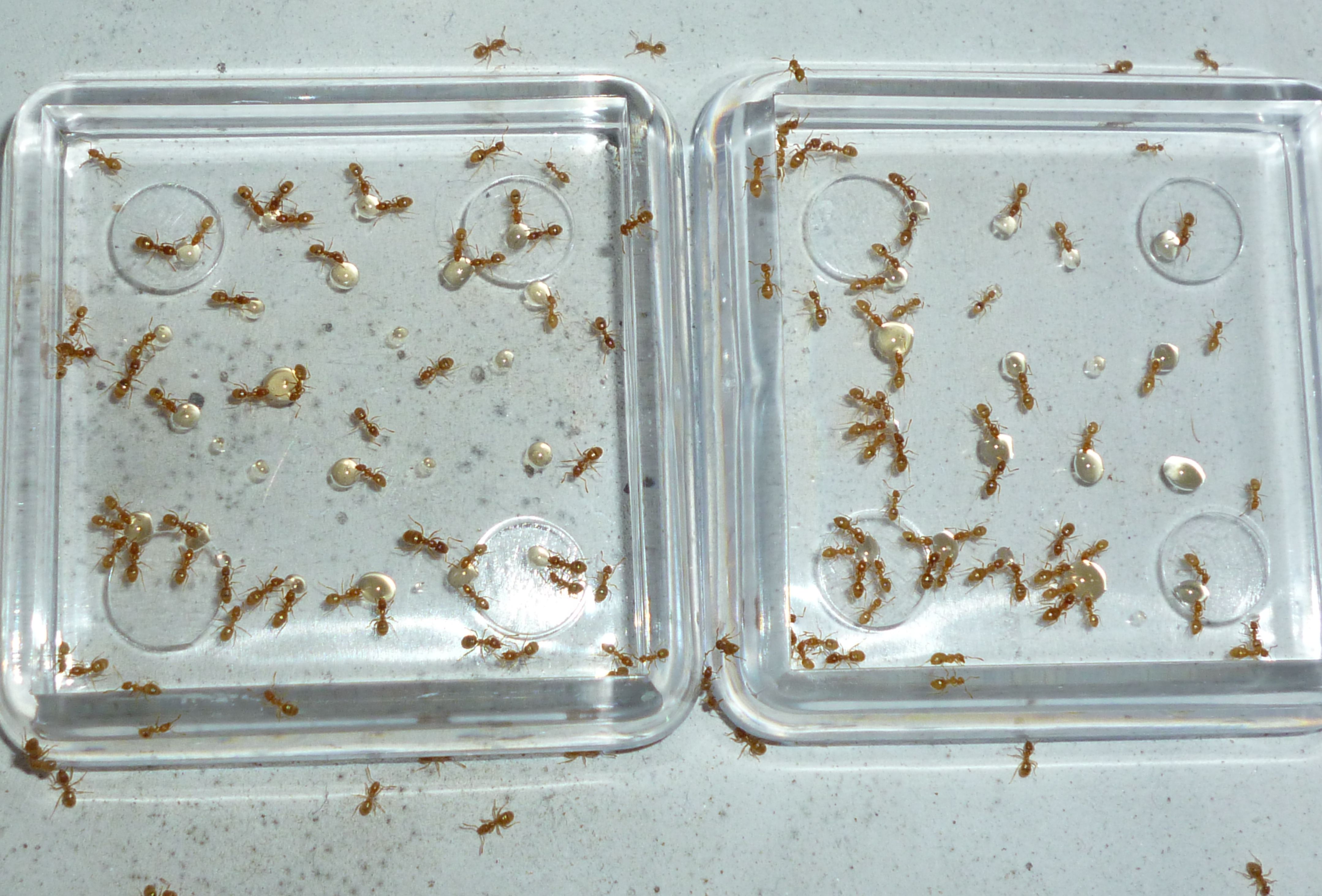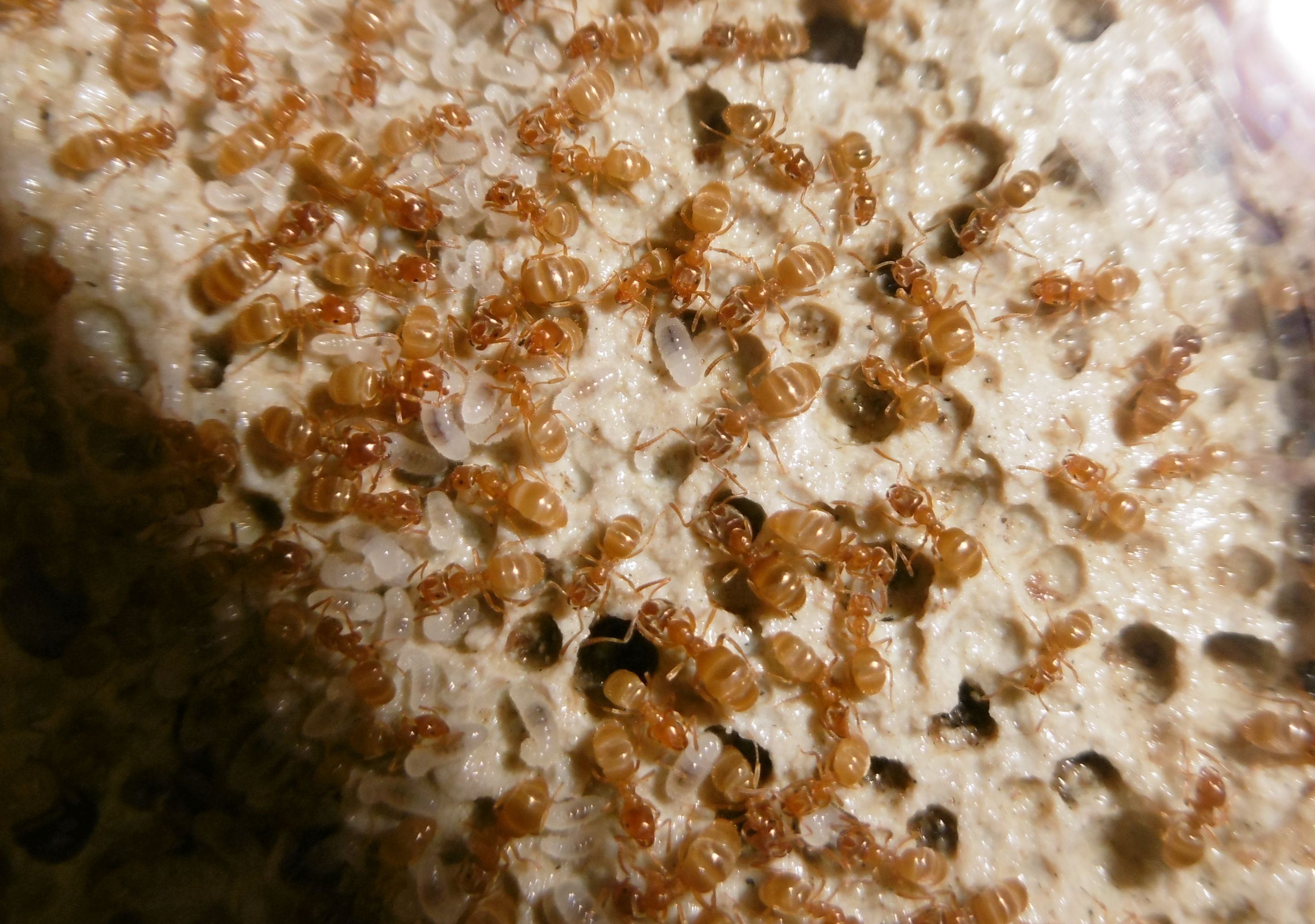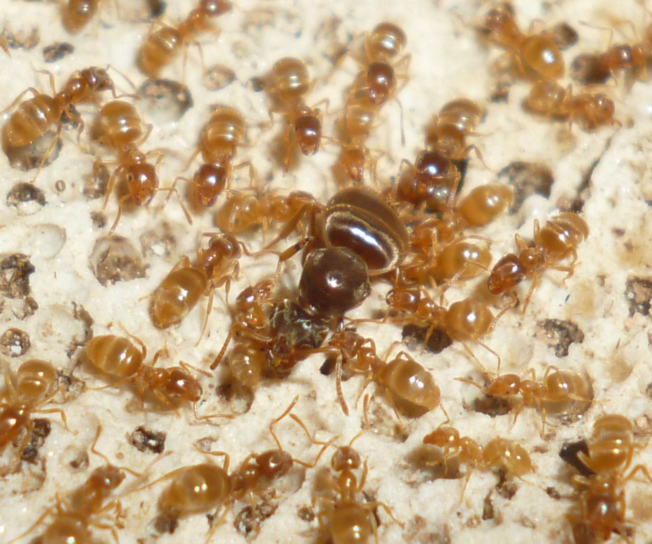 Es gab vor kurzem ein paar Tote bei der Fütterung mit Honig. Man muss bei Lasius flavus wirklich penibel darauf achten, nur winzig kleine Tropfen Honig anzubieten, sonst können sie sich nicht helfen und ertrinken darin .