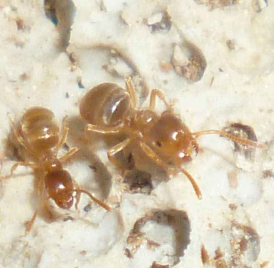 Etwas was mich sehr fasziniert, ist der Größenunterschied zwischen den Arbeiterinnen. Pygmäen dürfte es nach vier Jahren wenige bis gar keine mehr geben, und trotzdem ist der Unterschied zwischen sehr kleinen und sehr großen Arbeiterinnen deutlich ausgeprägt. Es ist schwer die beiden Extreme gleichzeitig auf ein Foto zu bekommen, vielleicht sammel ich demnächst speziell für diesen Zweck mal zwei Exemplare aus der Arena ab.