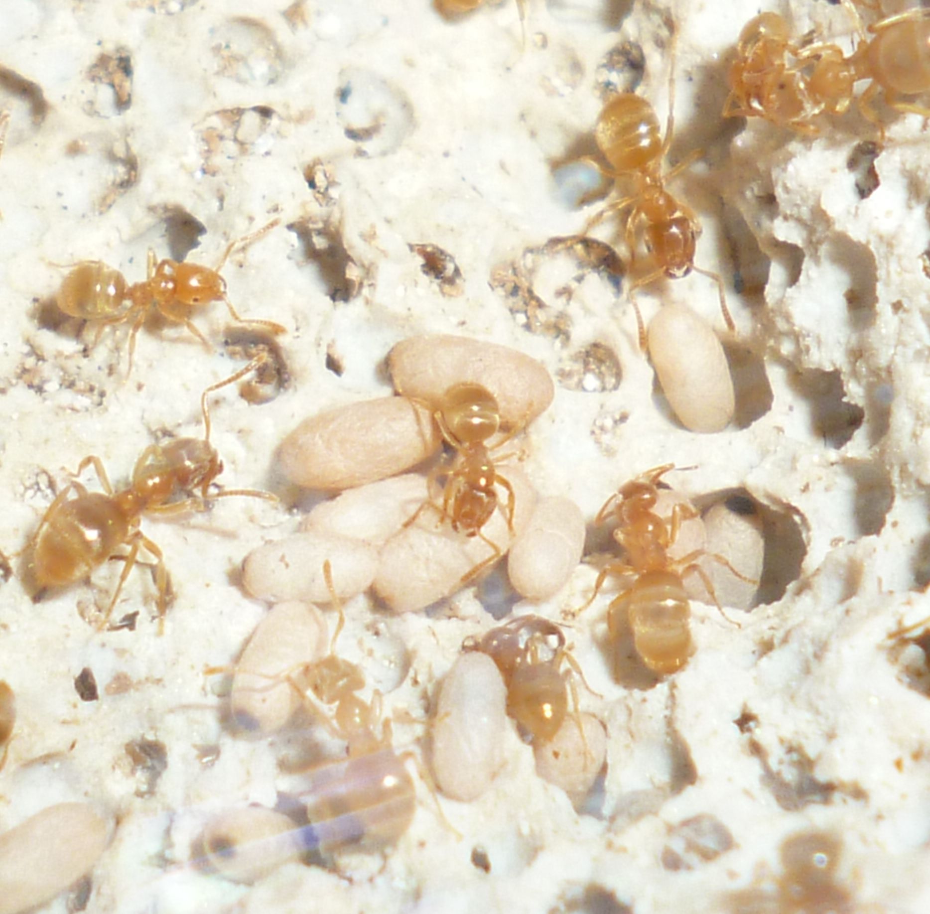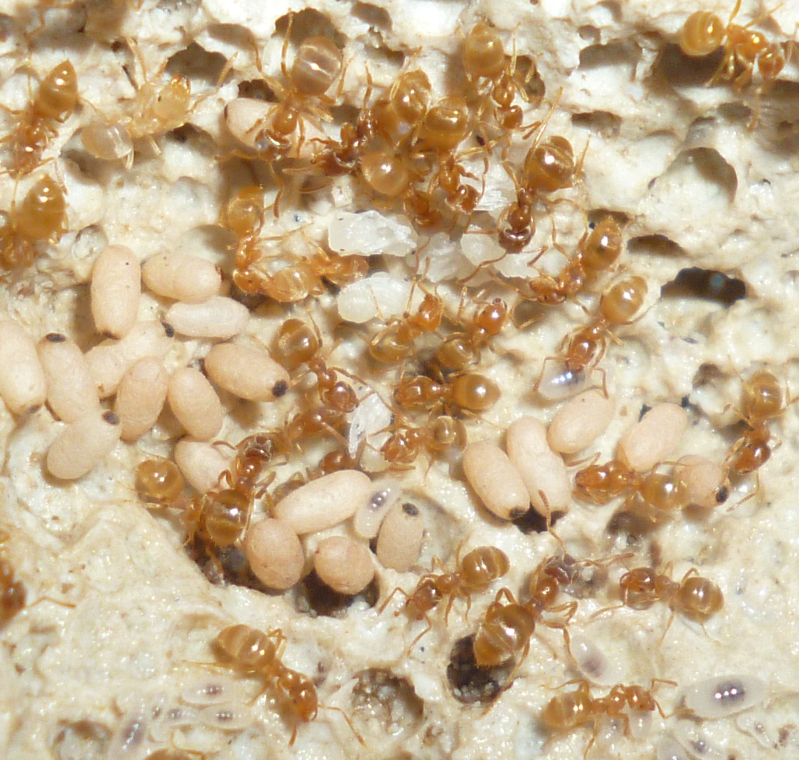 Im Nest selbst gibt es allerlei zu entdecken, es finden sich alle Stadien von Brut und sehr schöne, blasse Arbeiterinnen, die gerade erst geschlüpft sind. Erwähnenswert ist, dass vieles mit dem bloßen Auge verborgen bleibt, und man erst nach dem Fotografieren genau sieht, was im Detail vor sich geht. Hin und wieder setze ich mich auch mit einer Lupe vor die Anlage, so wird vieles besser ersichtlich . Ich will zu den folgenden Bildern gar nicht viel sagen, genießt sie einfach mit mir und schaut welche kleinen Geschichten sie euch erzählen: