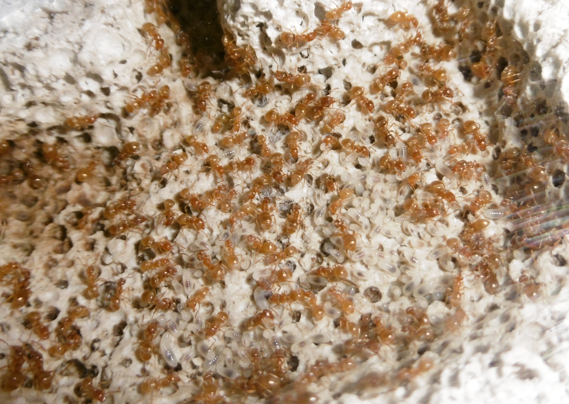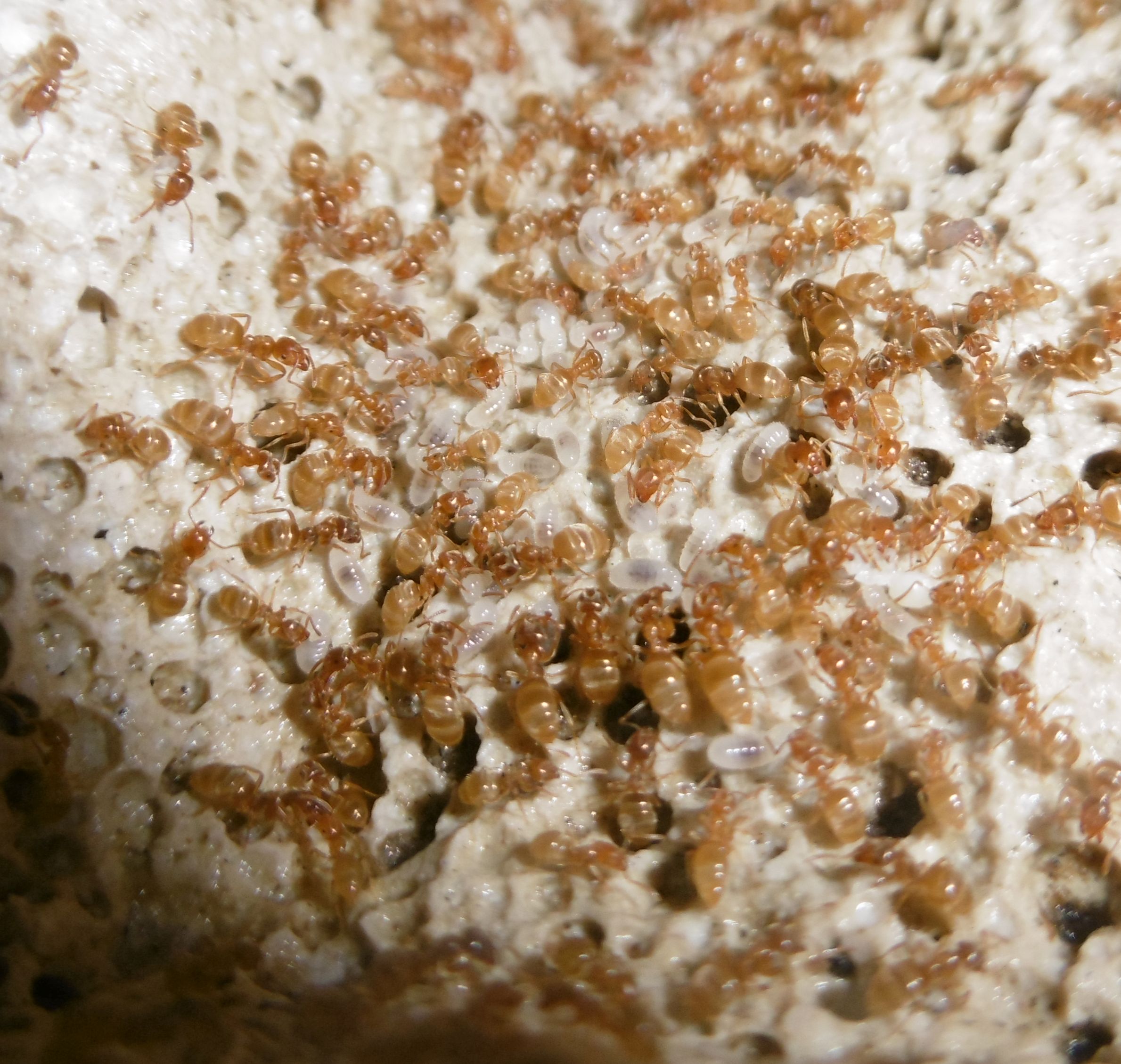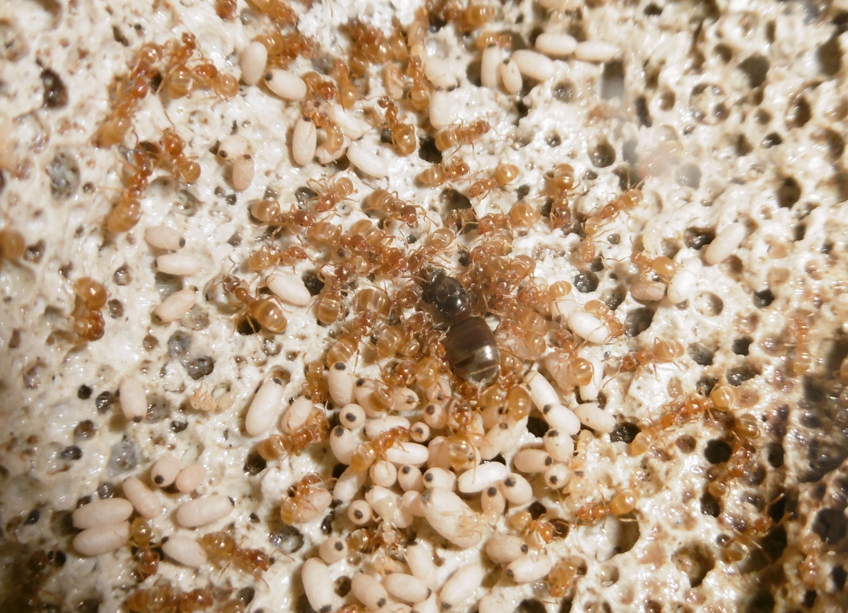 Ich kann bezüglich der Königin Entwarnung geben, sie steht wieder fest auf allen sechs Beinen . Sie ist zum ersten Mal in eine der kleineren Kammern des Ytongnests zu finden, die ursprünglich auch von mir als Königinnenkammer geplant waren. Aber wir wissen alle, unsere Ameisen haben ihren eigenen Kopf.