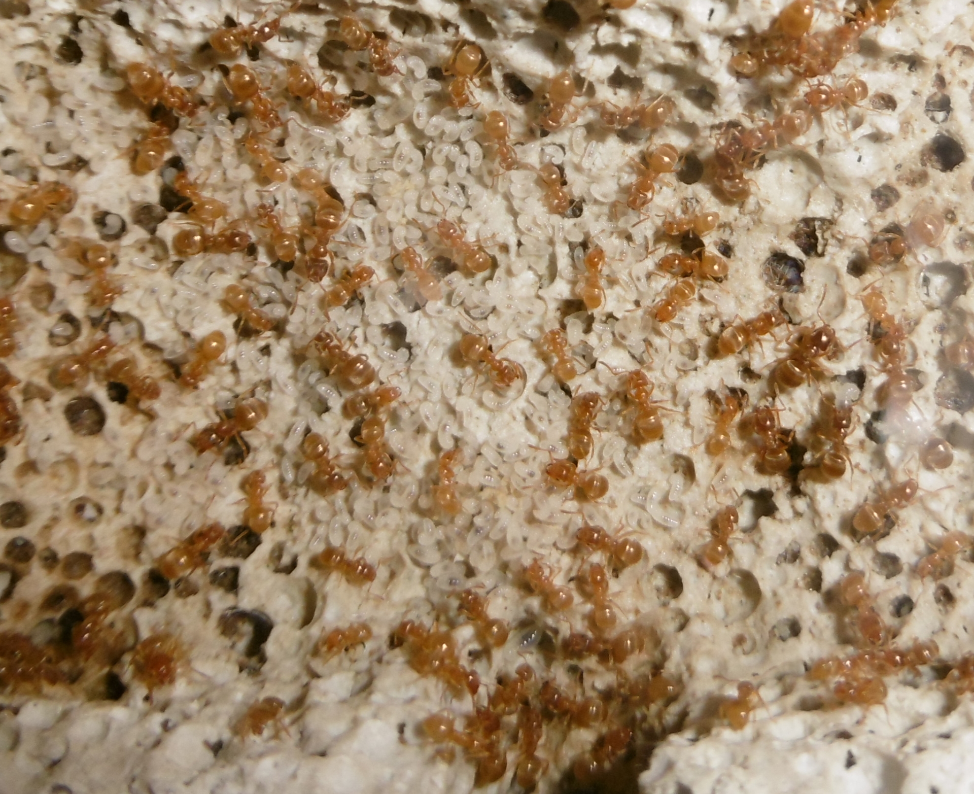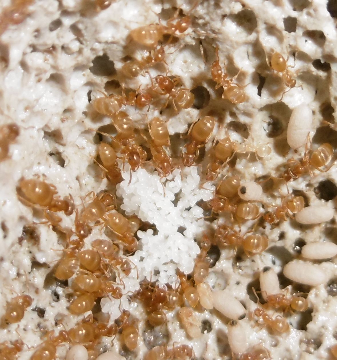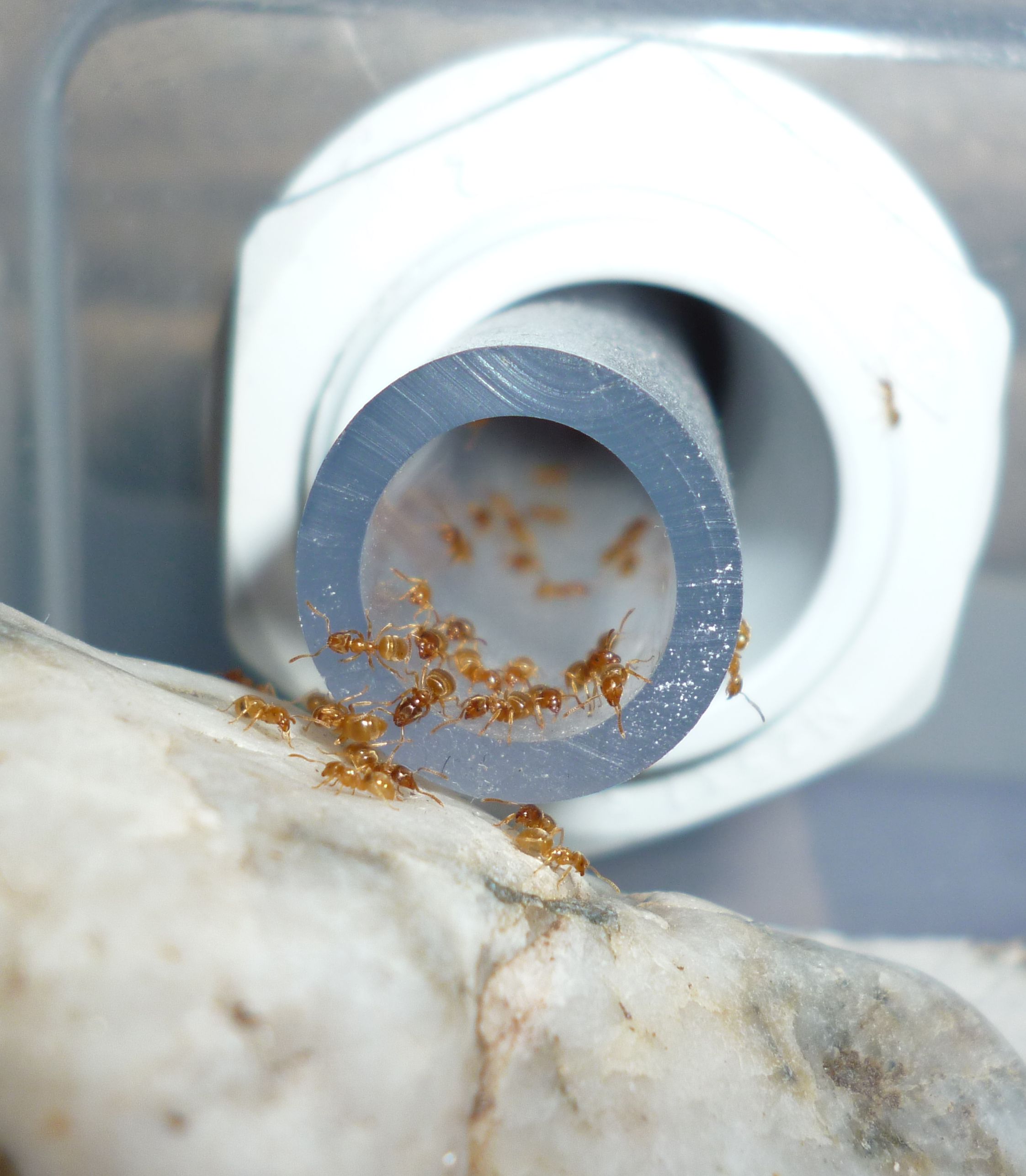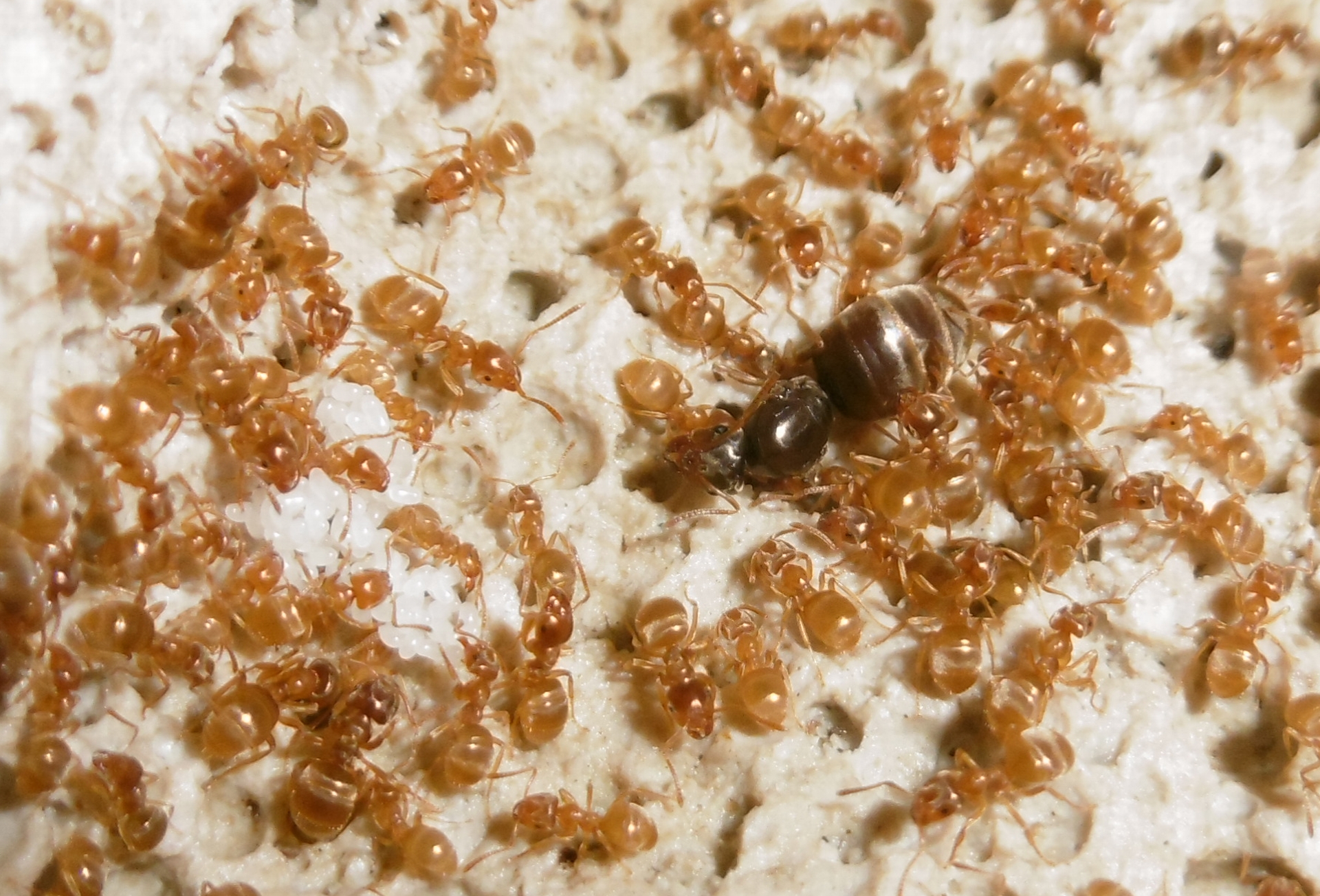 Ich kann bezüglich der Königin Entwarnung geben, sie steht wieder fest auf allen sechs Beinen . Sie ist zum ersten Mal in eine der kleineren Kammern des Ytongnests zu finden, die ursprünglich auch von mir als Königinnenkammer geplant waren. Aber wir wissen alle, unsere Ameisen haben ihren eigenen Kopf.