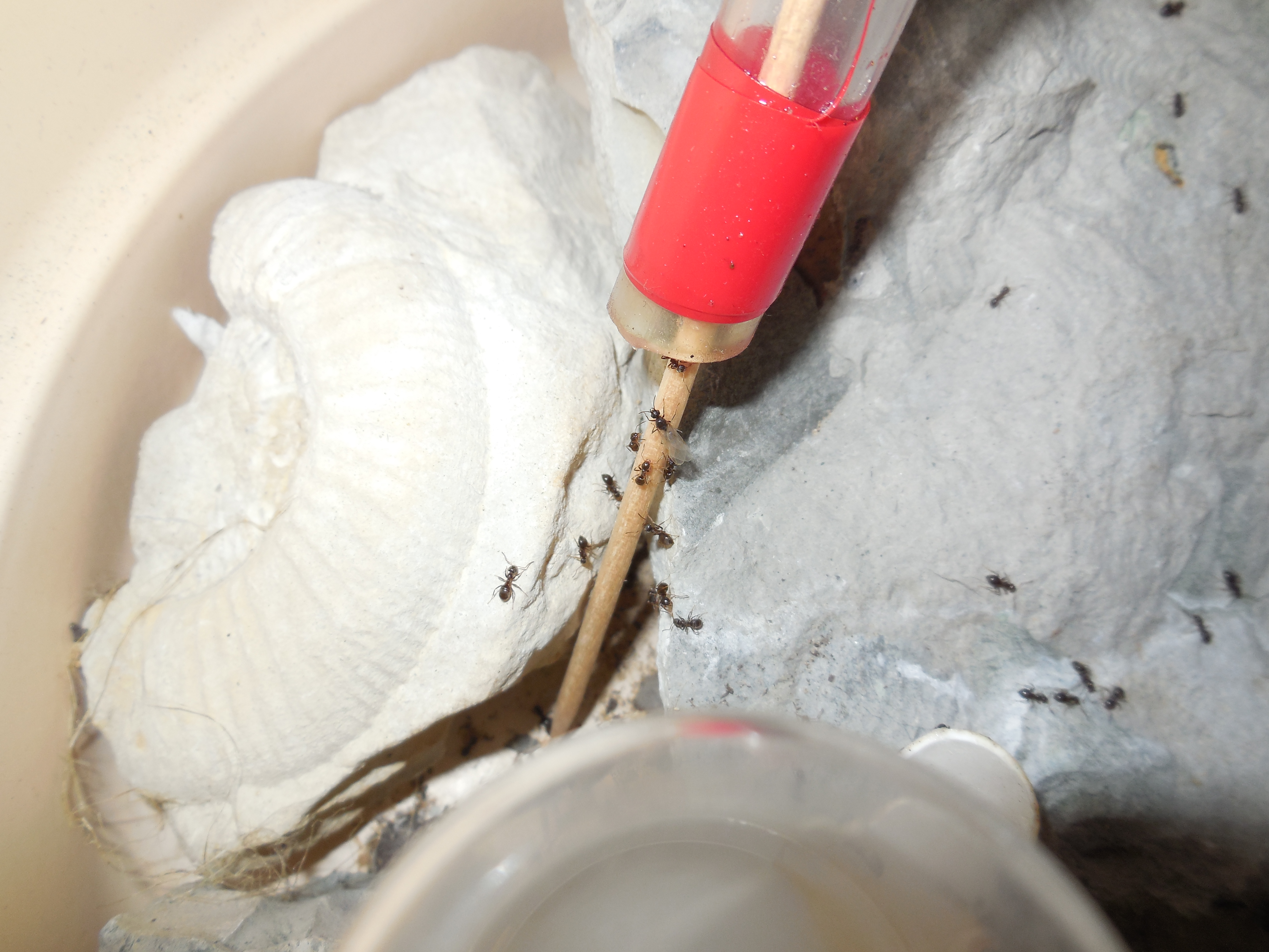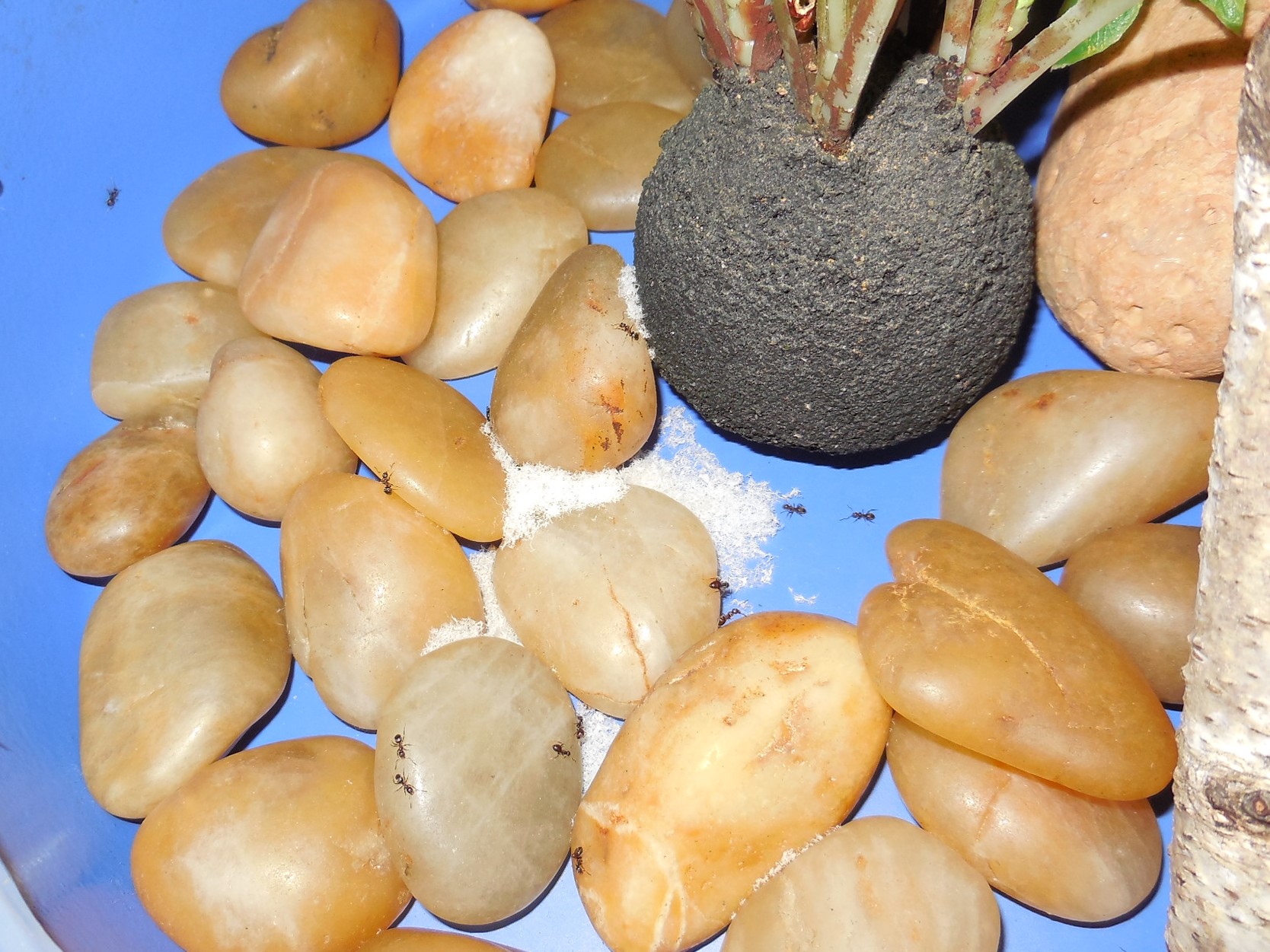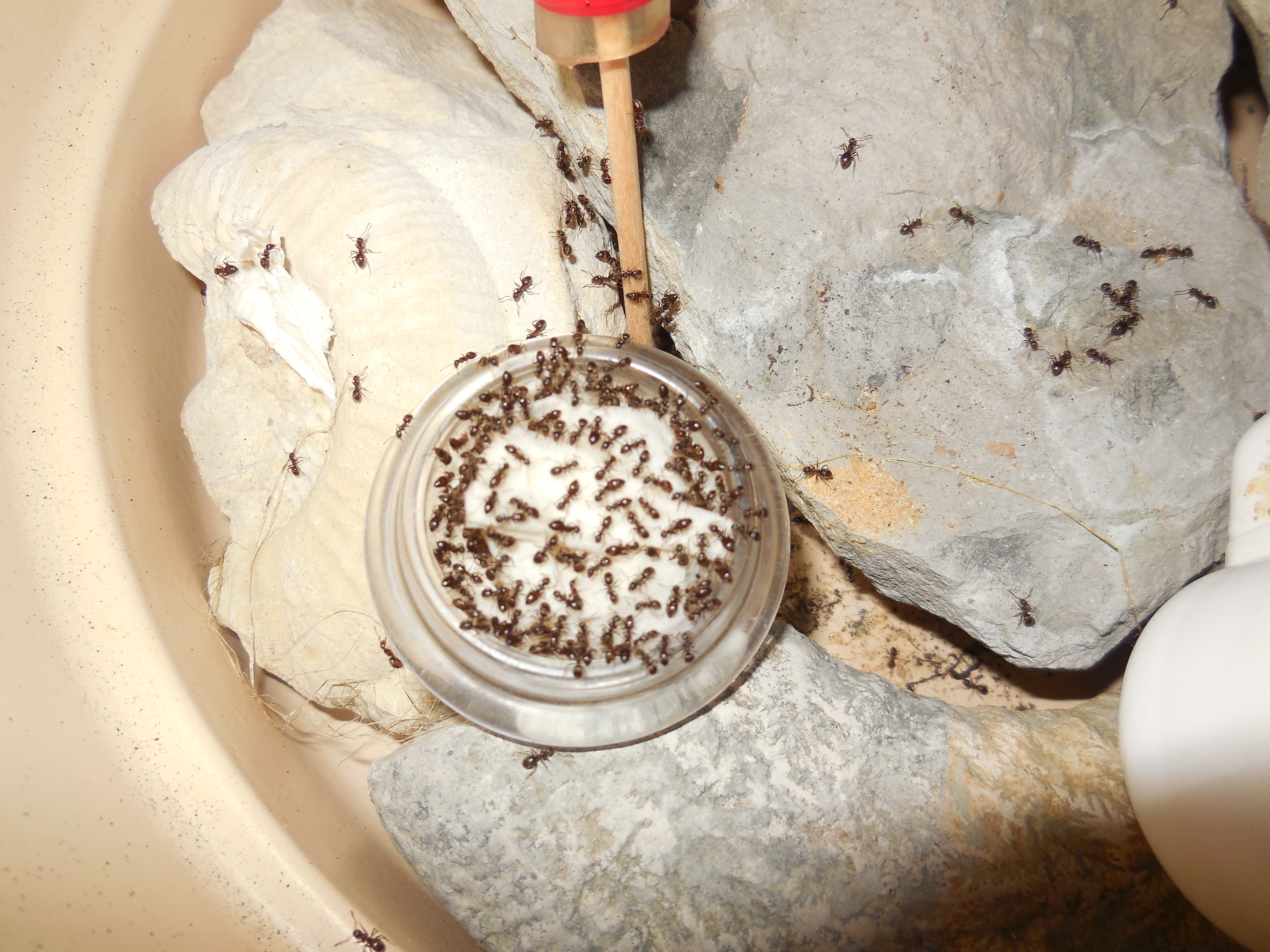 Die Wasserschale hatte ich ergänzt, nachdem die Tränke eines Tages ohne Wasser, dafür voller Ameisen war. Allerdings schütteten sie die Schale in kürzester Zeit mit Sand zu :roll: