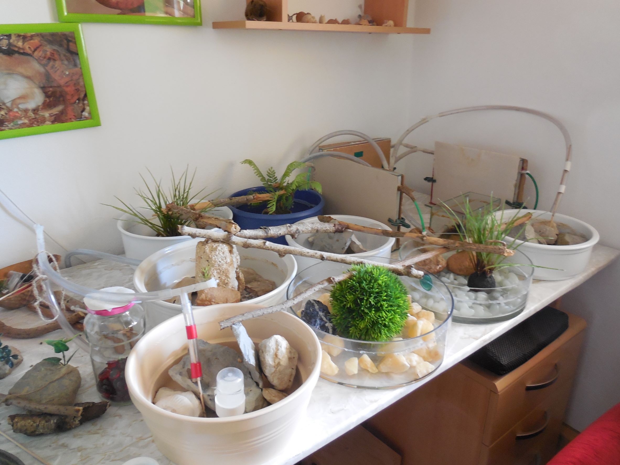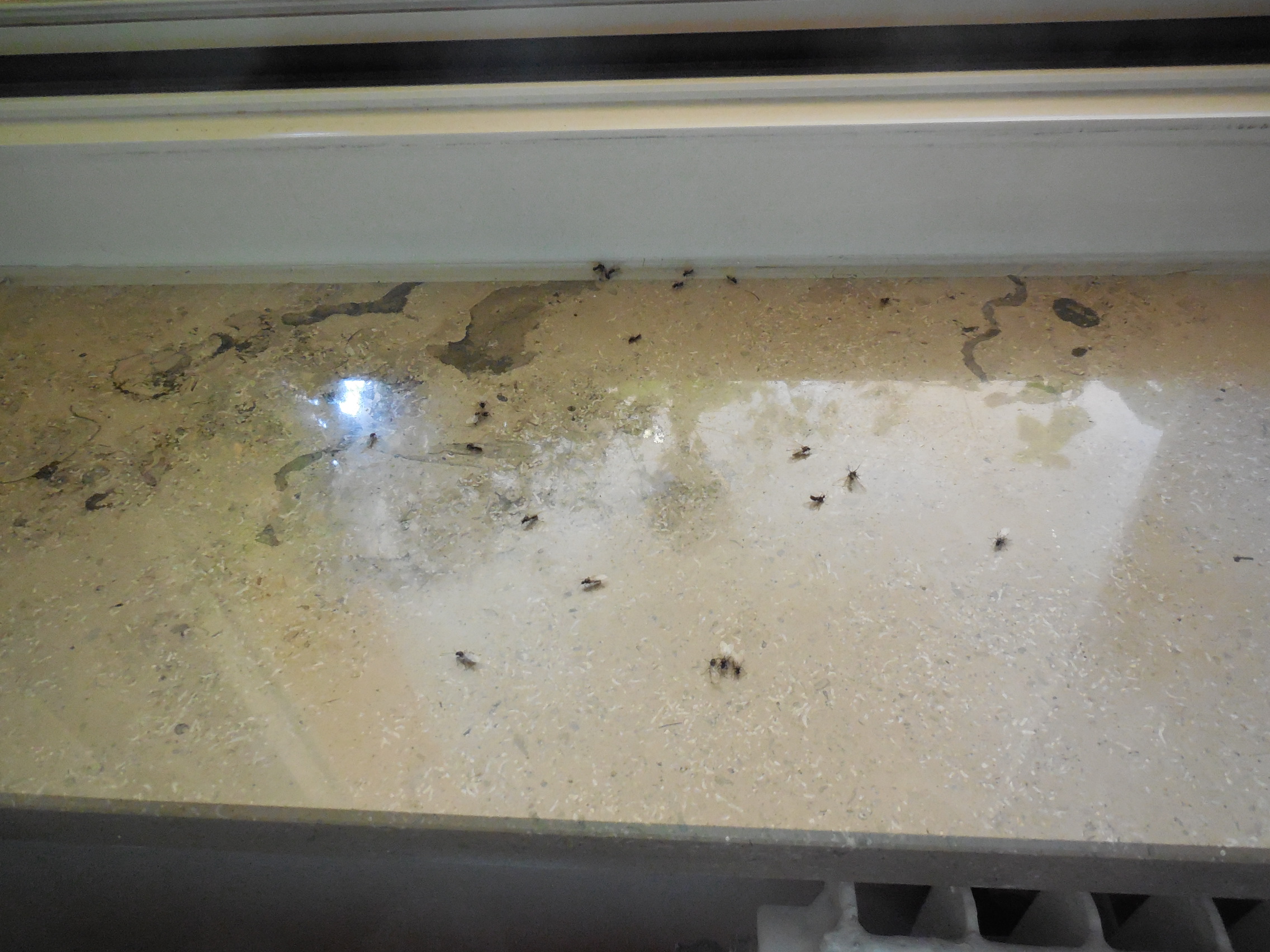 Ausbruch! Aber ich war selbst schuld. Beim Putzen gestern schob ich den Bewässerungschlauch von Farm 2 zur Seite bzw. legte das Ende auf eine der Klammern von Farm 1, die die Pappabdeckung festhalten. Dadurch berührte der Schlauch eine der Kunstpflanzen in den Arenen. Leider bemerkte ich das ganze erst am nächsten Morgen, als ich zum Zug musste. Es warn zwar noch recht wenige Tiere auf Abwegen unterwegs, aber ich ahnte schon, wie ich den Abend verbringen würde. War dann auch fleißig am Sammeln. Dass ich das Leck erst nach einiger Zeit ausmachen konnte, beschleunigte die Sache nicht gerade. Zum Glück spielte sich fast alles auf dem Tisch ab. Der Blumentopf des Bogenhanfes war ein Magnet, der Ritterstern komischerweise nicht.