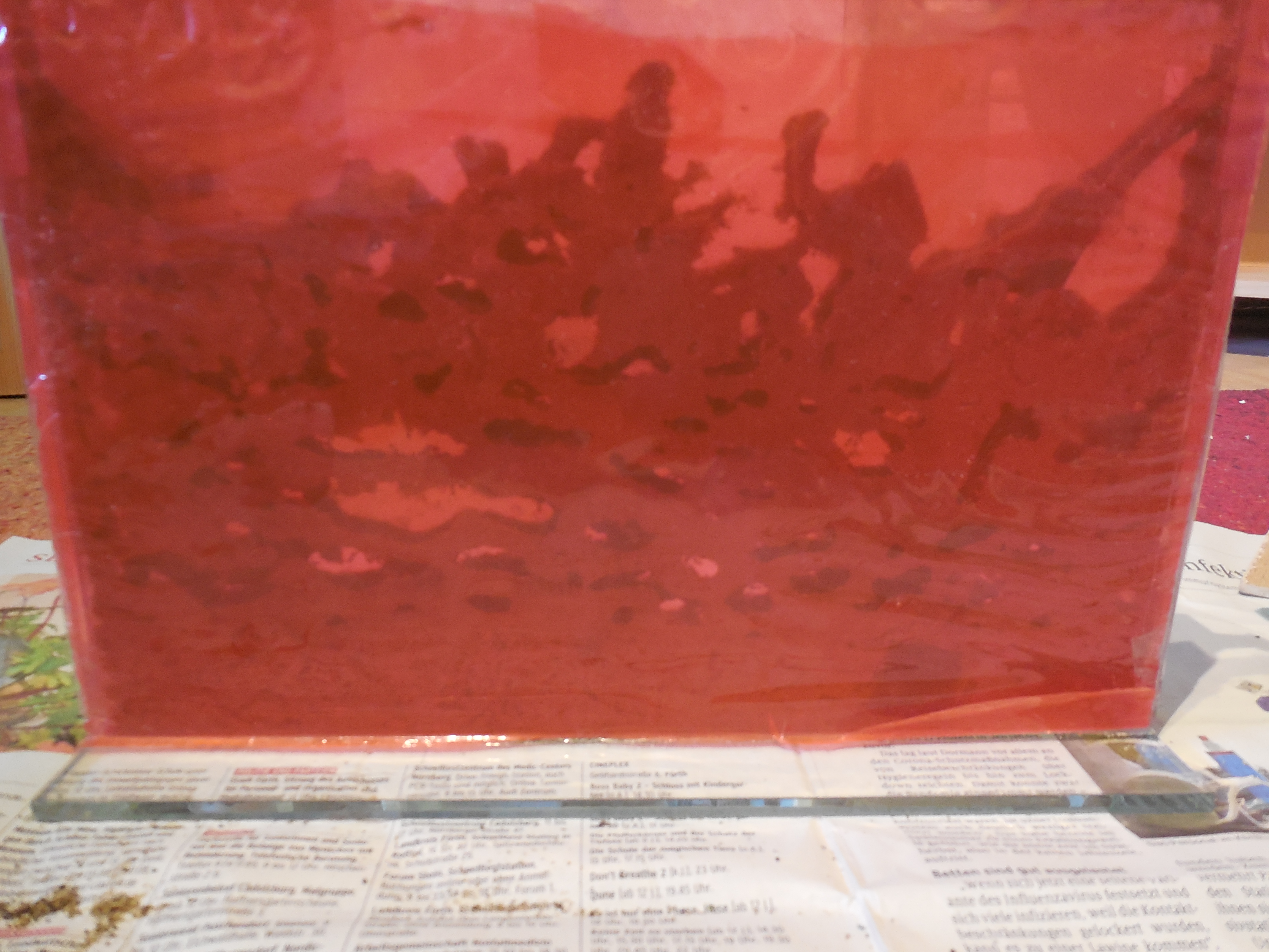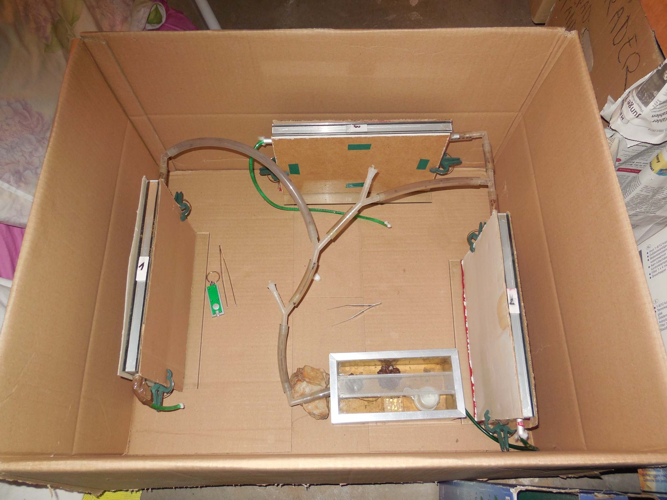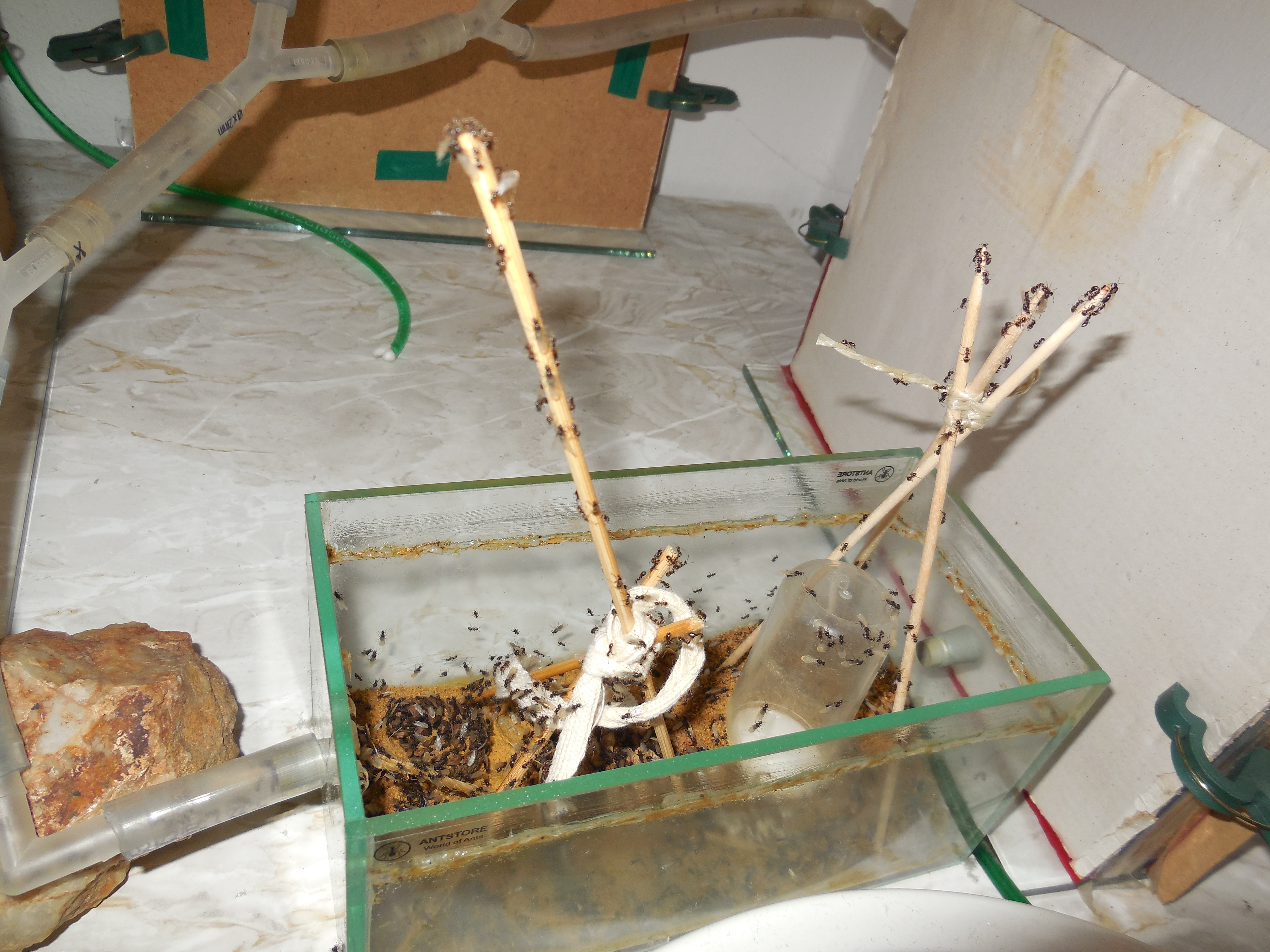 Seit 2 Wochen steht die Kolonie wieder in der Wohnung. Es war/ist alles wie gehabt: nach einer Woche im Keller bei rund 15 Grad holte ich sie nach oben. Die Arenen sind nach bewährtem Schema aufgestellt. Eine fehlt noch, dort ist ein Streifen Silikon ausgerissen, das muss ich noch reparieren. Zum Fressen gibt's Honig, rote Mückenlarven und Mehlwurmpuppen. Von Letzteren hat sich bei mir mittlerweile ein Riesenvorrat im Gefrierschrank angesammelt. Die müssen also weg, werden aber auch gerne genommen, wie alles aktuell. Die Truppe ist ziemlich hungrig ;) .