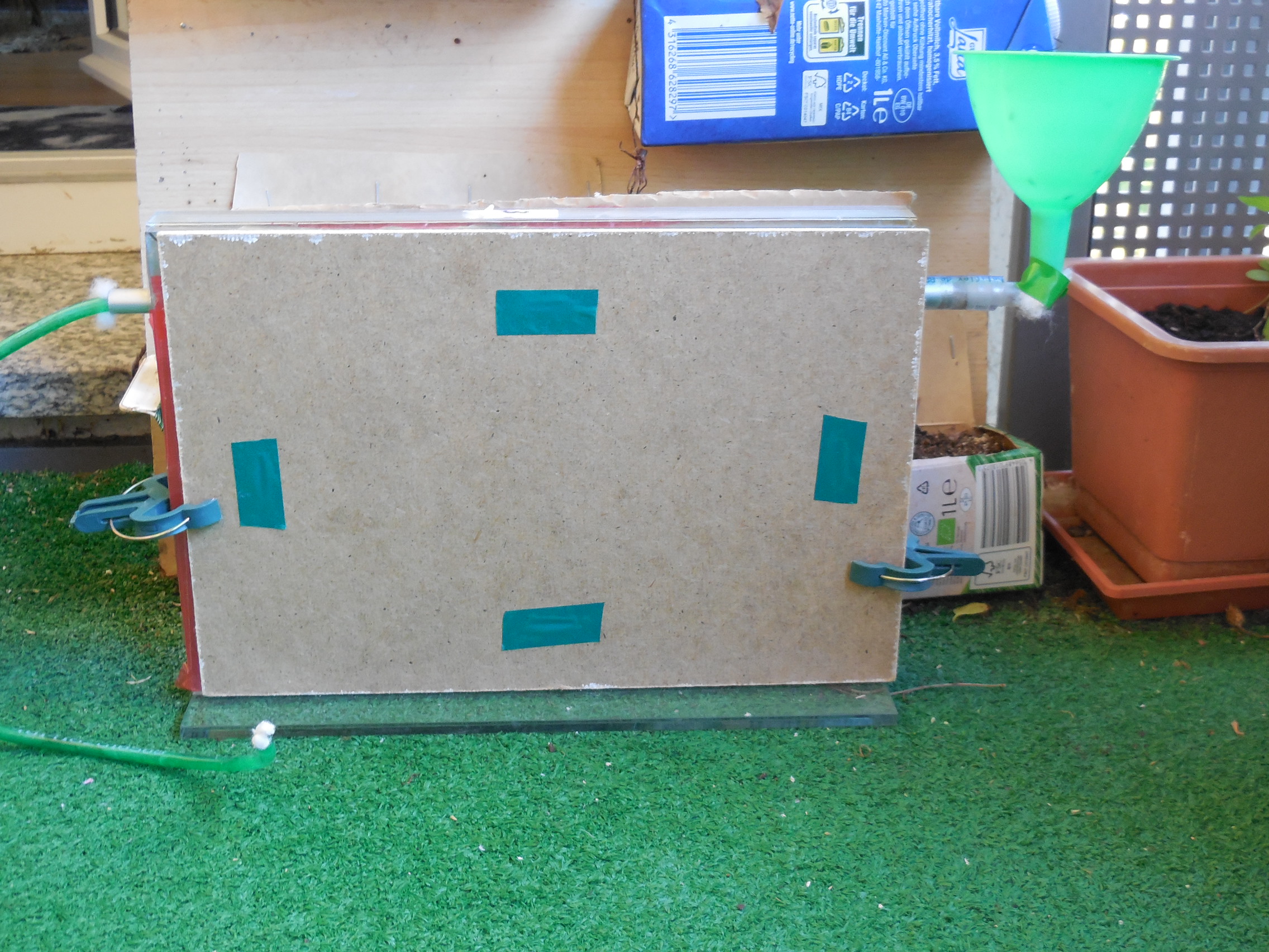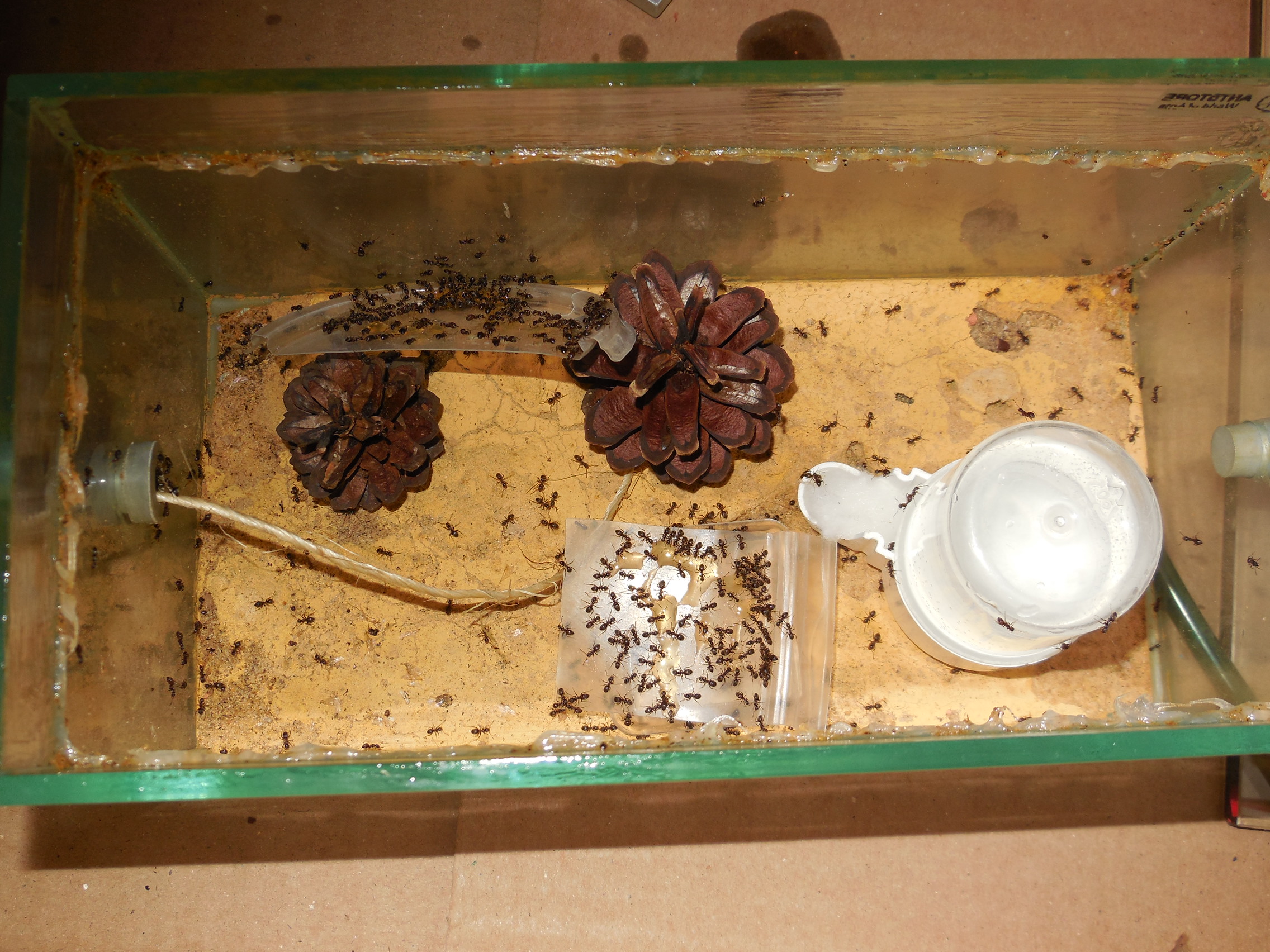 Farm 3 war noch feucht, dafür ist bei der Kontrolle ein ganzer Schwung ausgebüxt. Die Meisten konnte ich wieder einsammeln und in eine andere Farm werfen, bevor auch dort die Insassen begonnen hochzukrabbeln. Den Rest habe ich zunächst nochmals eine halbe Stunde im Kühlschrank "kalt gestellt", in der Hoffnung, sie seien dann träger. Leider hat das Ganze nicht so recht funktioniert. Auch nicht im 2. Anlauf. Es war die alte Leier: für jedes Exemplar, dass in der Farm landet, krabbeln auch welche raus. Dummerweise saßen irgendwann direkt unter allen Decken Ameisen, die beim Öffnen sofort nach oben strebten. Also sowohl die Farmen als auch die Box mit den Ausreißern über Nacht in den Kühlschrank. Am nächsten Tag das Ganze auf den Balkon. In der kühlen Umgebung und unter Zuhilfenahme eines Trichters hat es dann bei minimalen Verlusten geklappt :).