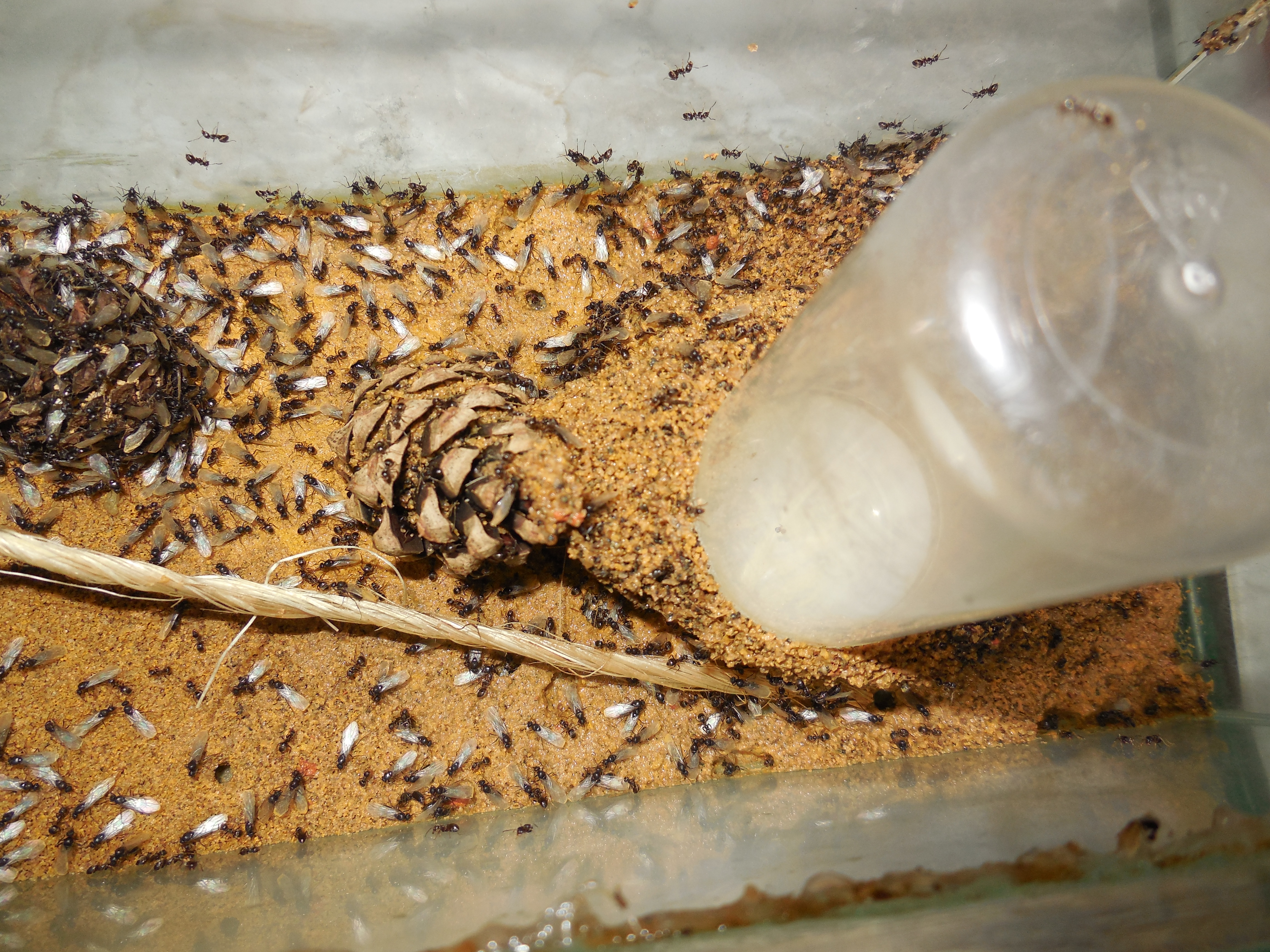 Auch dieses Jahr stellte ich die Kolonie zum Übergang 1 Woche in den Keller (rund 16 Grad). Wie immer zogen sich nicht alle Tiere in die Farmen zurück, sondern ein Trupp Freunde des ewigen Sommers zog weiter in der Arena seine Kreise. Als das übliche Spiel "man hebe den Deckel und setze 1 Ameise in die Farm, während 3 andere entweichen" auszuarten drohte, packte ich diesmal eine Farm auf den sehr kühlen Balkon und koppelte einen Trichter (mit Ölrand als Ausbruchsschutz) an. Dort setzte ich die übrigen Ameisen rein und wartete. Tatsächlich wanderten die meisten nach einiger Zeit in die Farm. Der Rest wurde temperaturbedingt so langsam, dass man ihn mühelos reinschubsen konnte. Wäre ich da mal ein paar Jahre früher drauf gekommen....