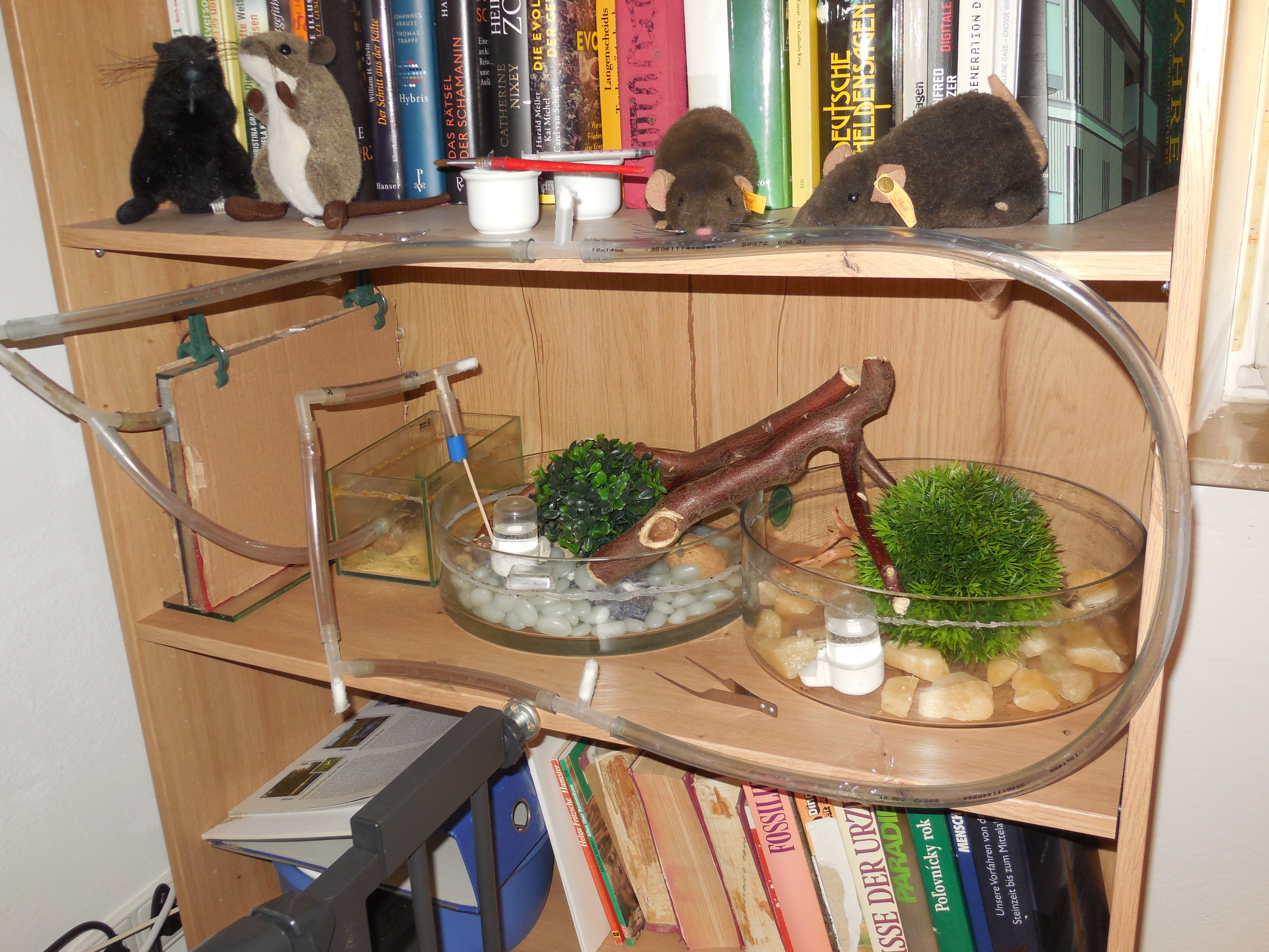 Diesen Winter haben sie das erste Mal komplett auf dem Dachboden verbracht. Von dort ging's logischerweise direkt in die Wohnung, ich glaube seit 28./29.03. Das Motto lautet ein bisschen "back to the roots": 1 Farm, 2 runde Arenen und die kleine eckige, alles in 1 Bücherregal. Von Überfüllung keine Spur. Ich hätte noch Platz für weitere 2 Arenen. Notfalls auch für was Großflächigeres, wäre aber nicht böse, wenn alles so bleibt und die Kolonie tatsächlich aus Altersgründen (und nicht wegen Pflegefehler) weiter schrumpft. In 17 Jahren ändert sich doch einiges in Leben und in einem selbst.