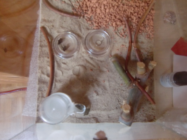 Sie sind wieder zurück in die Farm gezogen. Genau am nächsten Tag trugen sie wieder die Brut rüber und die Gyne lief ganz langsam wieder in die Farm.;) Das beste ist aber, das ich nun in eine Kammer gucken kann. Man sieht dort zwar nicht soooo viel, aber immmerhin konnte ich 2-3 Larven erkennen.:D:D Die Grabarbeiten sind im Kaktus auch wieder eingestellt. Ich werde aber erstmal keine Fotos von der Kammer machen, weil sie vieleicht die Kammer noch ausbauen.