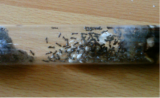 [color="Navy"]Minute 3:[/color] Gewusel von mindestens 15 Ameisen, die hauptsächlich aus der Muschel mit der feuchten Watte rekrutiert wurden. Das ist auch schon die große Veränderung: Mehr Außendienstmitarbeiter und Straßenbildung.