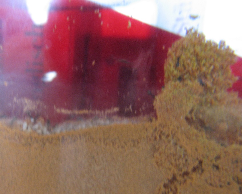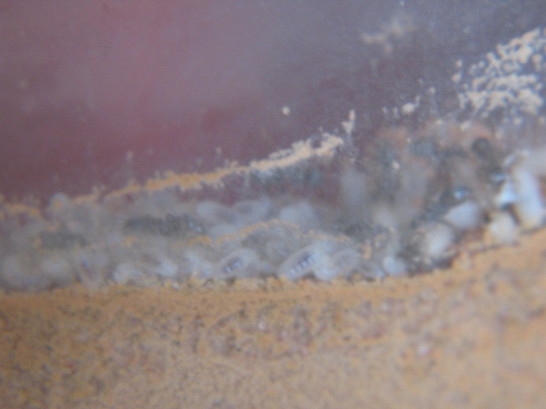 Das RG ist ausgelaufen, weil sie sich durch die Watte gebissen haben. Dabei ist der Tank fast leer gewesen und abschüssig liegt das Glas auch. Ich hab das gar nicht gemerkt, mich aber gewundert warum die alle wie blöd herumlaufen. Nicht, dass sie dieBrut raus getragen hätten, nein, das Wasser!