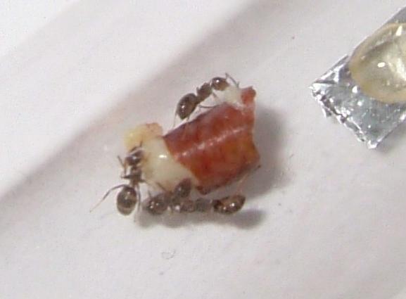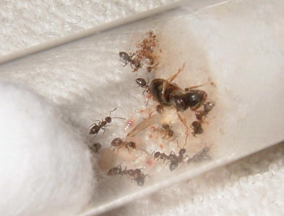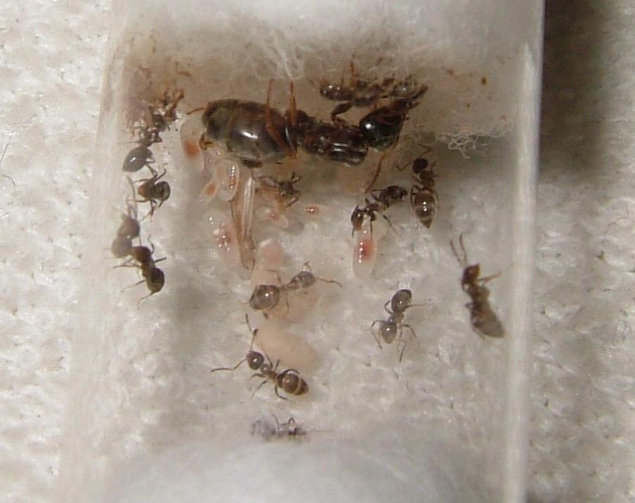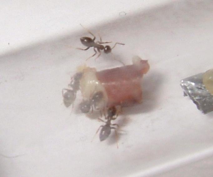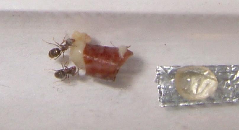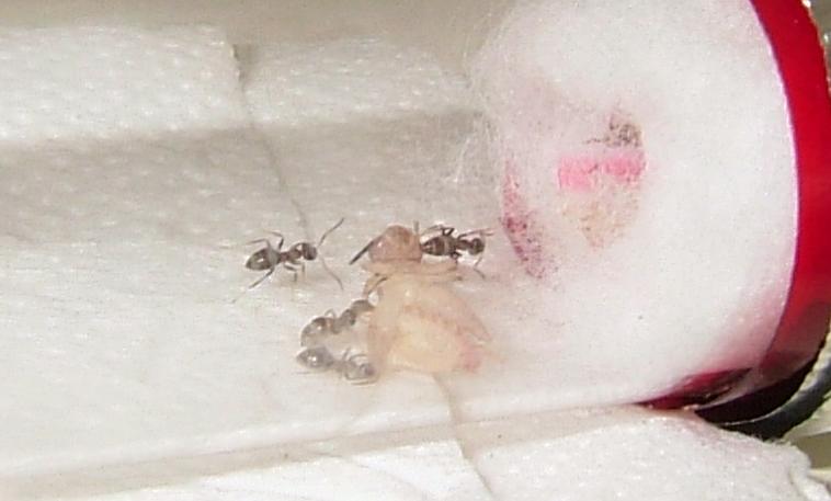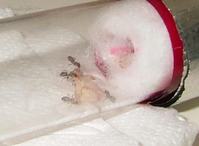 Bei meiner heutigen Raubtierfütterung habe ich den Kleinen ca. ein gutes 1/2 einer kürzlich verpuppten und im Kühlschrank gelagerten Pinky-Made (natürlich komplett, den Rest haben, zusammen mit einer Stubenfliege meine Camponotus ligniperda bekommen) angeboten, die wie man auf den Bilder sieht gut angenommen wird.