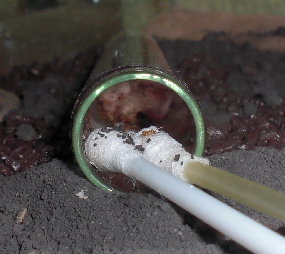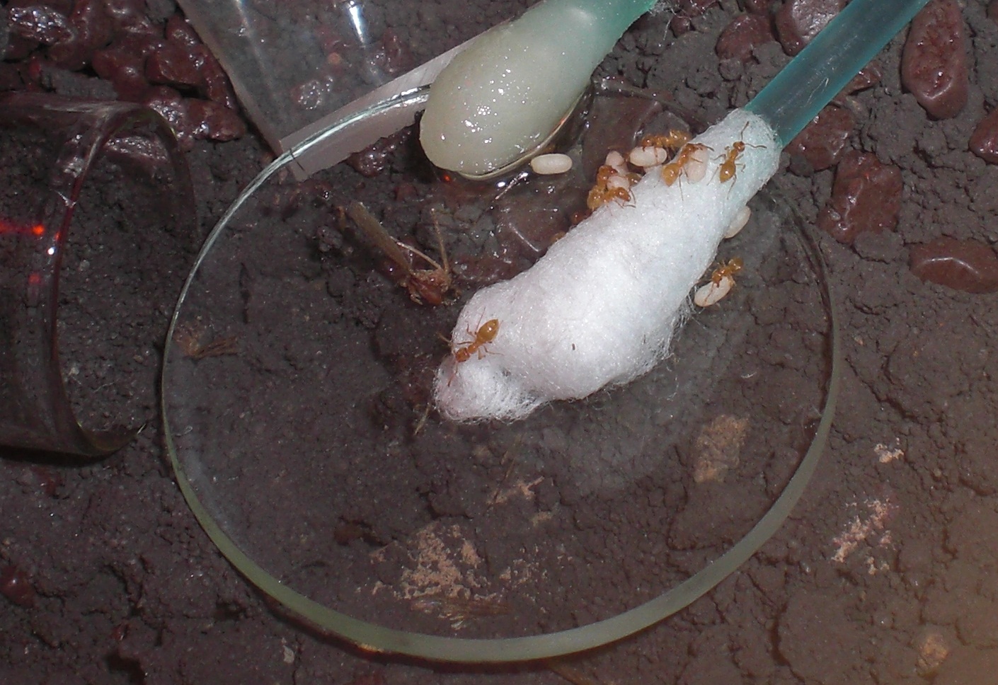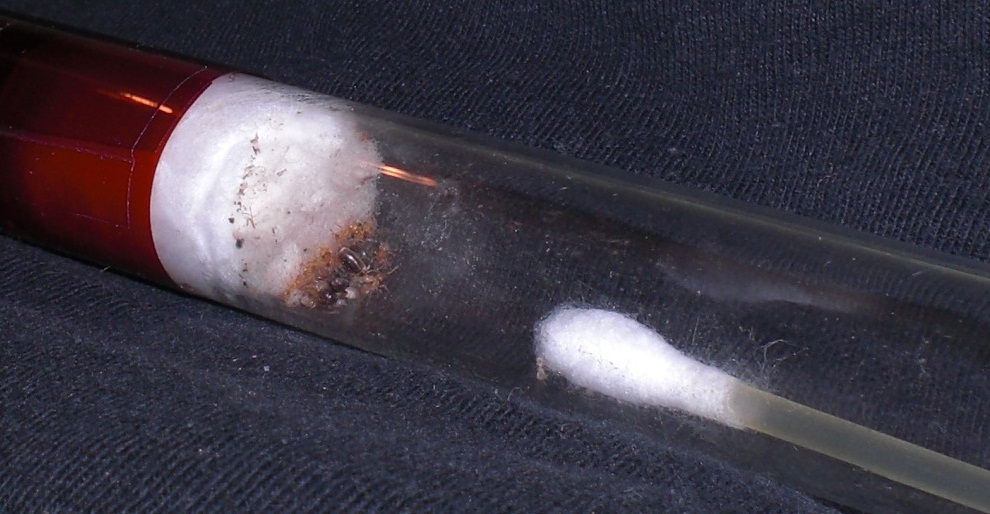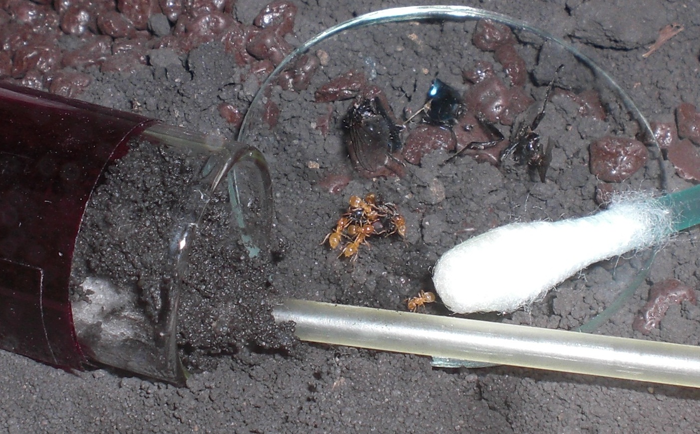 Datum: 14.05.10 Vor zwei Tagen legte ich ein Wattestäbchen mit Honig in die „Mini-Arena“. Dieses lockte heute eine Pygmäe an. Nachdem ich diese ein wenig begutachtete legte ich eine Mücke hinzu, die bisher jedoch nicht von Interesse war (siehe Bild 11).