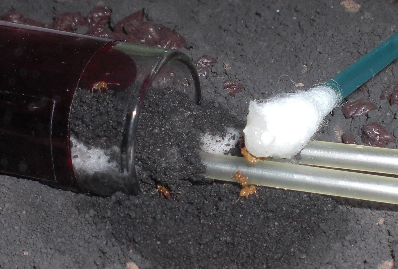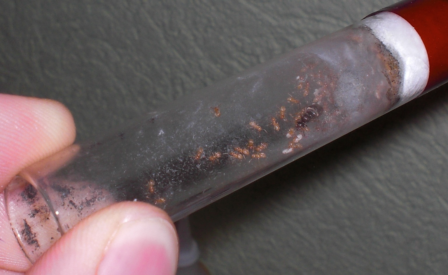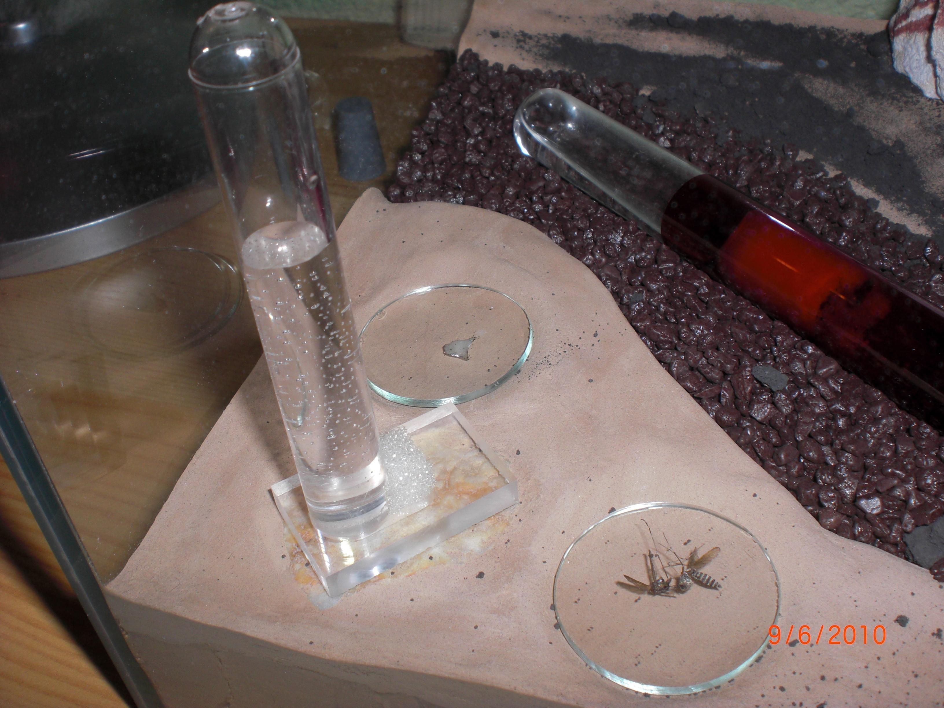 Datum: 14.05.10 Vor zwei Tagen legte ich ein Wattestäbchen mit Honig in die „Mini-Arena“. Dieses lockte heute eine Pygmäe an. Nachdem ich diese ein wenig begutachtete legte ich eine Mücke hinzu, die bisher jedoch nicht von Interesse war (siehe Bild 11).