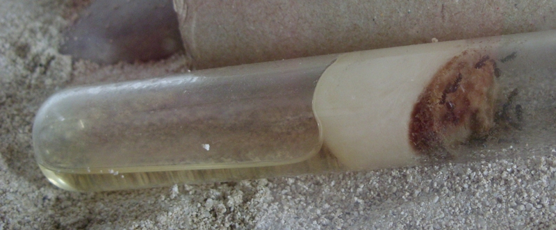Die beiden Reagenzgläser. Außerdem gibt das Bild einen kleinen Eindruck von der Koloniegröße.