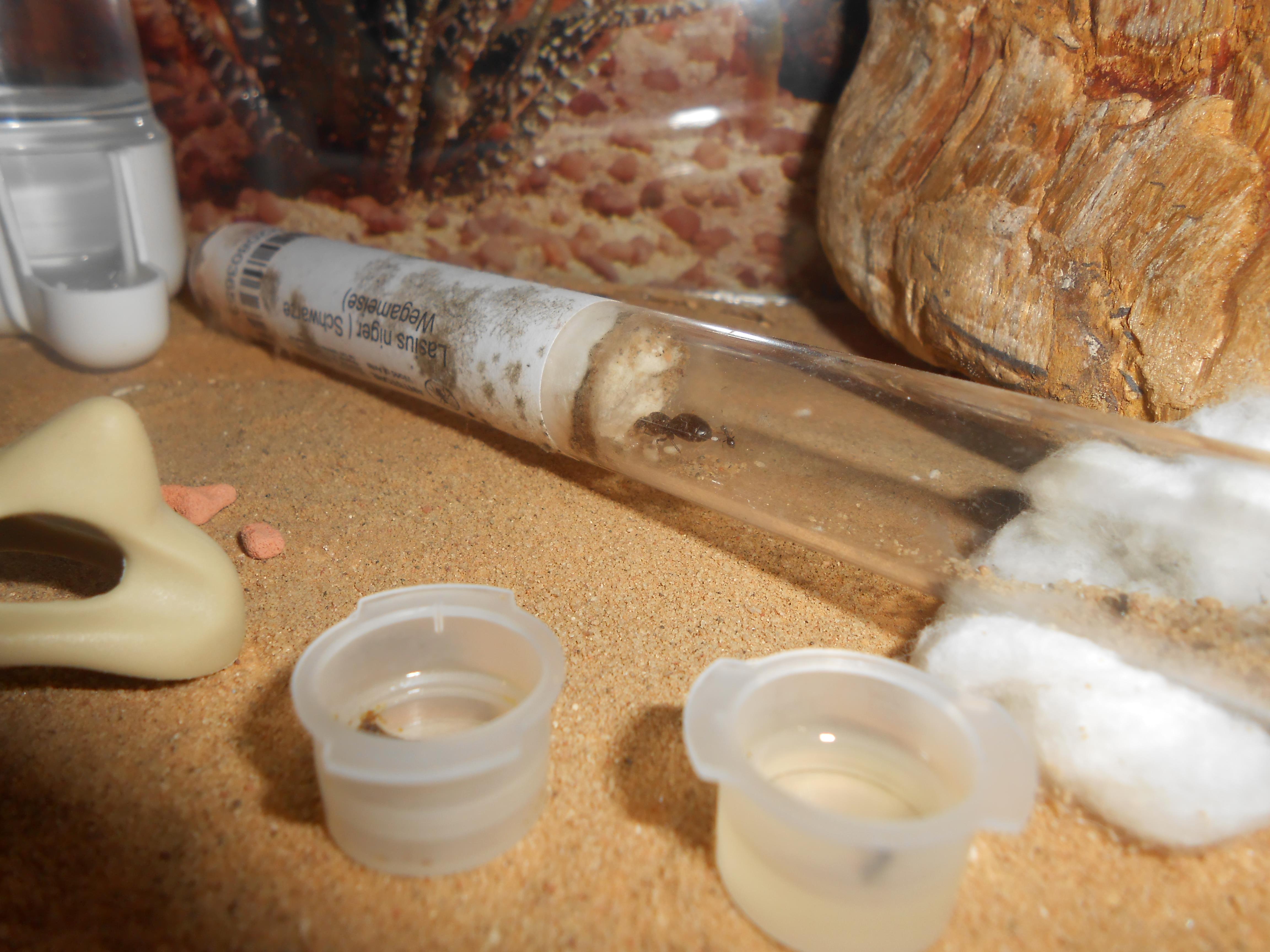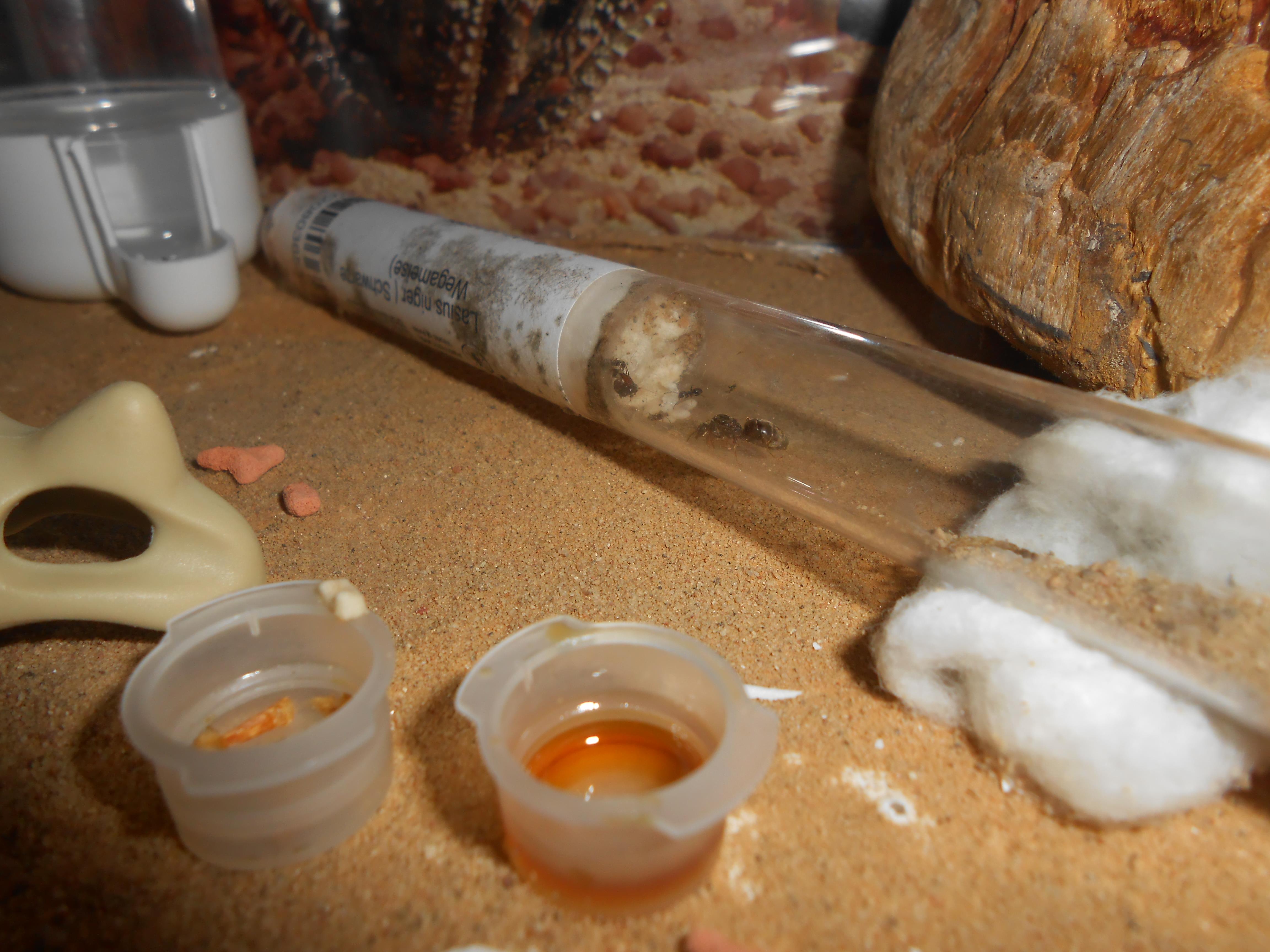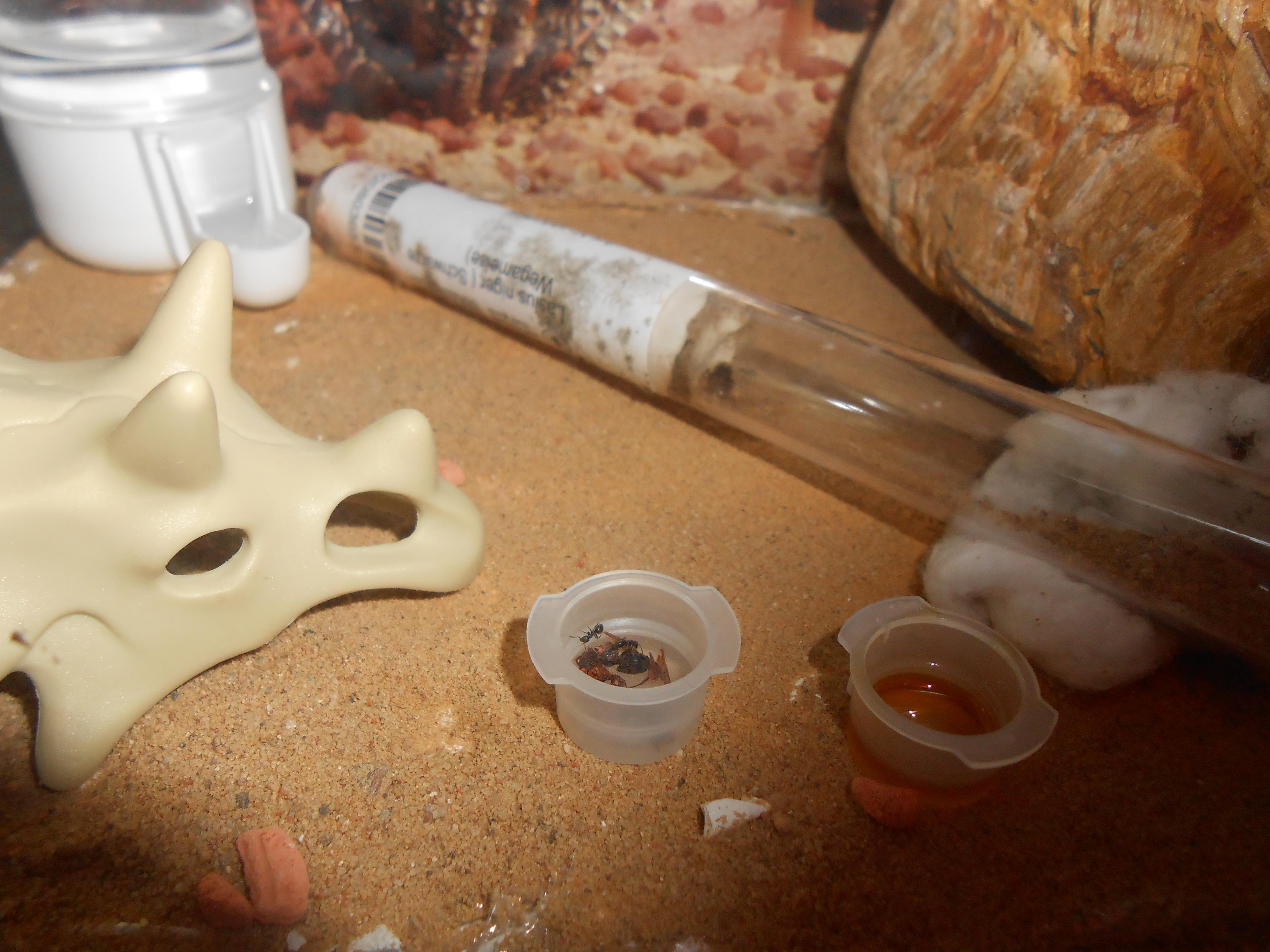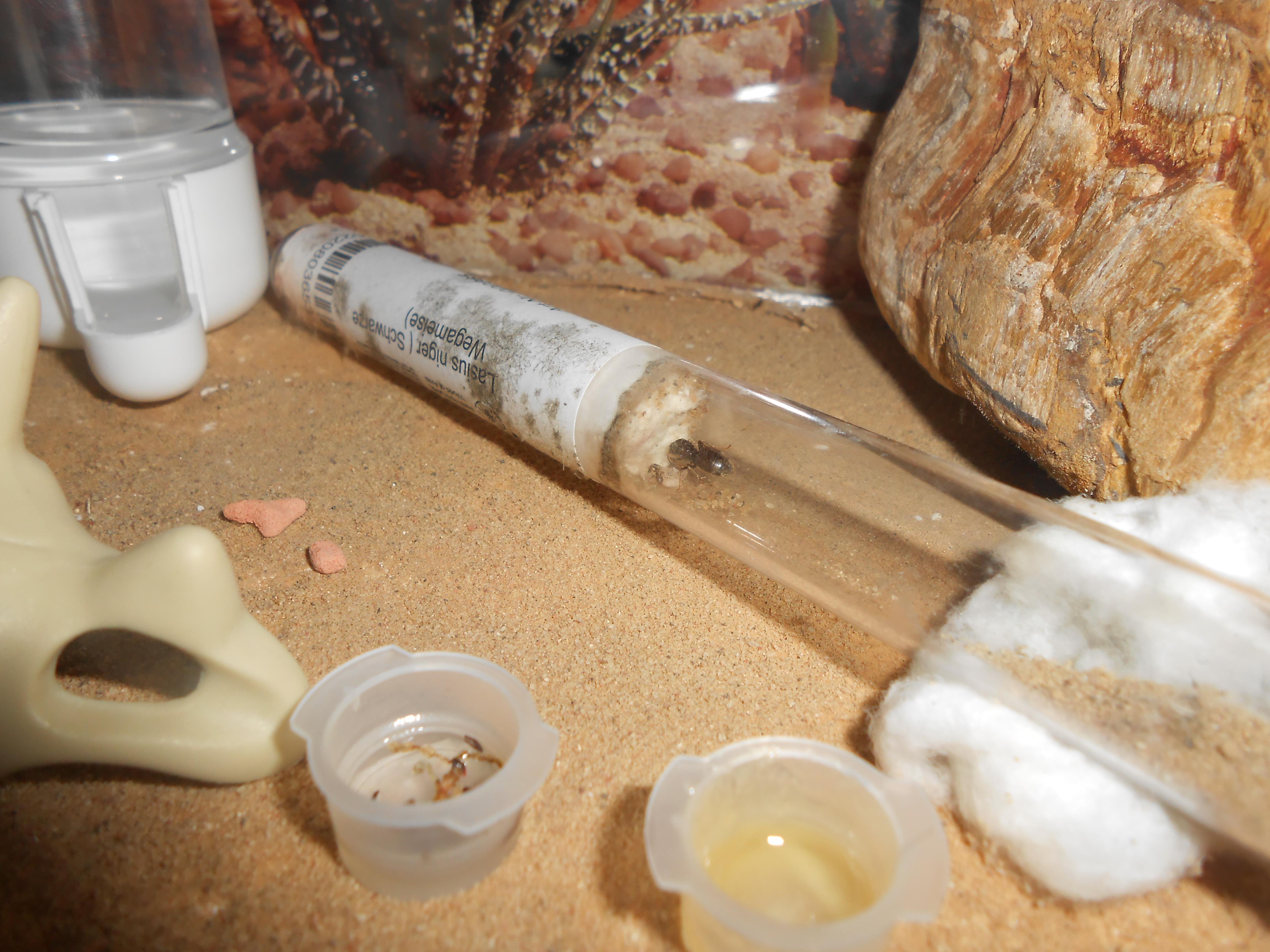 Der Akazienhonig, den ich ihnen seit lĂ€ngerer Zeit anbiete, wurde recht gut angenommen. Ich will aber mal testen, wie die Ameisen auf BlĂŒtenhonig reagieren und habe den Honig deshalb heute gewechselt. Bis jetzt haben sie noch nicht probiert. Anders bei den MĂŒckenlarven, die ich ihnen gleichzeitig in die Arena gelegt habe. Eine Arbeierin hat sich sofort darauf gestĂŒrzt und ist nach Begutachtung der "Beute" ins RG zurĂŒck gestĂŒrmt. Darauf hin sind alle vier Arbeiterinnen losgezogen und nach kurzer Zeit lag auch schon die erste MĂŒckenlarve bei der