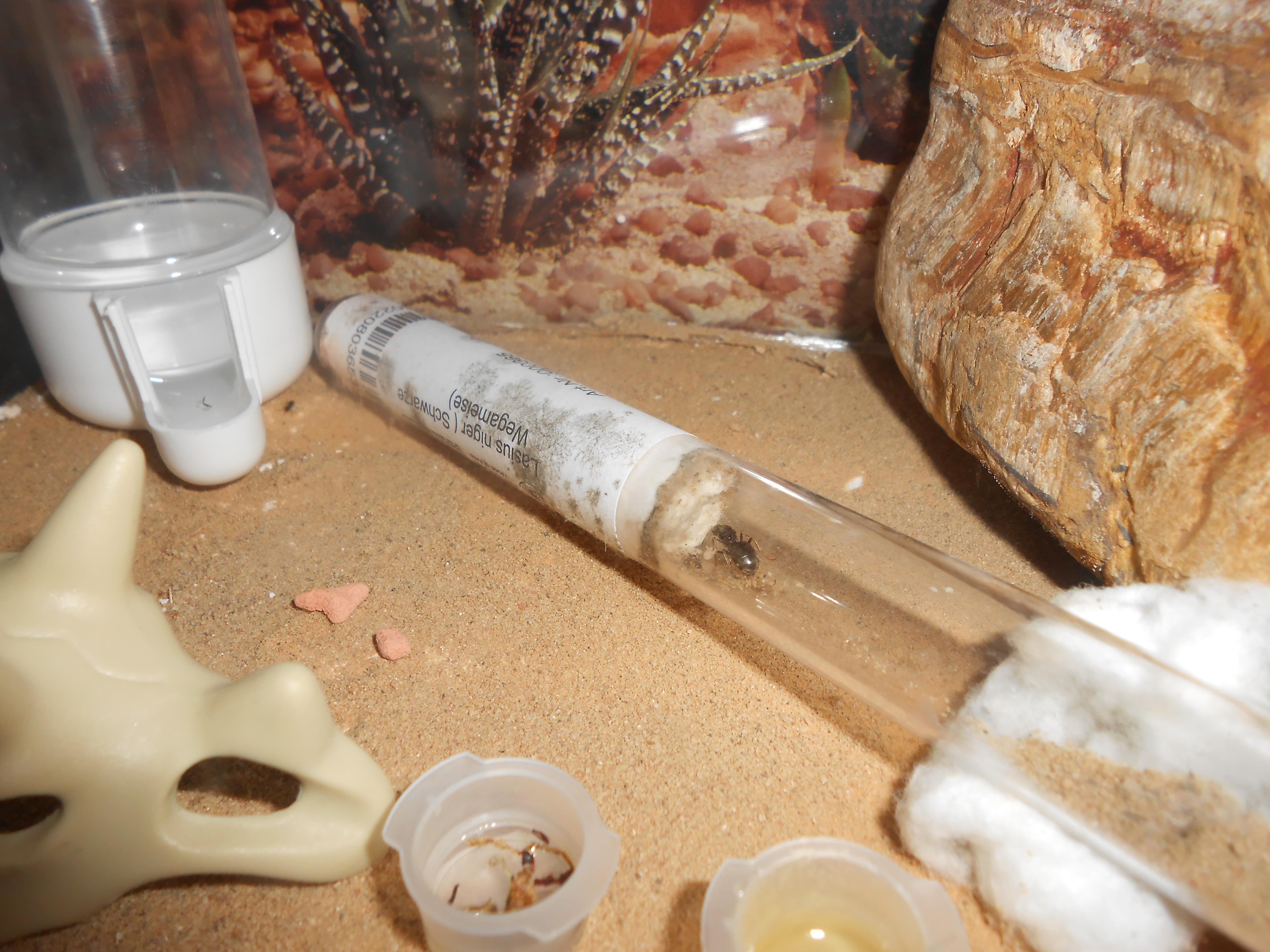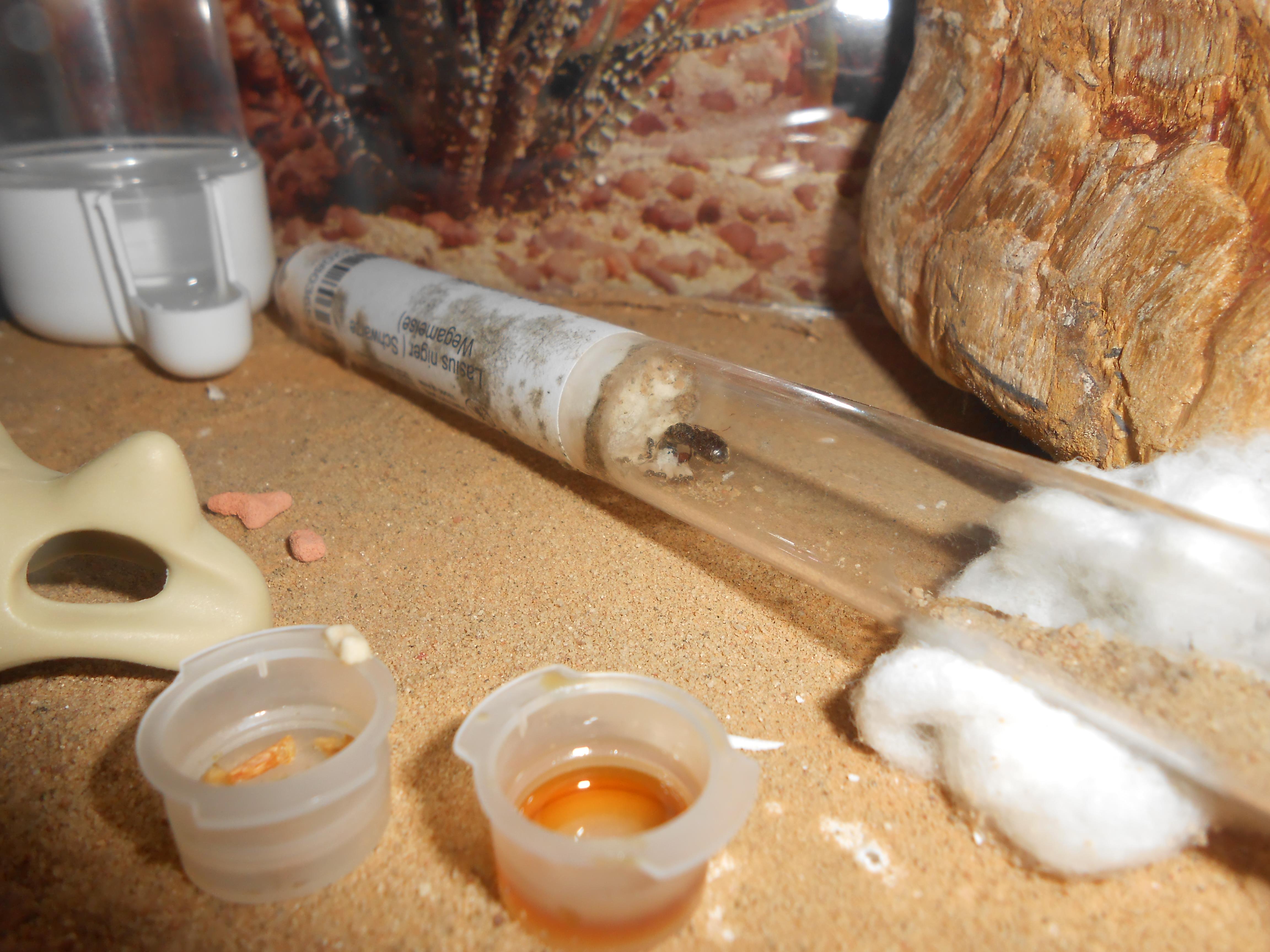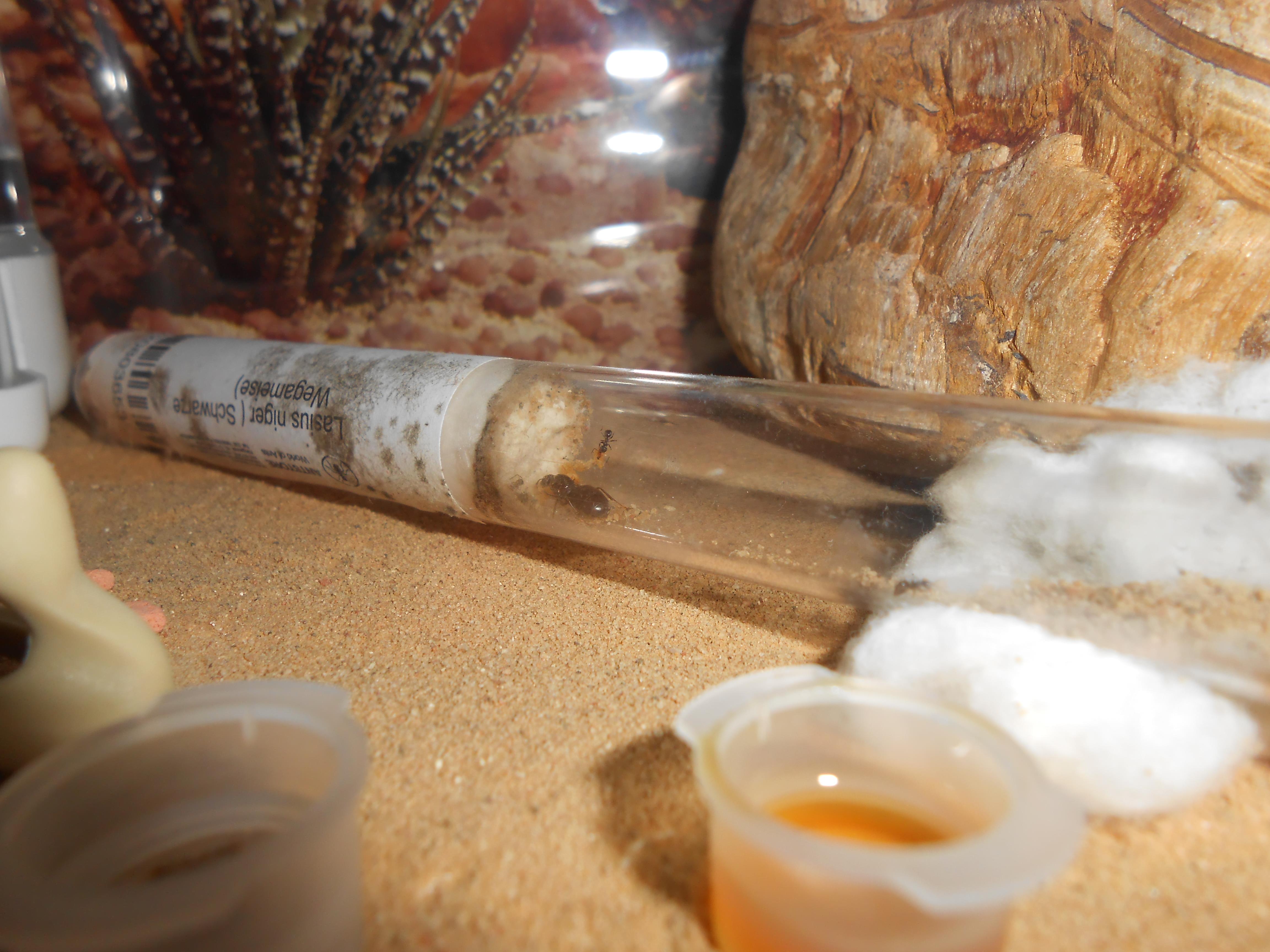 Der Akazienhonig, den ich ihnen seit lĂ€ngerer Zeit anbiete, wurde recht gut angenommen. Ich will aber mal testen, wie die Ameisen auf BlĂŒtenhonig reagieren und habe den Honig deshalb heute gewechselt. Bis jetzt haben sie noch nicht probiert. Anders bei den MĂŒckenlarven, die ich ihnen gleichzeitig in die Arena gelegt habe. Eine Arbeierin hat sich sofort darauf gestĂŒrzt und ist nach Begutachtung der "Beute" ins RG zurĂŒck gestĂŒrmt. Darauf hin sind alle vier Arbeiterinnen losgezogen und nach kurzer Zeit lag auch schon die erste MĂŒckenlarve bei der