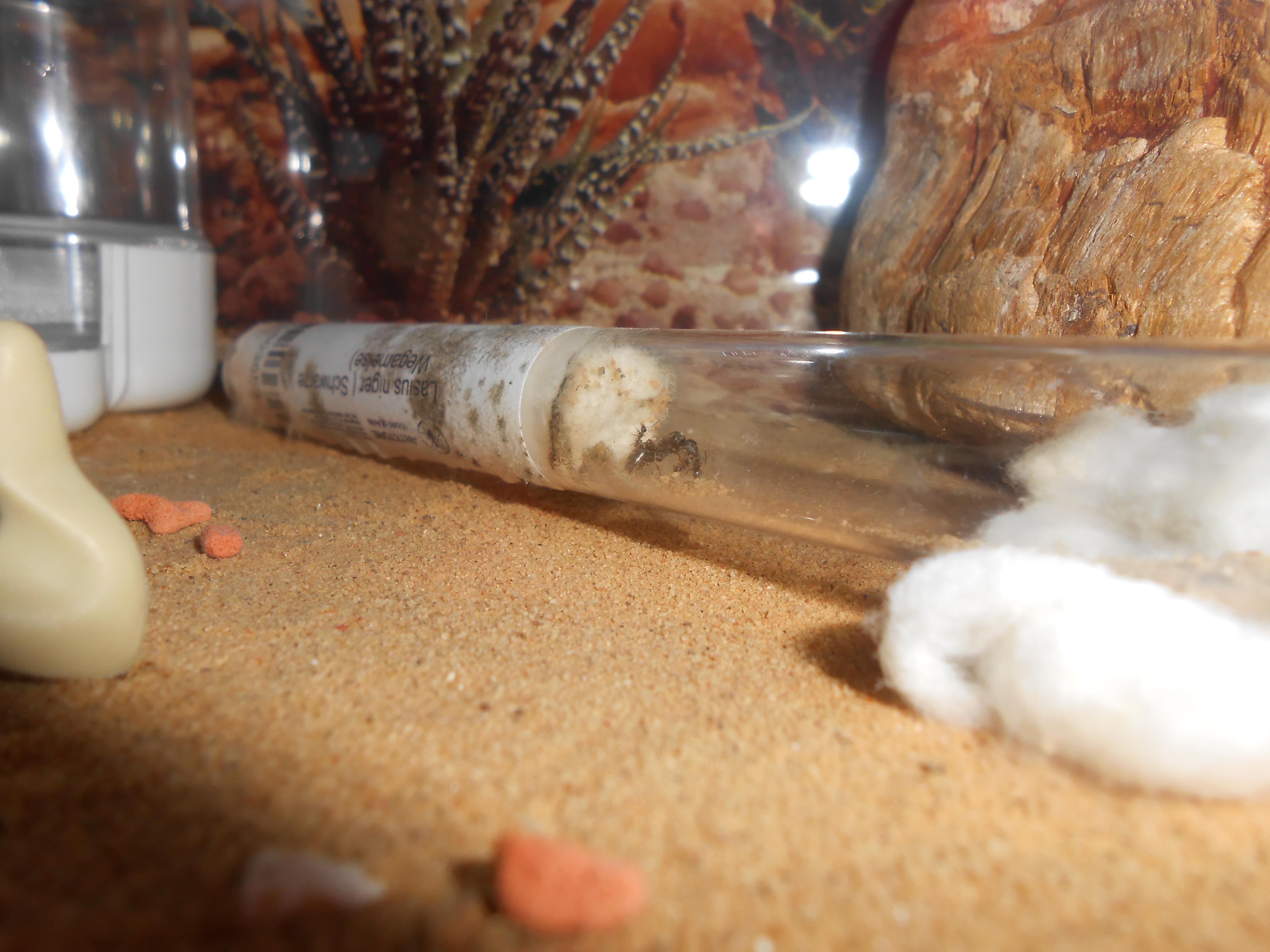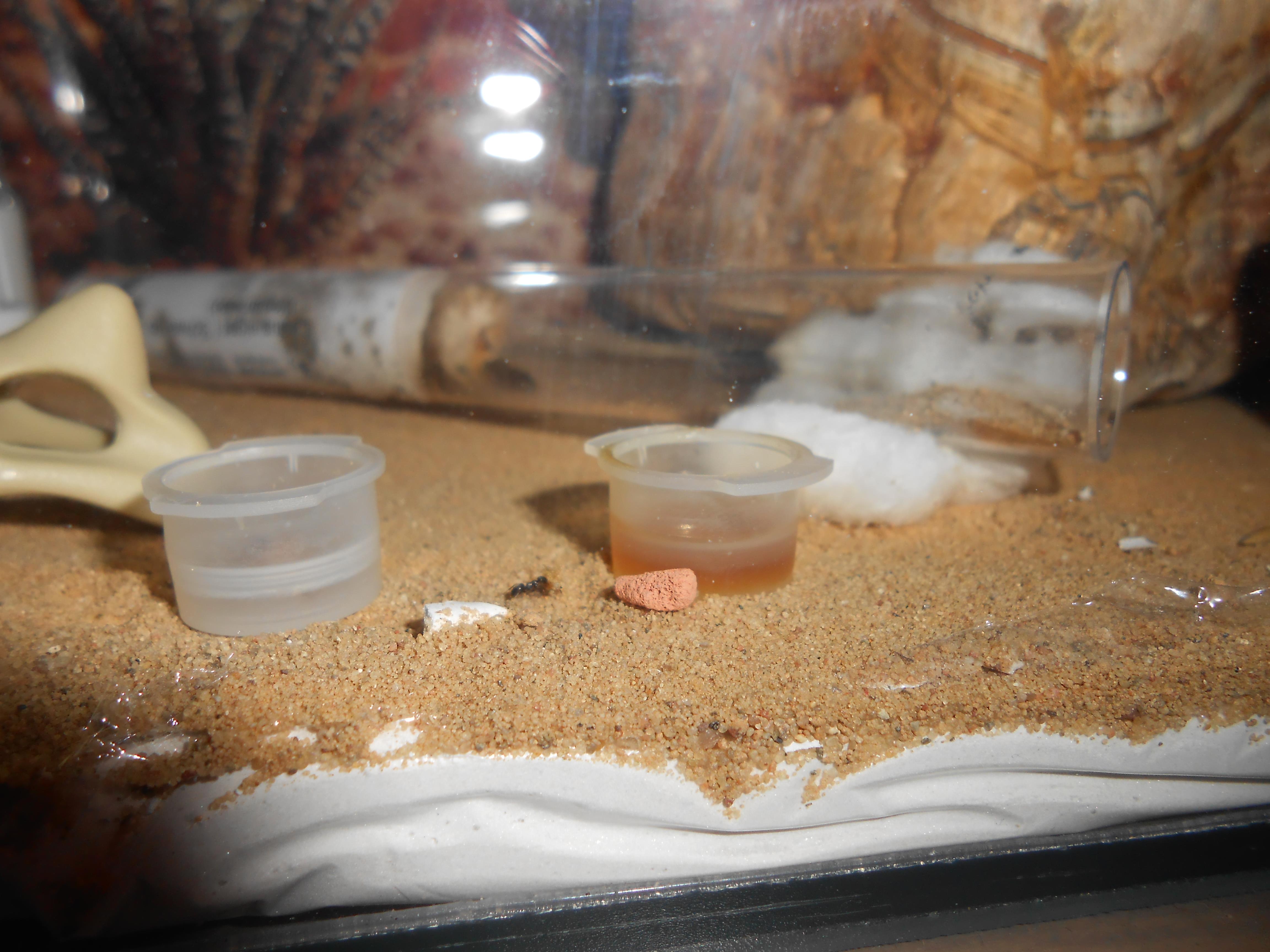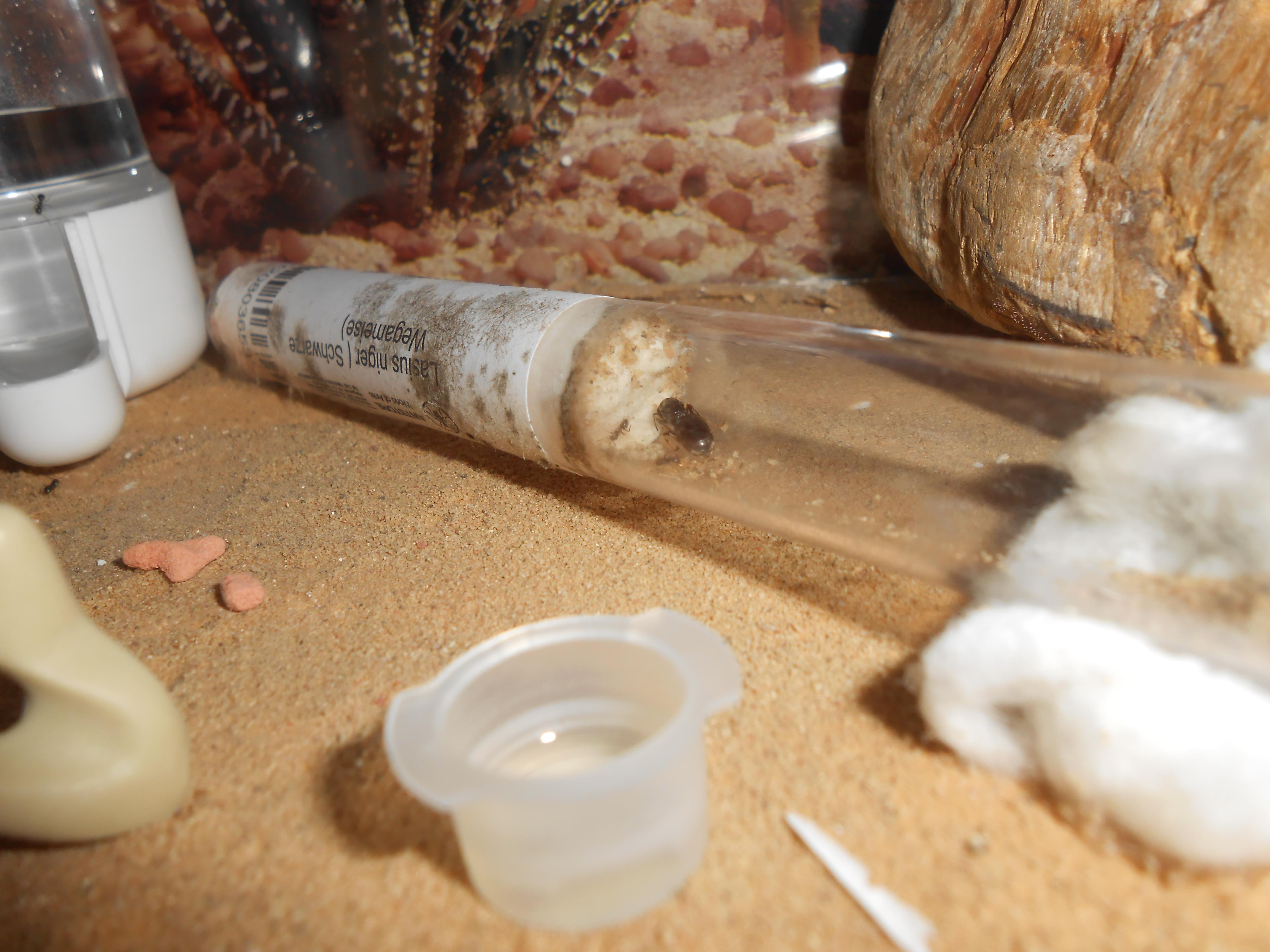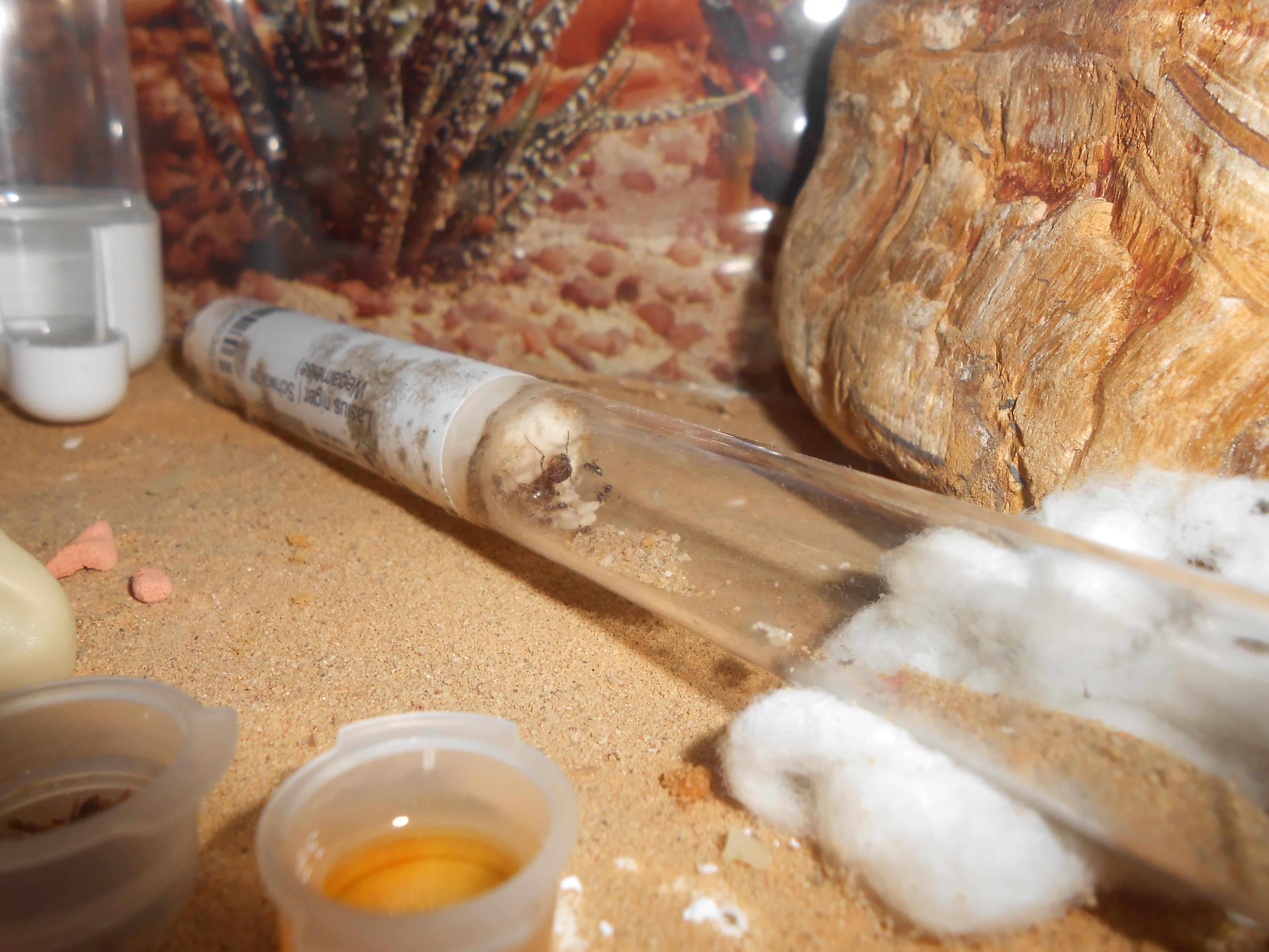 Der Akazienhonig, den ich ihnen seit lĂ€ngerer Zeit anbiete, wurde recht gut angenommen. Ich will aber mal testen, wie die Ameisen auf BlĂŒtenhonig reagieren und habe den Honig deshalb heute gewechselt. Bis jetzt haben sie noch nicht probiert. Anders bei den MĂŒckenlarven, die ich ihnen gleichzeitig in die Arena gelegt habe. Eine Arbeierin hat sich sofort darauf gestĂŒrzt und ist nach Begutachtung der "Beute" ins RG zurĂŒck gestĂŒrmt. Darauf hin sind alle vier Arbeiterinnen losgezogen und nach kurzer Zeit lag auch schon die erste MĂŒckenlarve bei der