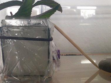 Das Haargummi hält die Folie dichter am Behälter als Klebeband oder Adhäsion und Kohäsion. Zur Erleichterung gibt es noch eine Brücke aus Zahnstochern.