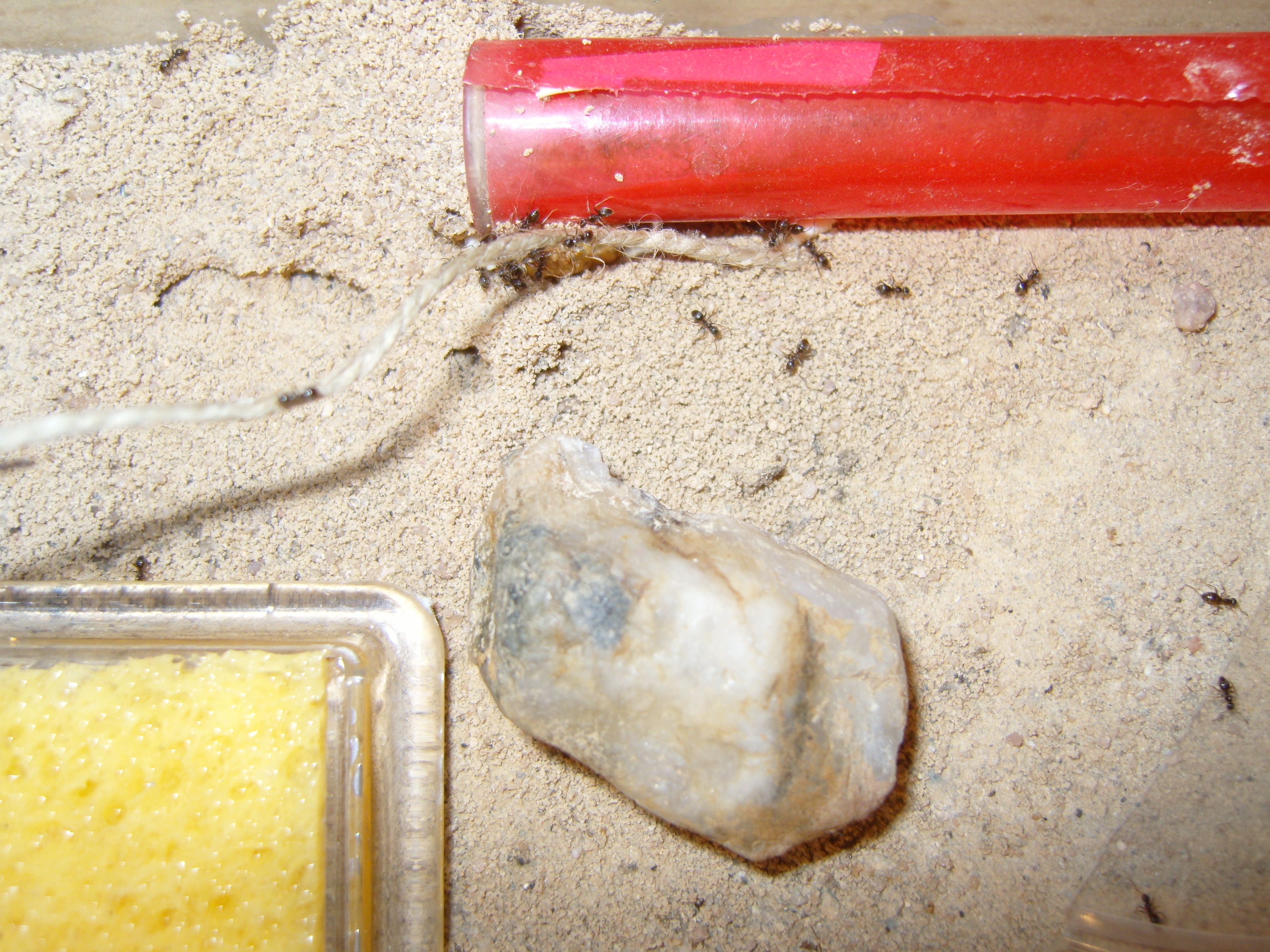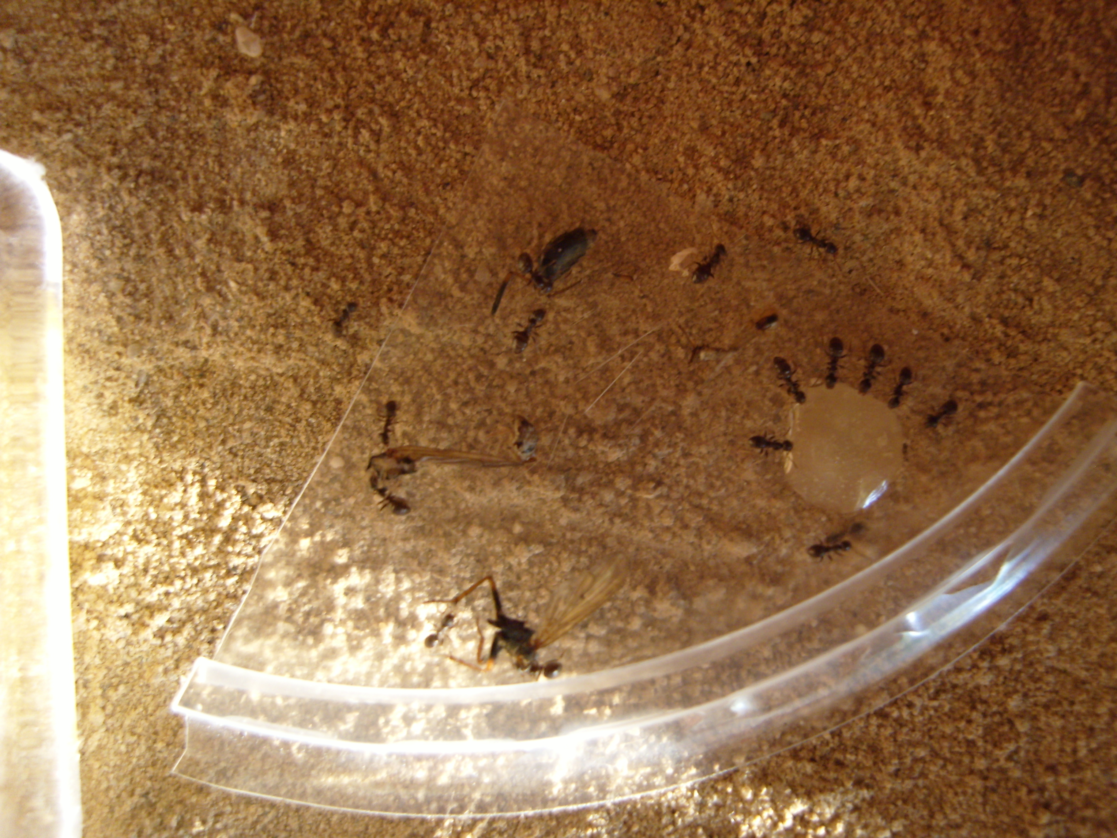 Königin ist wieder zu sehen. Der Außendienst wurde mittlerweile vergrößert. Nun sind teilweise bis zu 3 Tieren draußen, auch tagsüber bzw. bei Licht. Zu fressen gibt's Blattläuse und Spinnen ca. alle 3 Tage. Dazu natürlich Honig. Die Spinnen muss ich dabei "anstechen", da sie sonst teilweise uninteressant sind.