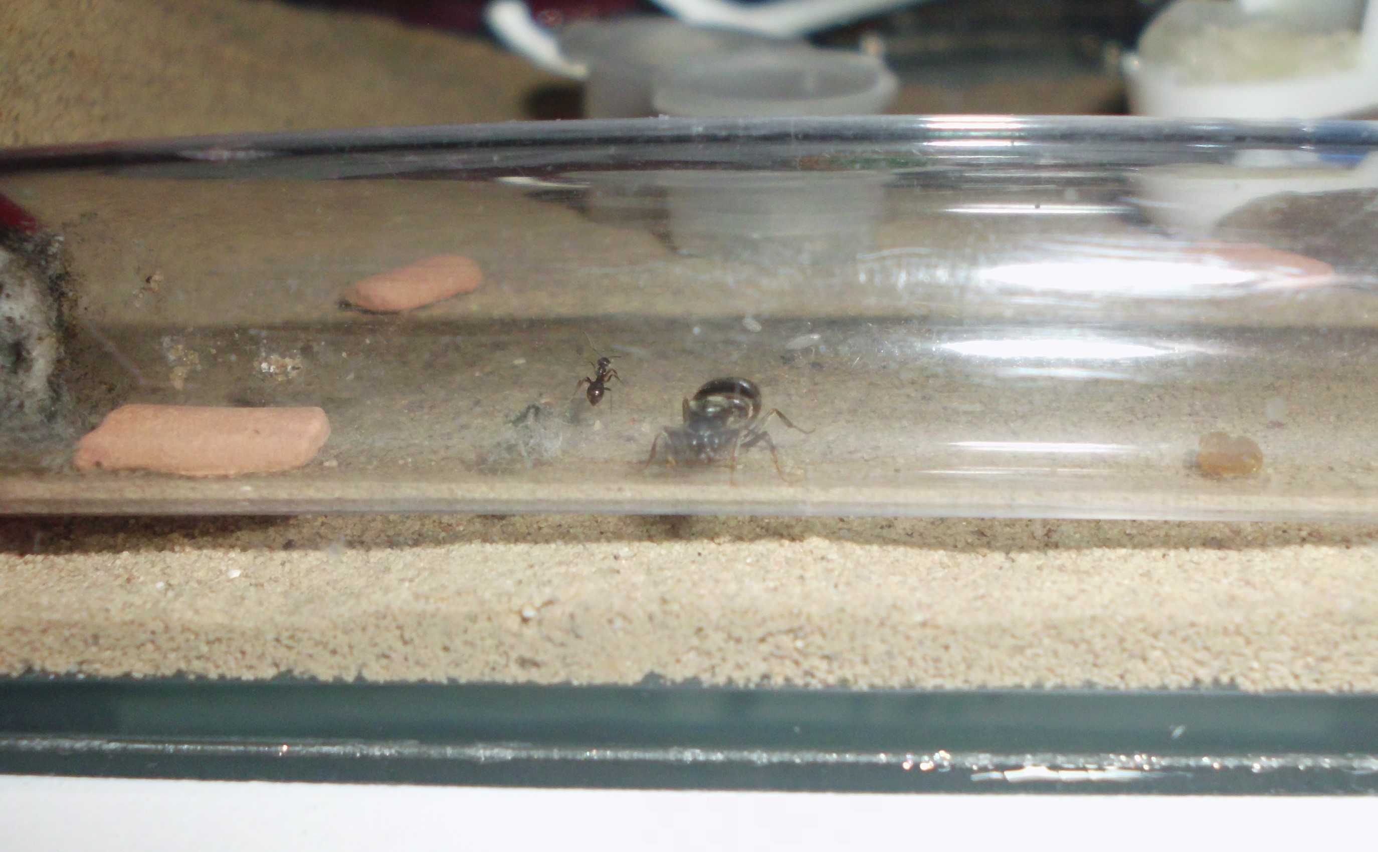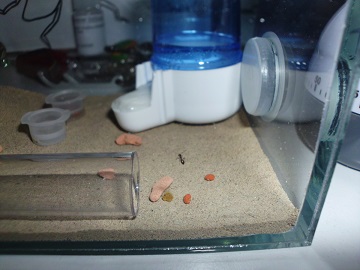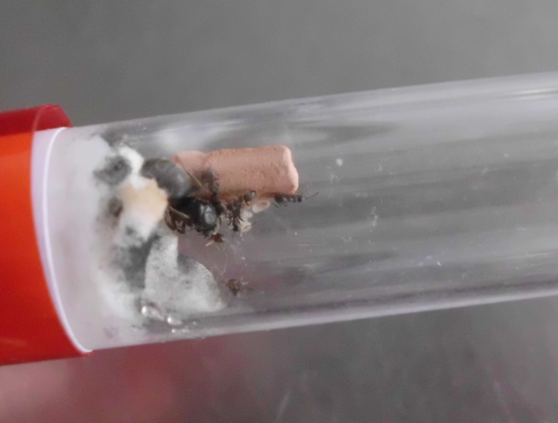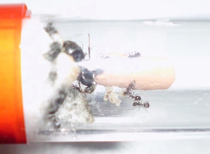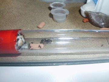 Die Ameisen sitzen noch immer auf und neben dem Seramissteinchen. Die