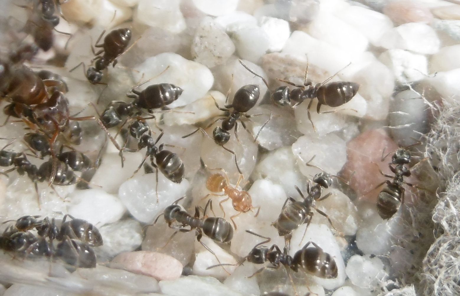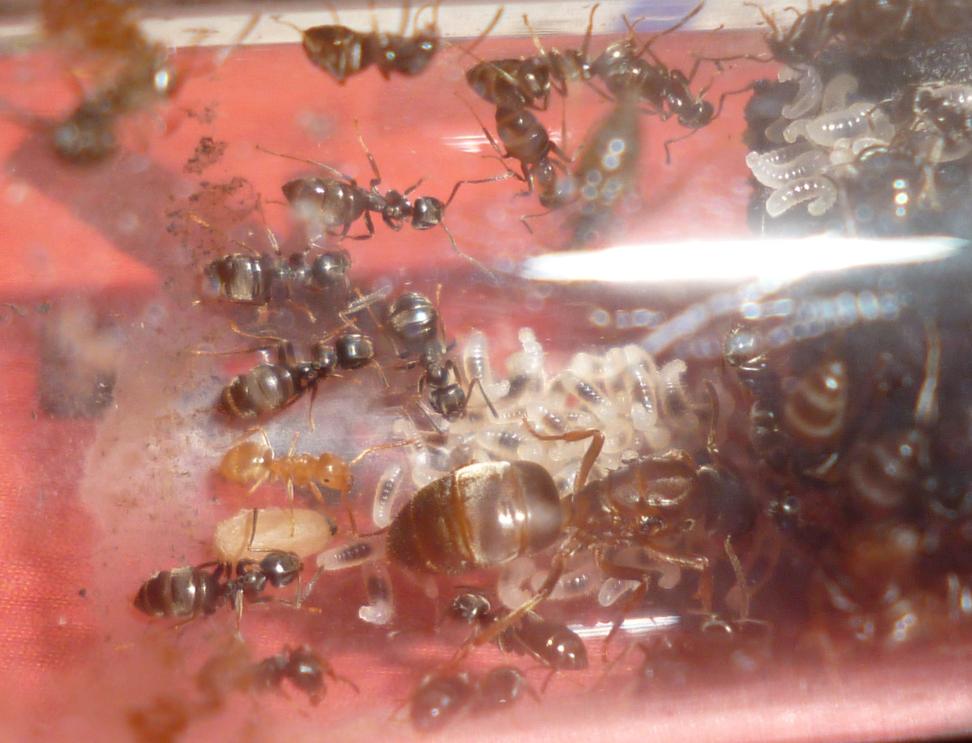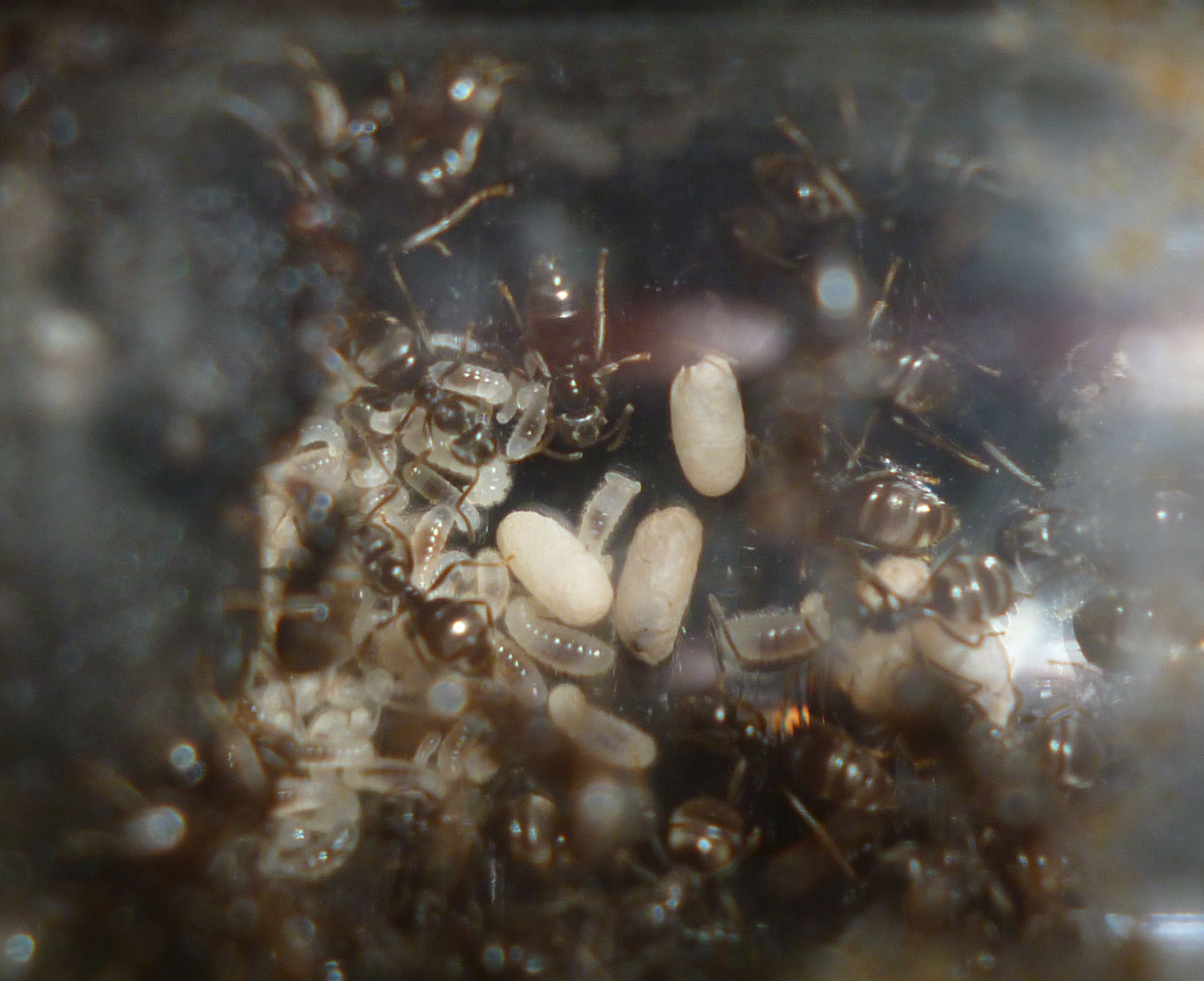 Die Wirtsarbeiterinnen nehmen in ihrer Zahl langsam aber sicher ab. Immer wieder sterben einzelne Arbeiterinnen, vermutlich an Altersschwäche. Es wird allerhöchste Zeit, dass die erste Welle von Schattenameisen schlüpft, sonst ist bald niemand mehr da um sich um die Nahrungsversorgung zu kümmern. Es sind aber noch 30+ Wirtsarbeiterinnen, trotzdem macht mich dieses stetige Arbeiterinnensterben nervös, wegen der gleichzeitigen Stagnation bei der Brutentwicklung.