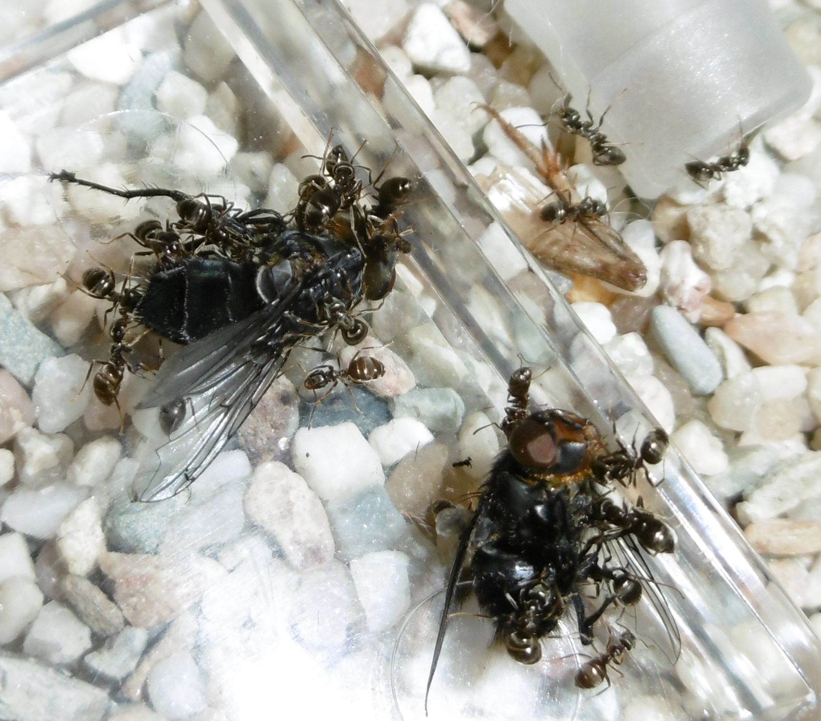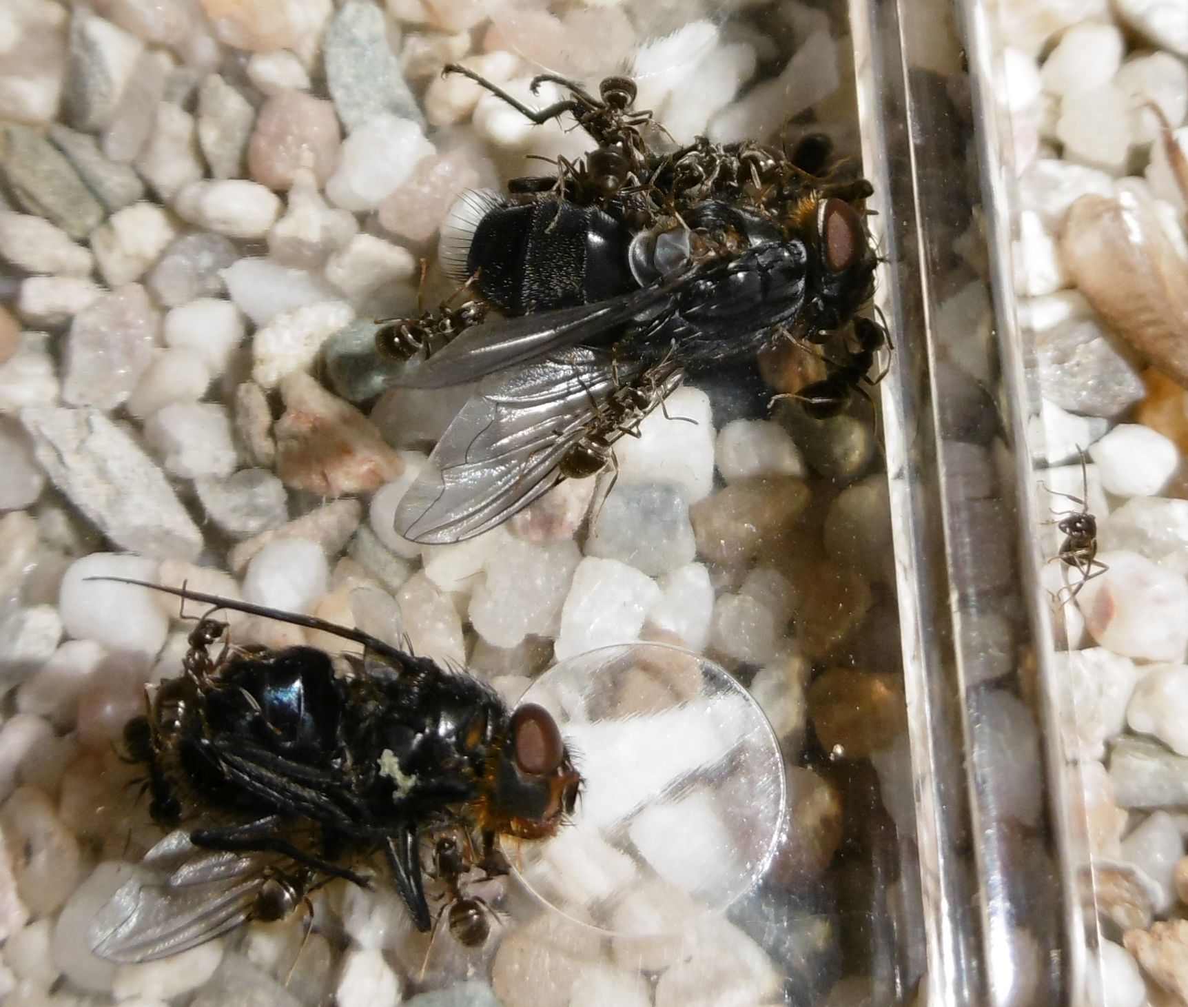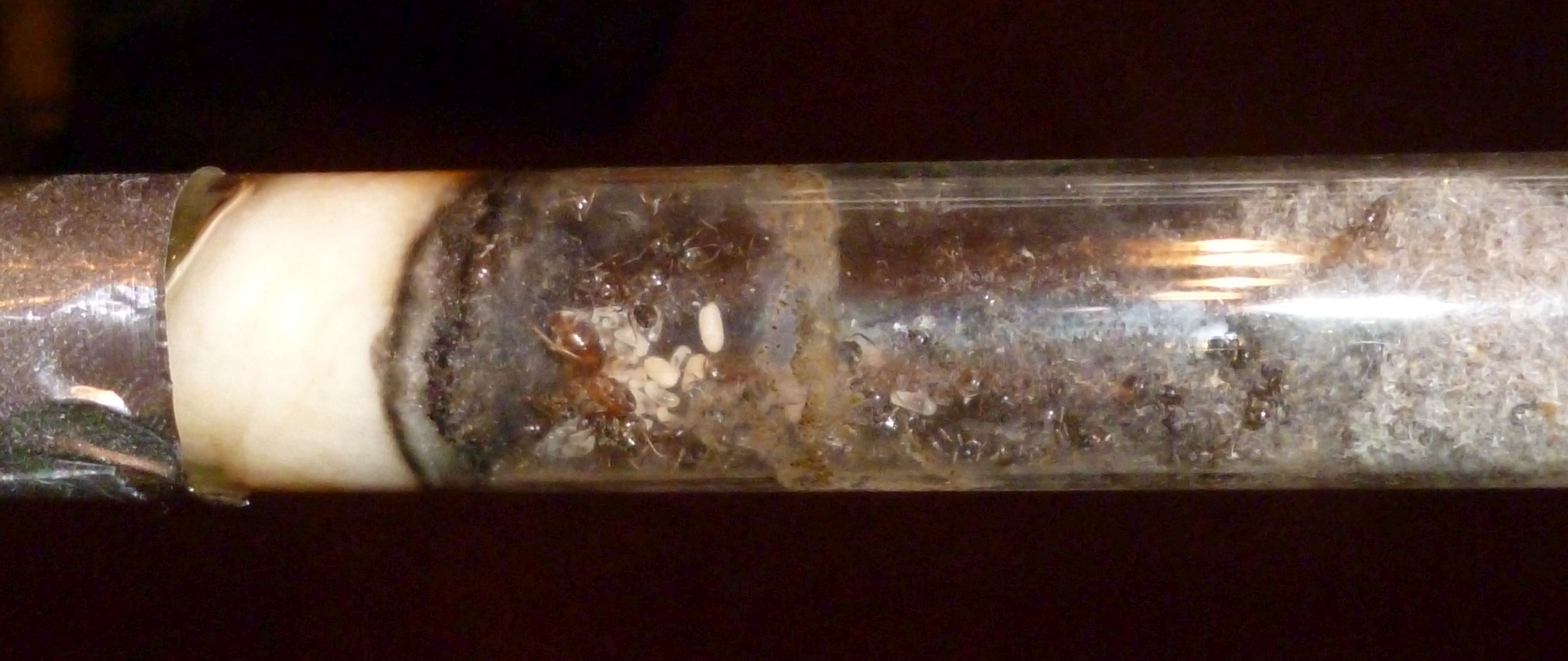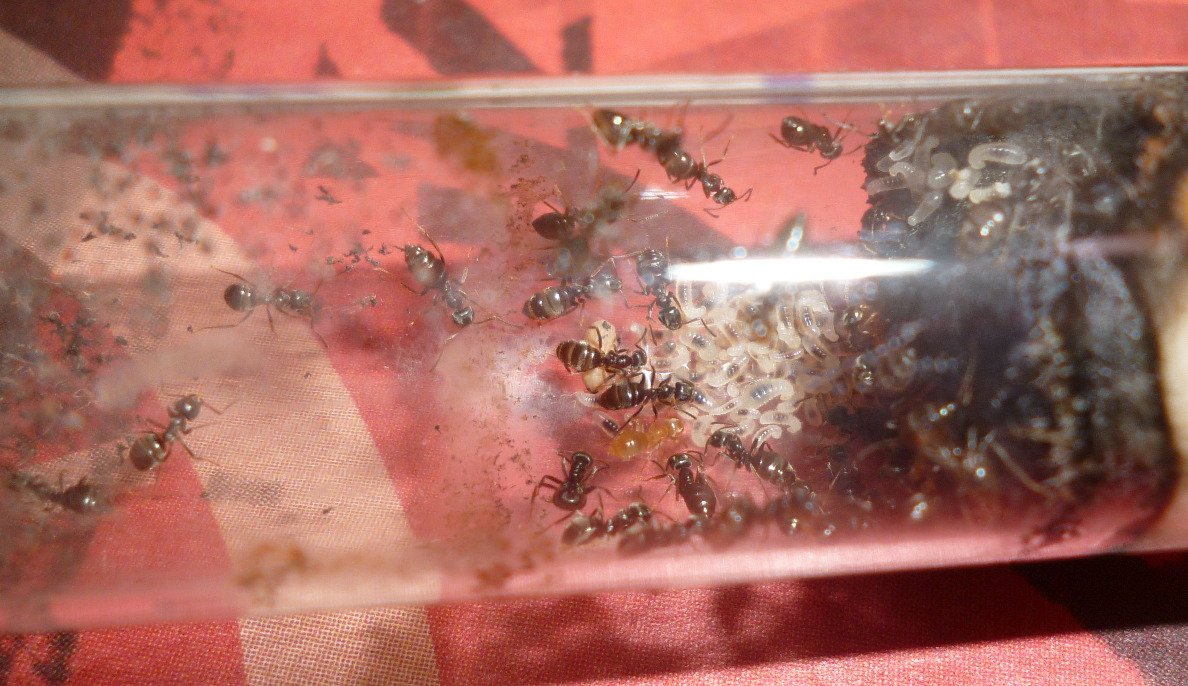 Die Wirtsarbeiterinnen nehmen in ihrer Zahl langsam aber sicher ab. Immer wieder sterben einzelne Arbeiterinnen, vermutlich an Altersschwäche. Es wird allerhöchste Zeit, dass die erste Welle von Schattenameisen schlüpft, sonst ist bald niemand mehr da um sich um die Nahrungsversorgung zu kümmern. Es sind aber noch 30+ Wirtsarbeiterinnen, trotzdem macht mich dieses stetige Arbeiterinnensterben nervös, wegen der gleichzeitigen Stagnation bei der Brutentwicklung.