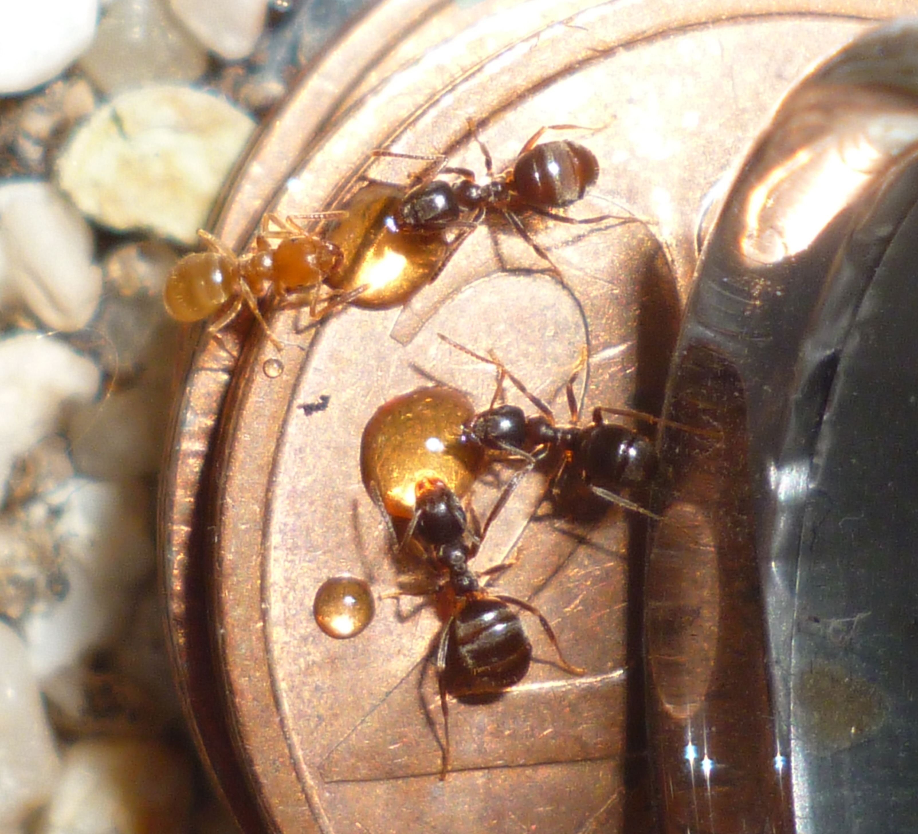 Zur Nestsituation ist folgendes zu sagen, der Wassertank des RG-Nests ist leer gewesen. Eigentlich kein Beinbruch, denn ein zweites RG liegt direkt daneben und eine Wassertränke gibt es ja auch noch. Ein Teil der Wirtsarbeiterinnen hält sich im zweiten RG auf und ich werde das Gefühl nicht los, dass sie die enge Bindung zur Kolonie verloren haben und ihr eigenes Lager aufschlagen. Das würde bedeuten, sie versorgen die Hauptkolonie nicht mit Wasser.