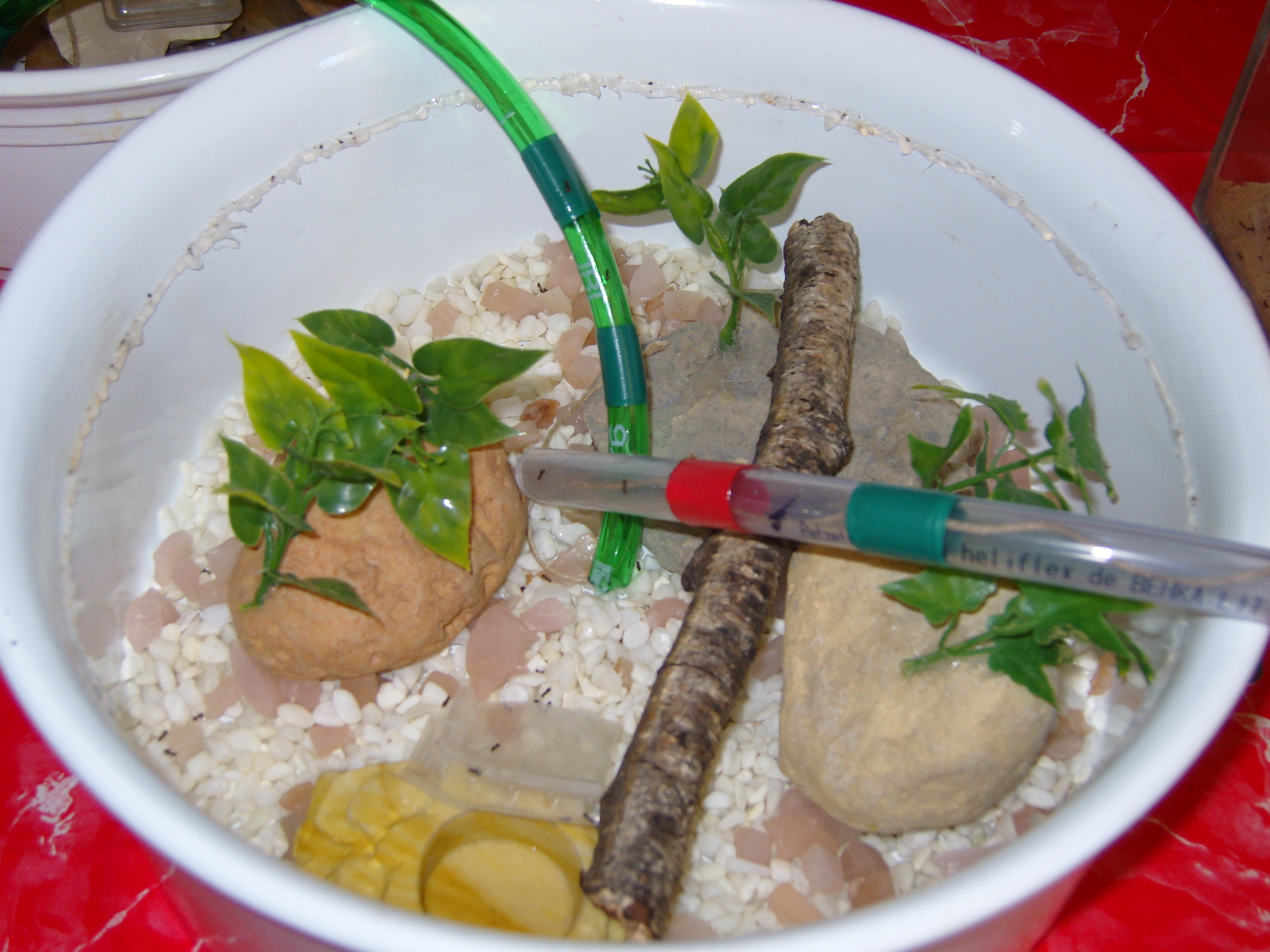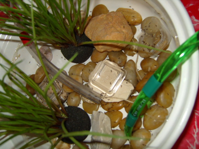 Eines der Keramikbecken ist mit grobem Kies ausgelegt. An einer Stelle haben die Ameisen einen Haufen Sand dazu ausgebreitet. Auch die Glasarena ist gut mit Sand bestückt worden. Würde micht echt interessieren, warum.