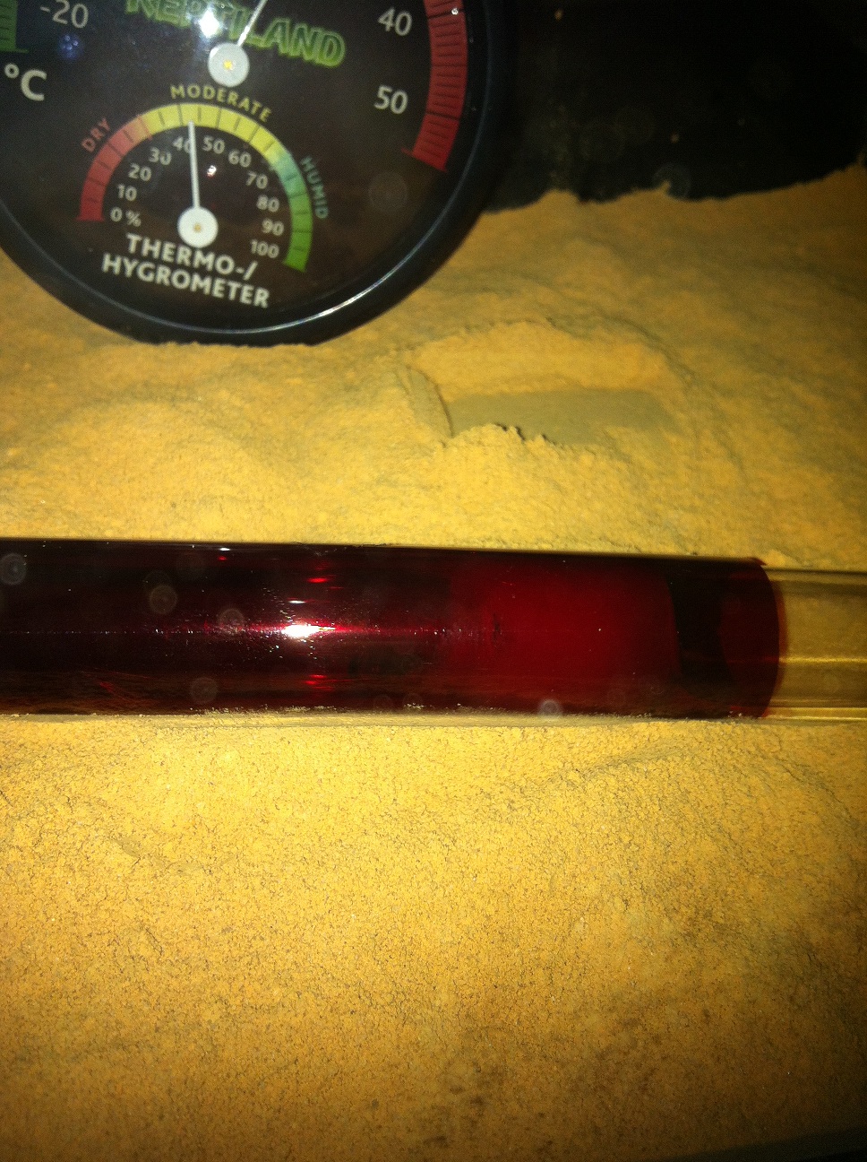Selbst nach einer Woche im 21°C warmen Wohnzimmer und vier Tage direkt auf der Heizung ist die Farm immer noch mit Kondenswasser bedeckt. Zum Glück dauert es ja noch ein wenig bis die ersten Arbeiterinnen schlüpfen und bis dahin ist es hoffentlich weg/weniger. Weil ich von oben auch ein wenig bewässert hab (vermutlich auch zu viel