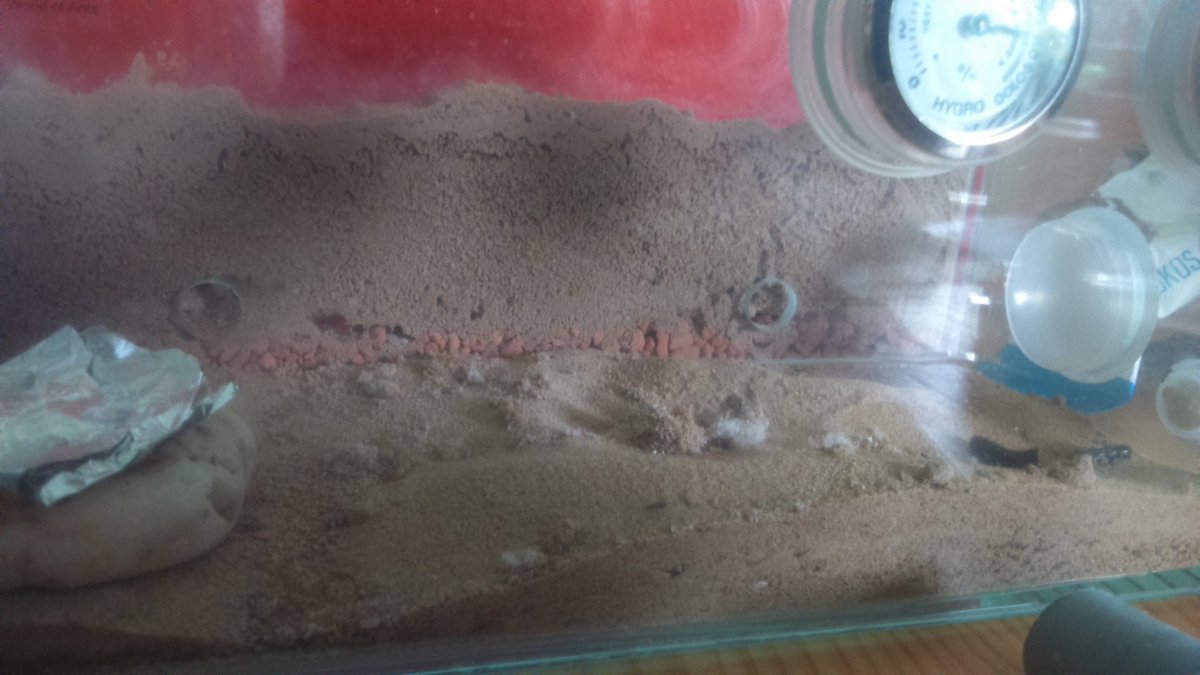 So, diese Woche ist nicht viel passiert. Die Ameisen hatten Eine grĂ¶ĂŸere Spinne als Nahrung, wollten die aber nicht nehmen, hab ihnen also MehlwĂŒrmer angeboten, die haben sie auch genommen. Außerdem hab ich ausprobiert ob sie Kartoffel mögen, aber leider nicht. Es gab jeden zweiten Tag Zuckerwasser und das Wasser wurde auch jedes mal wenn es leer war gewechselt. Ich sehe immer noch nichts von dem Innenleben der Farm, aber das braucht sicher noch eine Weile. Dann bis nĂ€chste Woche!