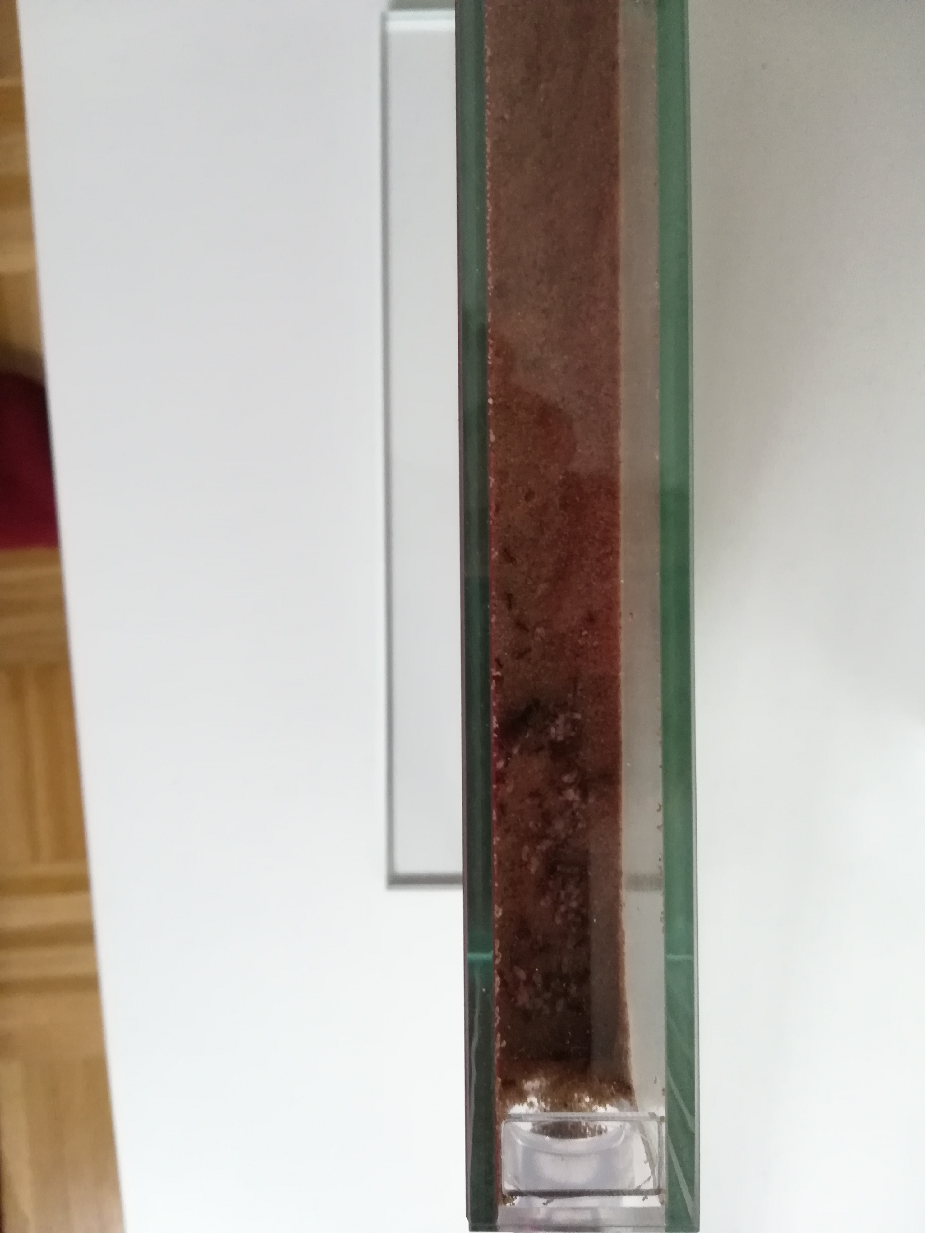Gestern konnte ich beobachten das Arbeiterinnen Larven und Eier AUF den Sand von der Farm legen, (ich dachte mir zuerst nichts dabei da dieses Verhalten noch normal ist - dort wo es warm ist wird die brut hingetragen, ok).