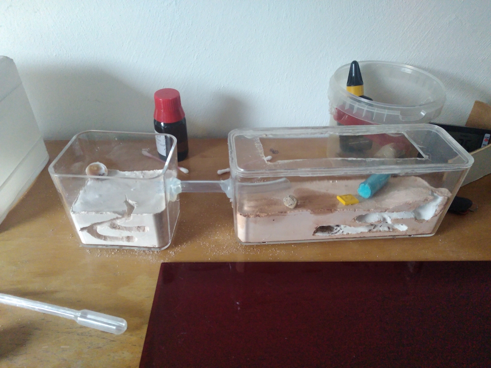 anbei nun ein Bild des Aufbaus. Links neben dem gelben Legoblättchen (Honigtrog) träufel ich meine Wassertropfen hin. Das blaue ist ein feuchter Küchenlappen in einem Plastikschlauch.