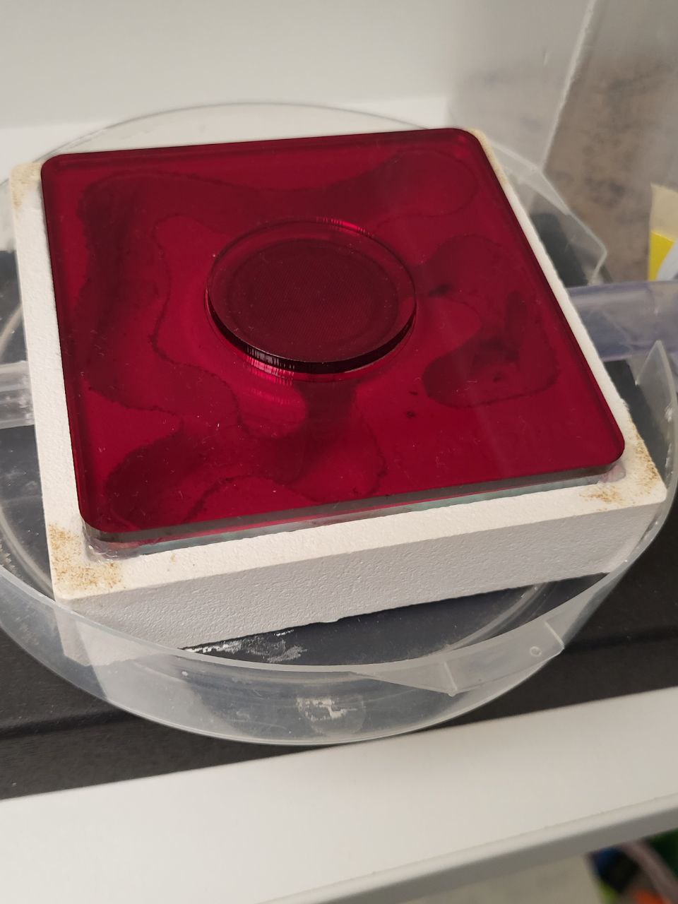 Gehalten wird die Kolonie ganz simple in einer SAMLA Box. Aktuell lebt die Kolonie noch in dem RG und zieht hoffentlich bald vollständig um in das 10x10cm Gipsnest. Wieso schreibe ich vollständig? Ein kleiner Teil der Kolonie bewohnt mittlerweile schon das Gipsnest. Es halten sich immer ca. 10-15 Arbeiterinnen in einer Kammer auf mit einigen