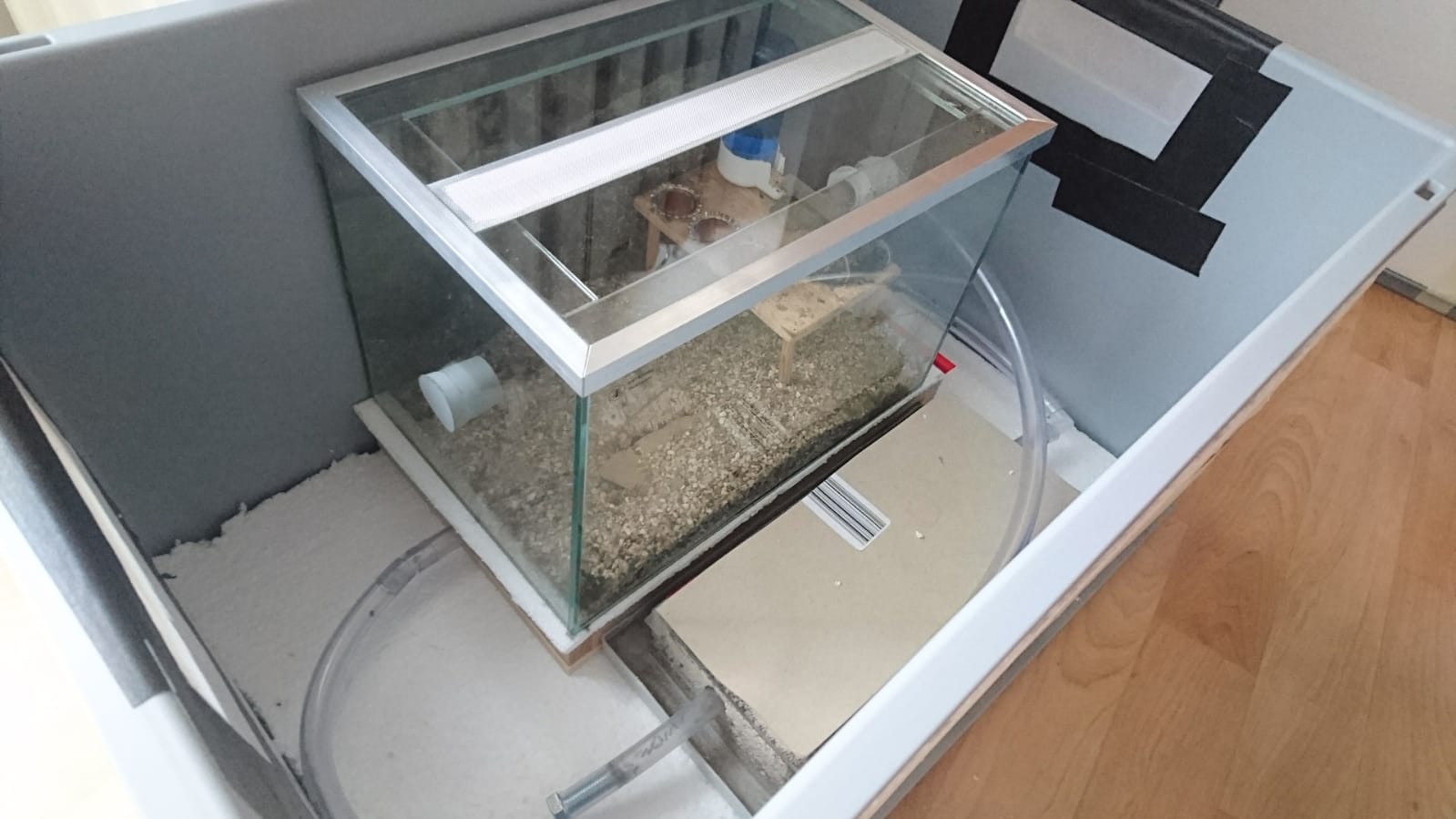 Das Holznest wird, von einer Zeitschaltuhr gesteuert, mit einer Heizmatte erwärmt. Der Großteil der wärmeliebenden Formica fusca hält sich dort auf: