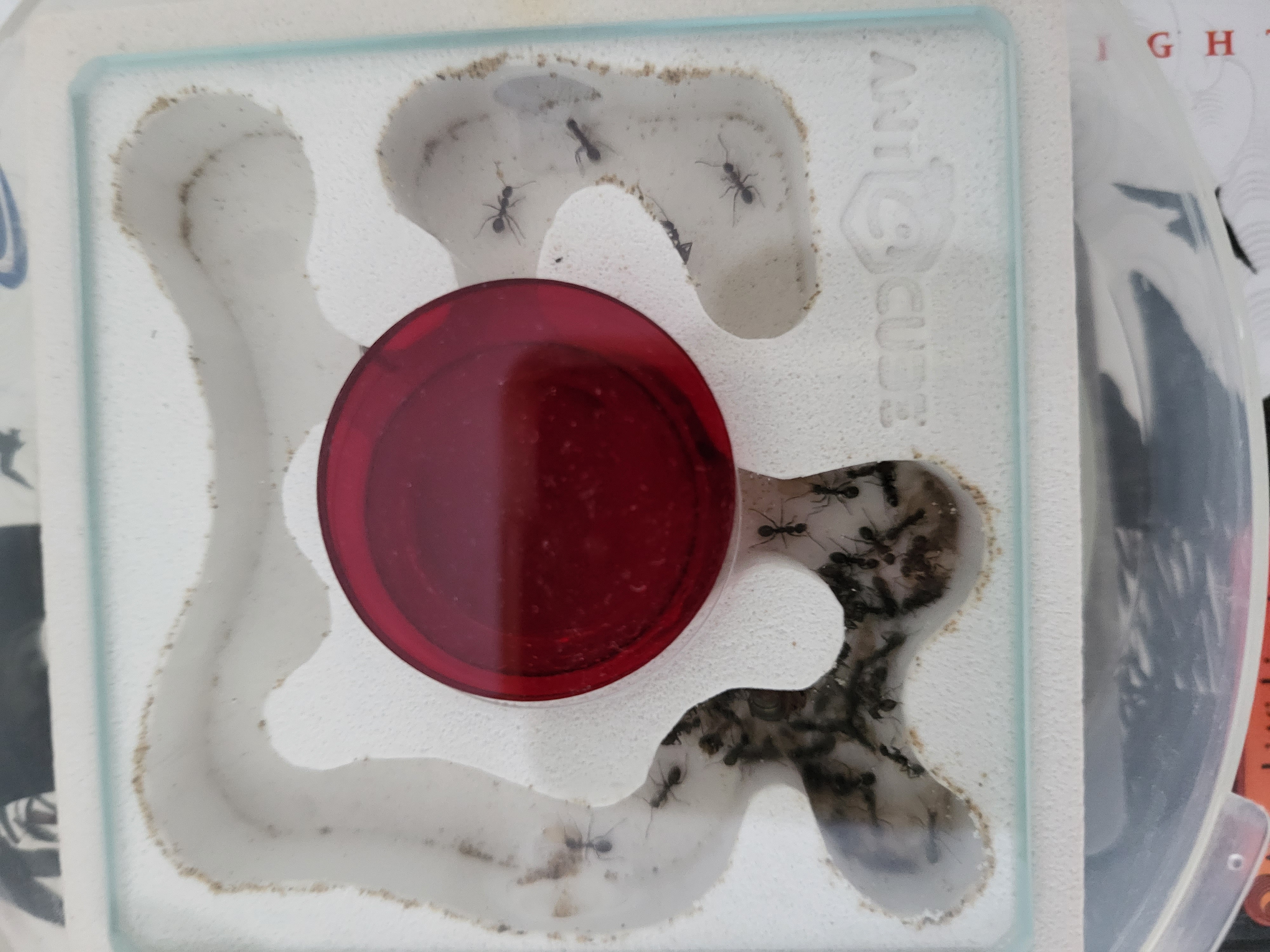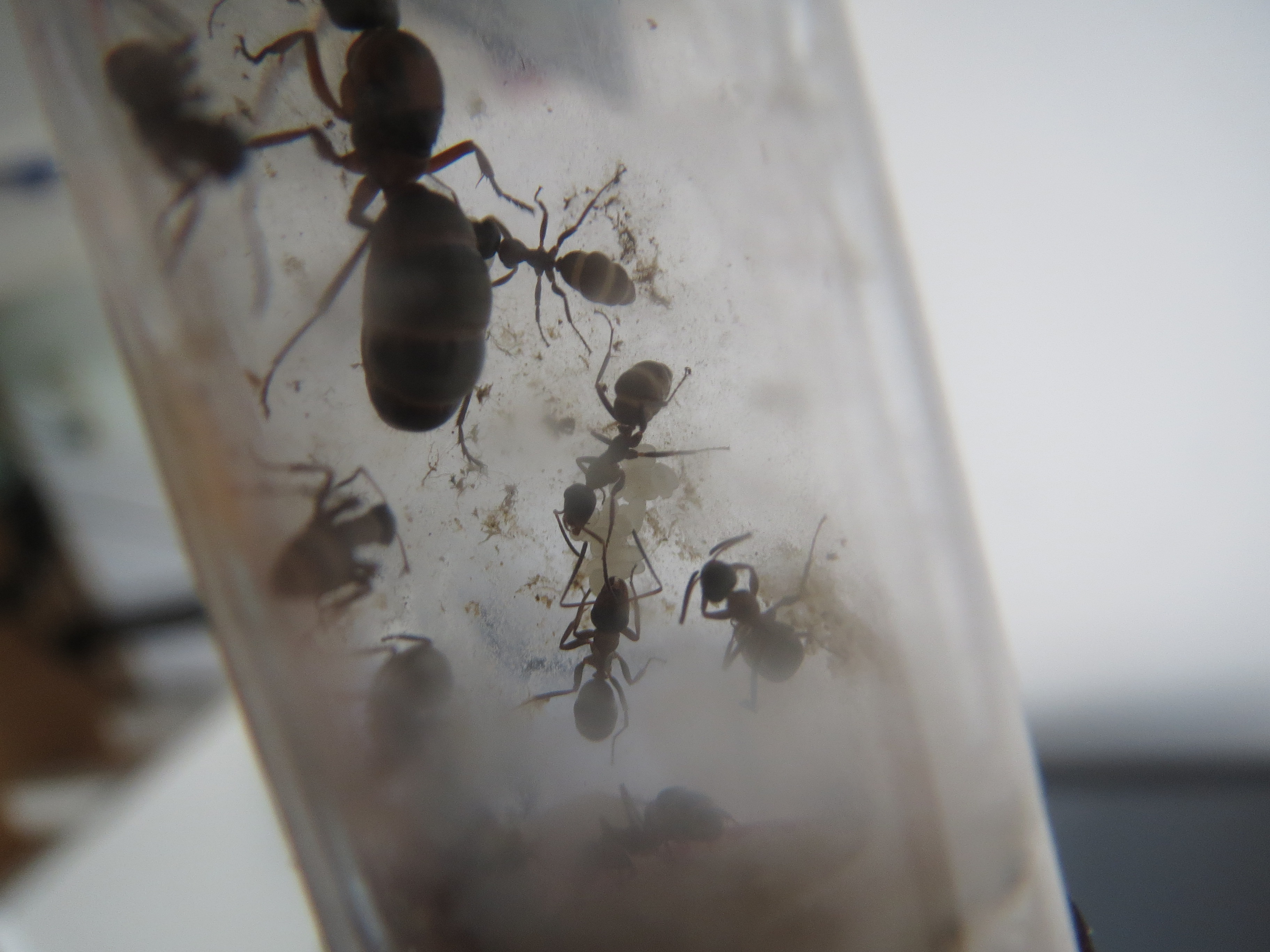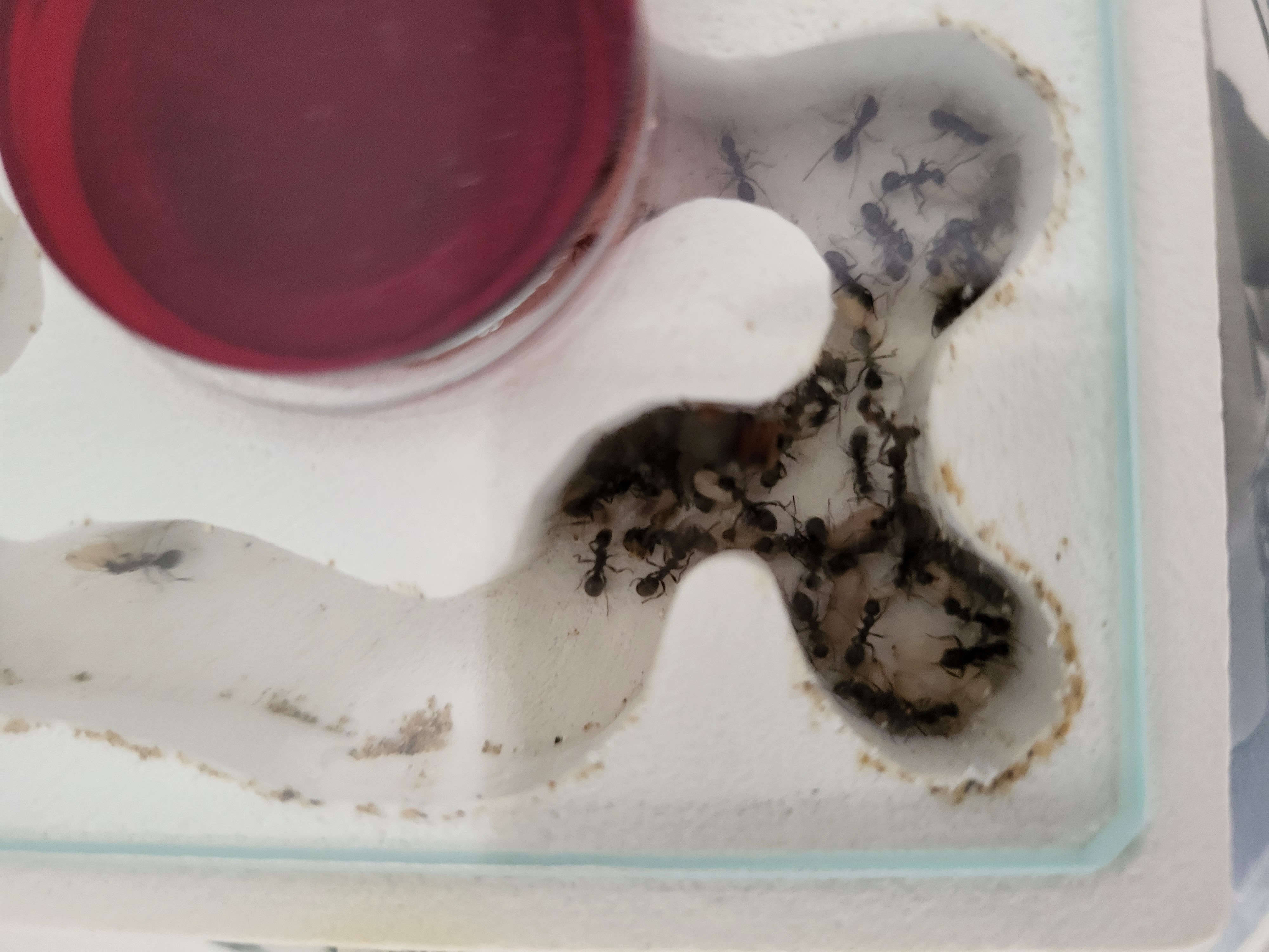 Schade finde ich bei dieser Kolonie, dass es keine Rekrutierung gibt beim Futter wie bei den Lasius niger. Futterteile werden immer versucht, alleine ins Nest zu tragen. Und wenn es nicht klappt, lassen sie das Futtertier einfach liegen in der Arena. Bin mir dann immer unsicher, ob sie nun Proteinbedarf haben, der nicht gedeckt wird (dadurch dass sie nichts reintragen) oder ob die einzelne Arbeiterin etwas mitnimmt und ĂŒber den sozialen Magen weitergibt?
