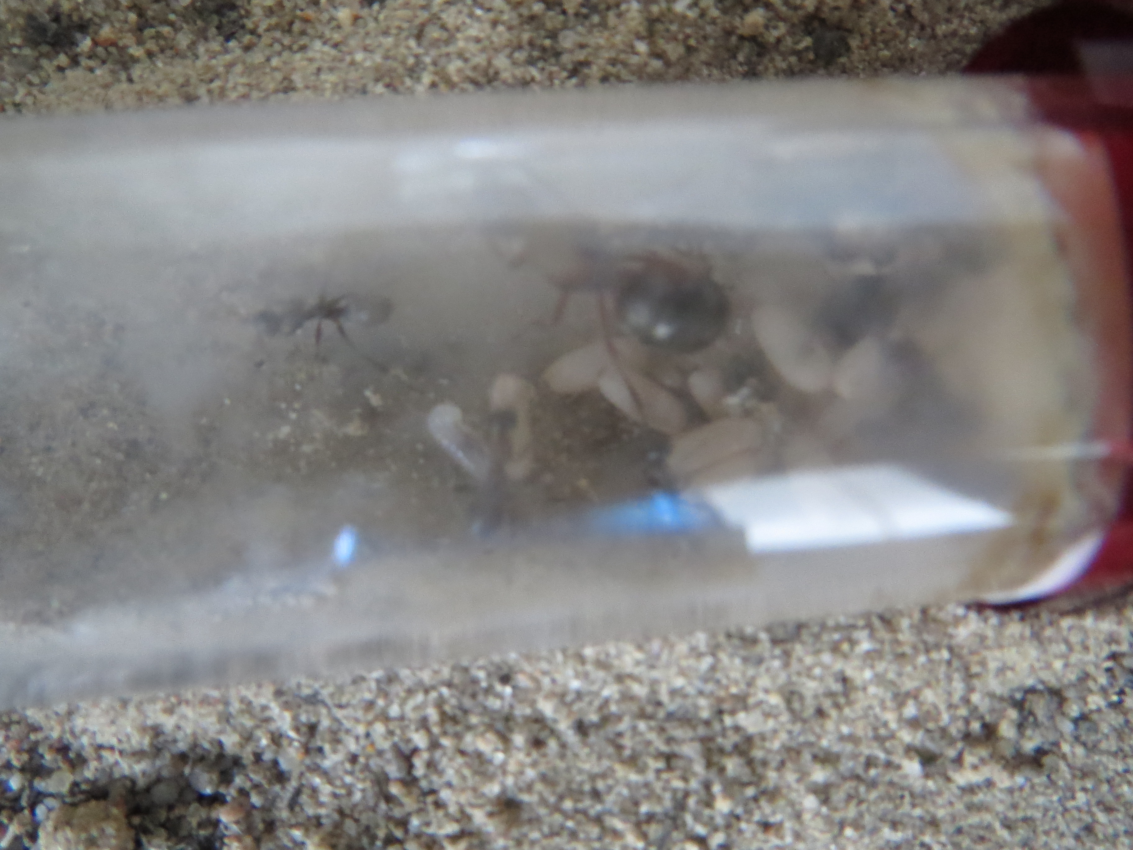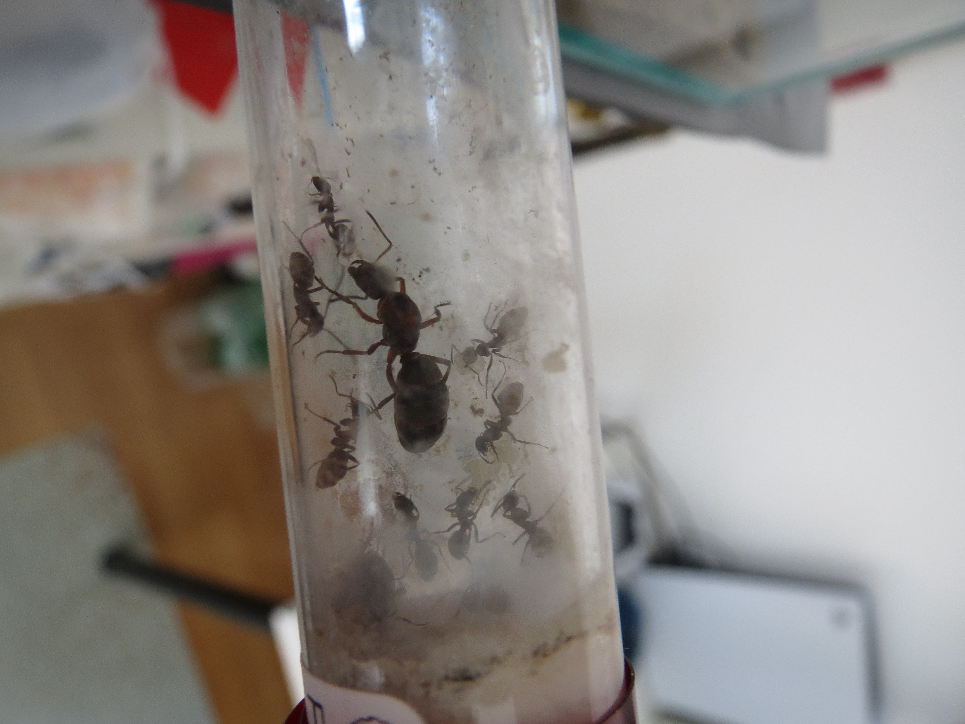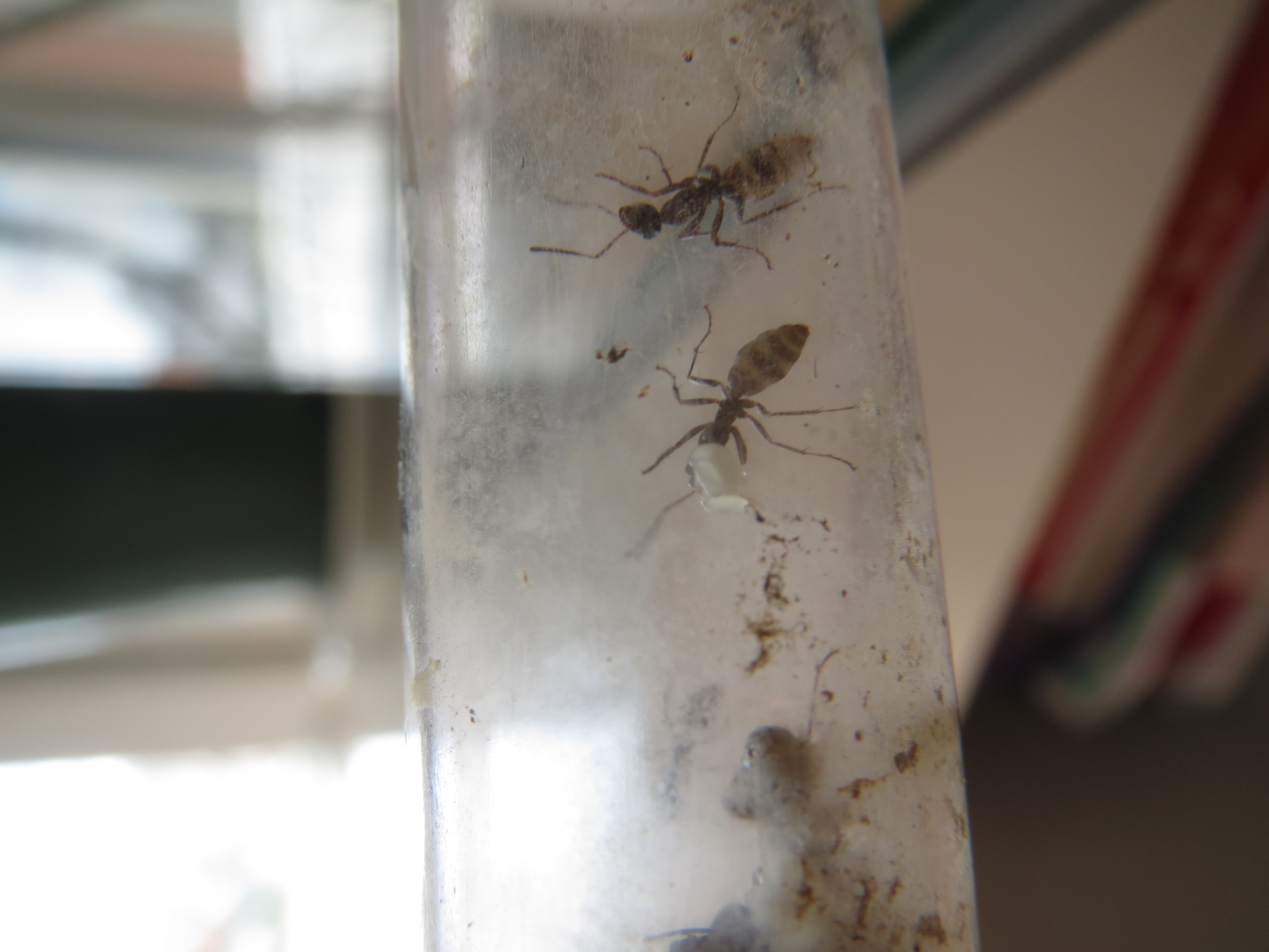 Schade finde ich bei dieser Kolonie, dass es keine Rekrutierung gibt beim Futter wie bei den Lasius niger. Futterteile werden immer versucht, alleine ins Nest zu tragen. Und wenn es nicht klappt, lassen sie das Futtertier einfach liegen in der Arena. Bin mir dann immer unsicher, ob sie nun Proteinbedarf haben, der nicht gedeckt wird (dadurch dass sie nichts reintragen) oder ob die einzelne Arbeiterin etwas mitnimmt und ĂŒber den sozialen Magen weitergibt?