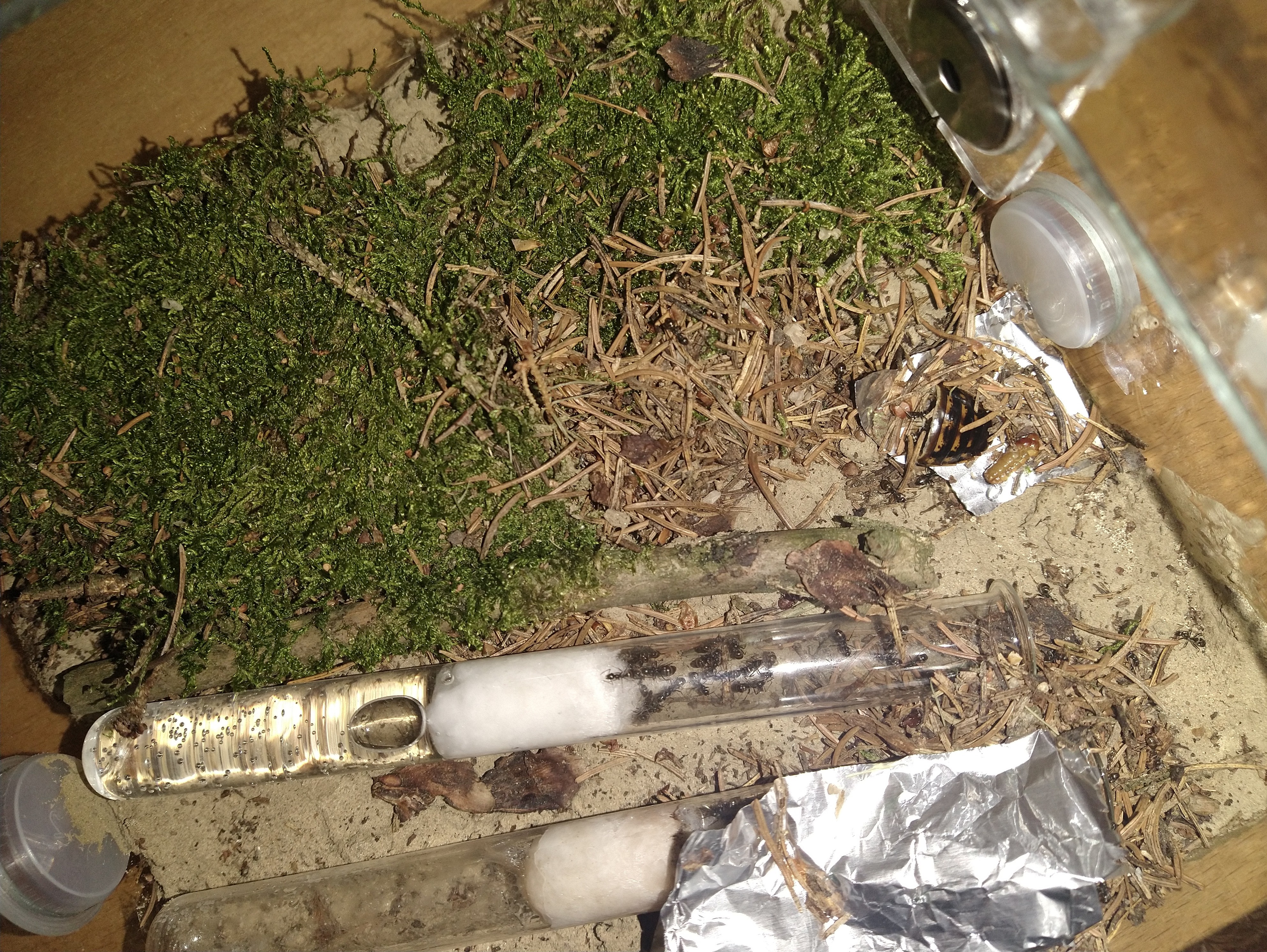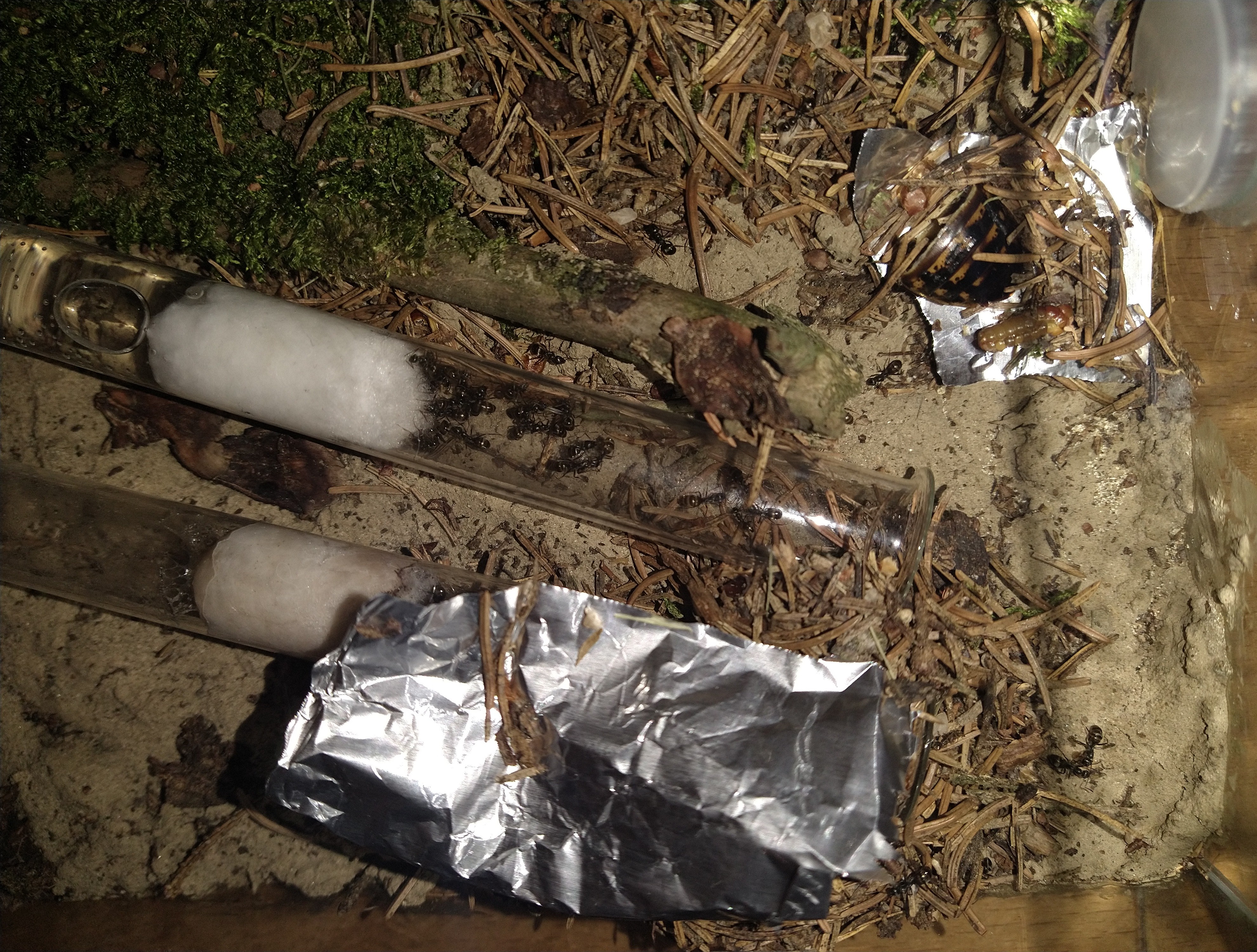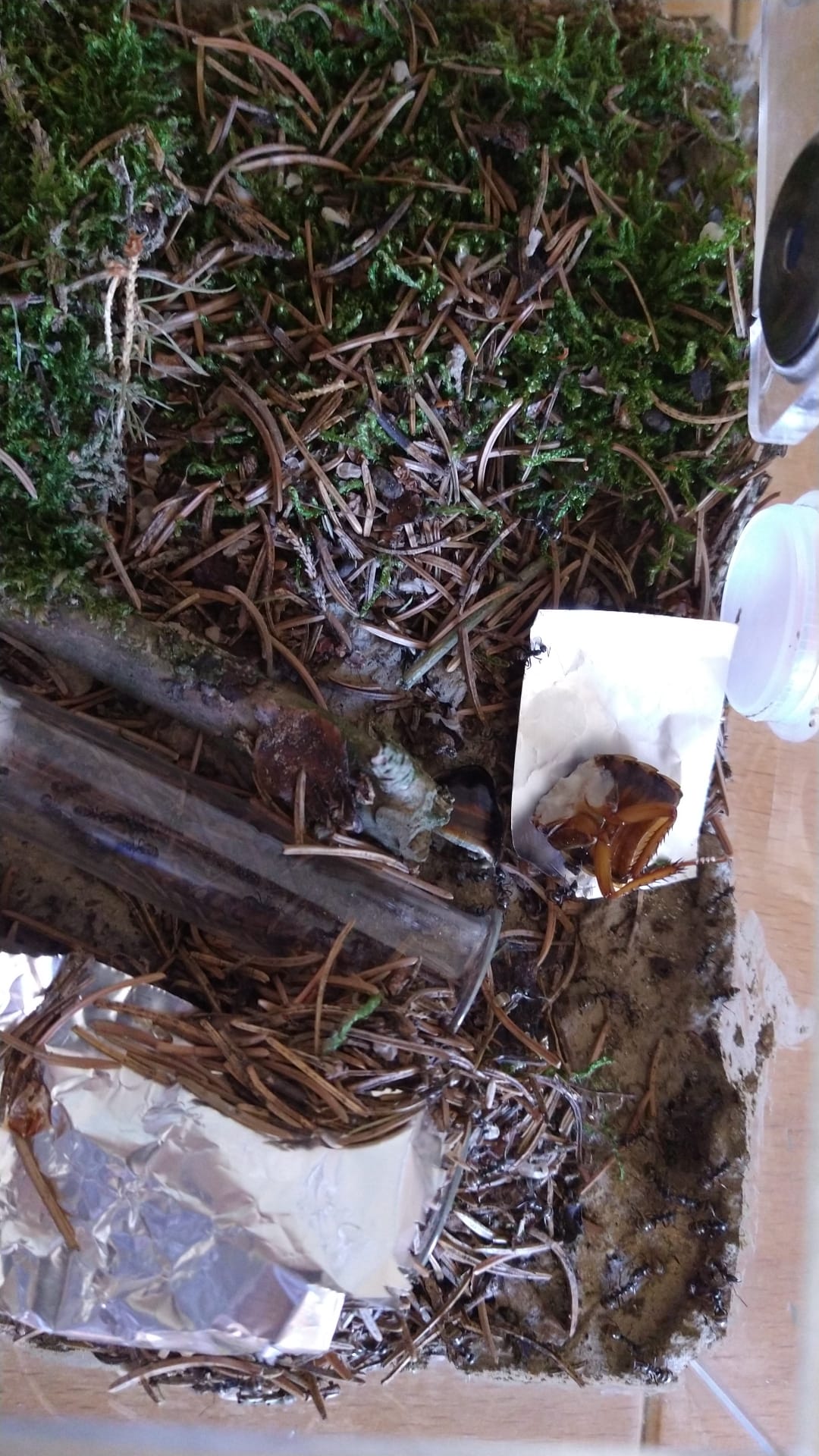 Nachdem ich theoretisch vor gut einer Woche 20 Minuten lang ein Update geschrieben habe, mit allen Hintergrundinfos, dieses dann (warum auch immer) nicht gepostet werden konnte, weil die Seite was dagegen hatte und dann auch noch der ganze Text weg war, ist es mir nun anscheinend wieder möglich, etwas zu schreiben. Im Grunde läuft das alles soweit ganz gut, seit dem letzten Update vor 3 Wochen hat sich nicht viel getan (außer logischerweise 4-5 Fütterungen), einzig die Waldschaben haben sich mit der letzten Fütterung erledigt. Theoretisch habe ich natürlich die Jungtiere zum Verfüttern, allerdings wäre das (einmal ganz pragmatisch gedacht) momentan eine völlig sinnlose Ressourcenverschwendung, weil die alle noch ca. 3-mal so groß werden können wie jetzt. Stattdessen werde (oder habe, je nachdem, wann ihr das lest) ich mir 50 adulte Schokoschaben gekauft. Diese werde ich einfach nur 1-2 Wochen anfüttern, danach alle gesammelt abkochen und einfrieren. Sollte dann hoffentlich langen, bis die Waldschaben adult sind, wenn nicht kann man aber ja die Prozedur noch einmal wiederholen. Die Außenaktivität ist nach wie vor sehr hoch, 30 Arbeiterinnen sind eigentlich immer draußen. Die gestrige Fütterung habe ich leider nicht fotografiert, aber zumindest kann ich euch die Bilder der vorletzen Fütterung (10 Tage her) zeigen.
