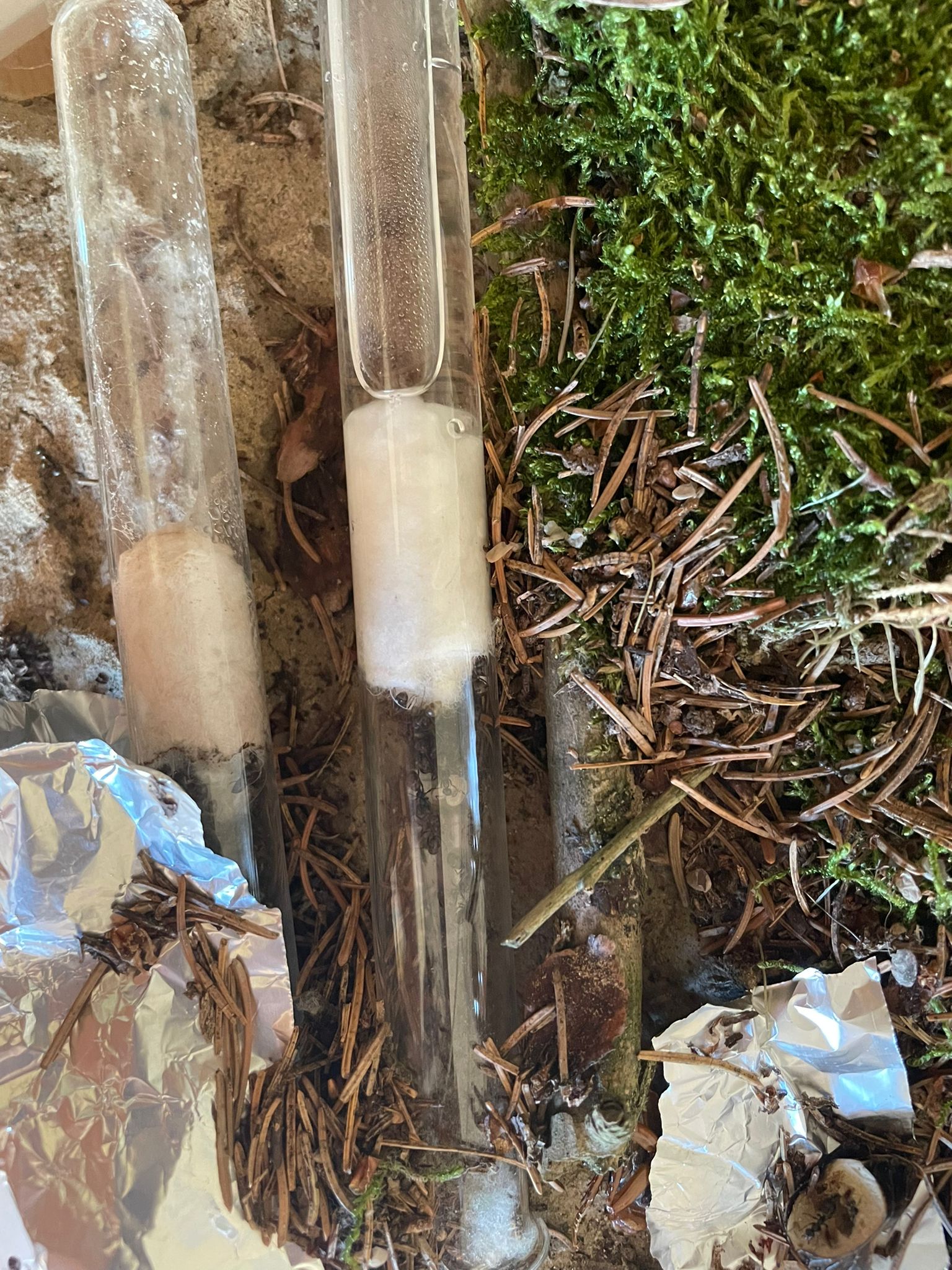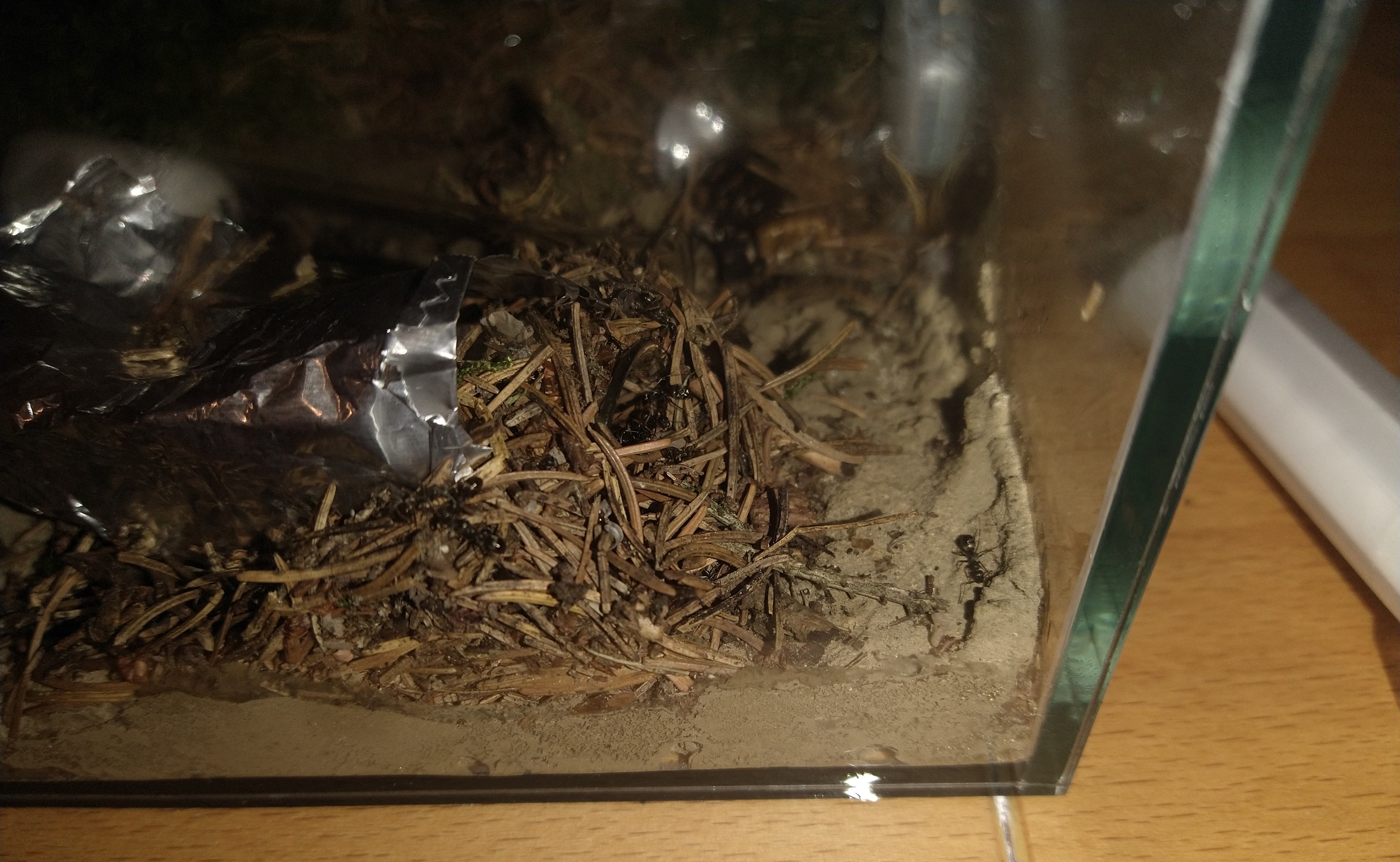 Von der gestrigen Fütterung konnte ich kein Bild machen, weil ich die quasi zwischen Tür und Angel gemacht habe. Was mir aber in den letzten Tagen aufgefallen ist, war, dass man das RG (man hat sich entschieden, doch wieder dorthin zu ziehen) sehr eifrig zugebaut hat und hier auch immer wieder Veränderungen vorgenommen hat. Aktuell hat man den Eingang dicht und großflächig zugebaut und (warum auch immer) auch den Raum zwischen RG und Scheibe mit Tannennadeln bekleidet. Sieht dann so aus: