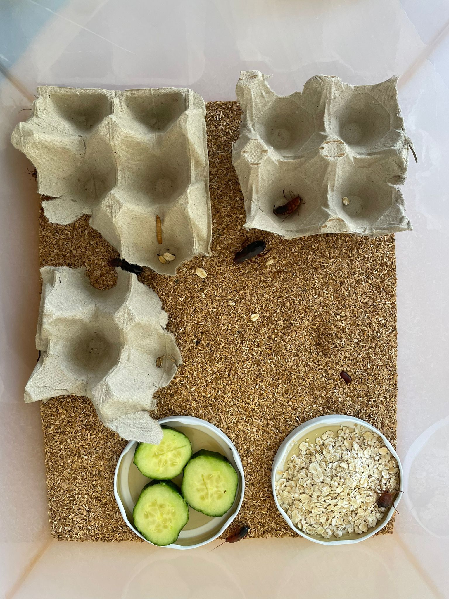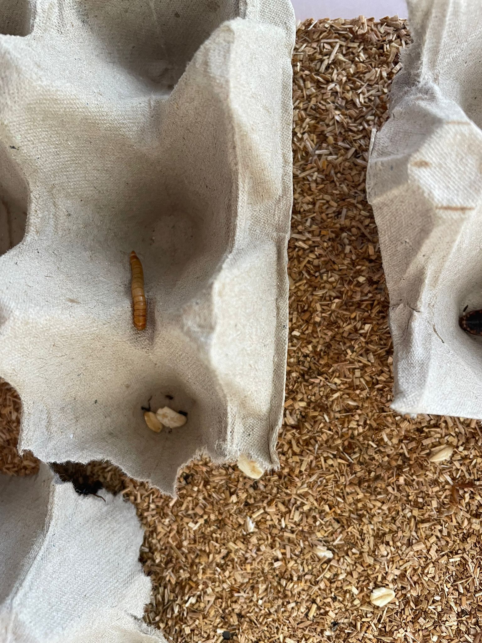 Heute gab es quasi im doppelten Sinne gute Nachrichten. Die Schaben sind (endlich) angekommen, dementsprechend kann ich morgen wieder füttern. Gewissermaßen hat man mir 50+1 Futtertiere geliefert, denn irgendwie hat sich zwischen die Schaben ein Mehlwurm gemogelt. Für den habe ich aktuell zwar keine Verwendung, er stört mich zwischen den Schaben aber auch nicht.