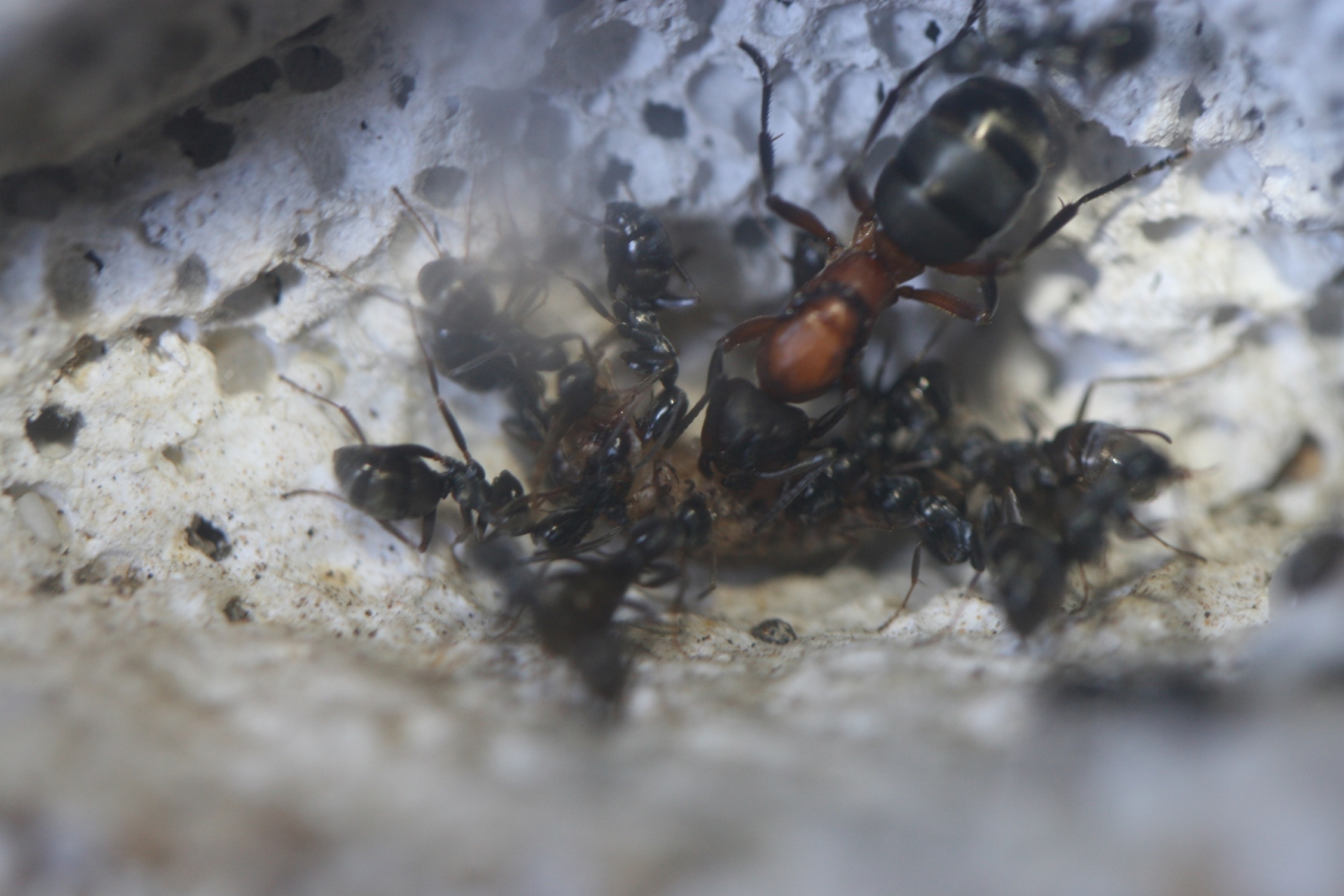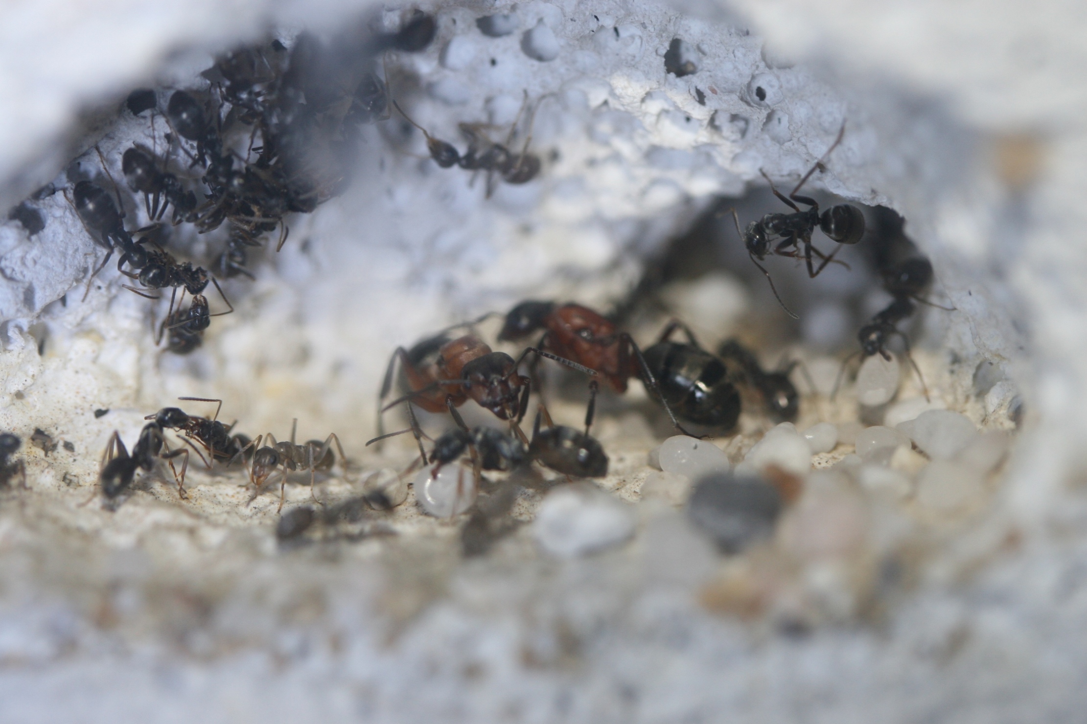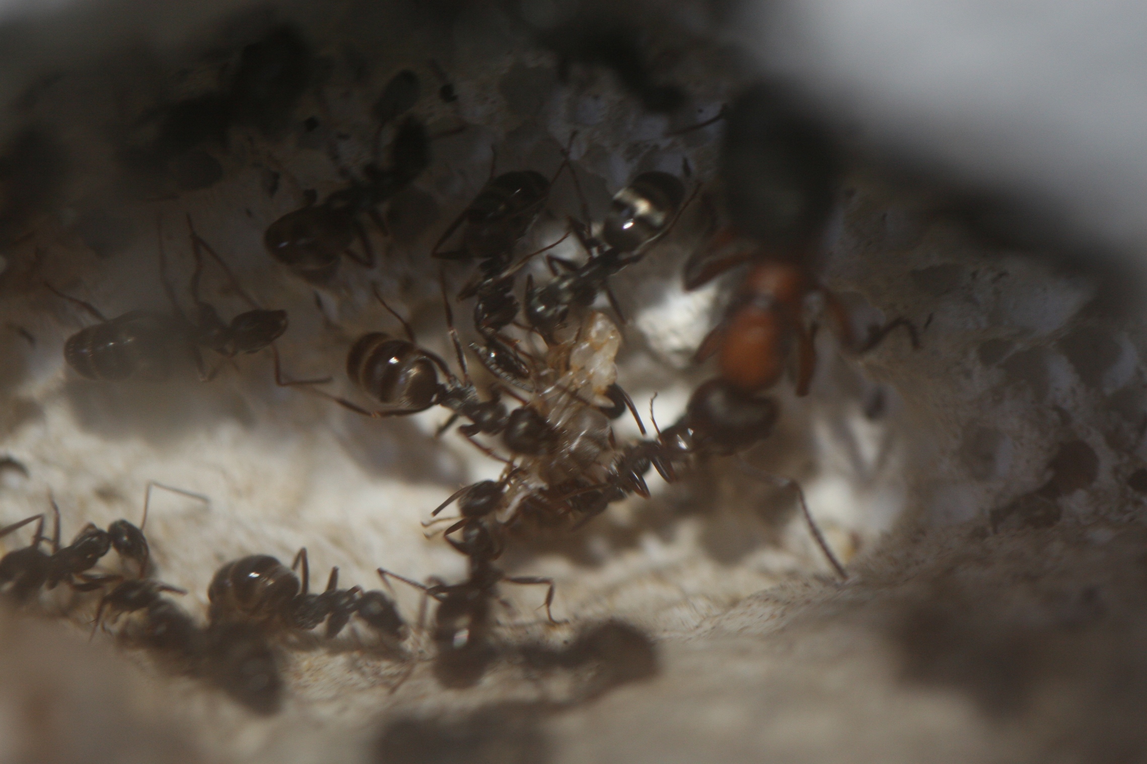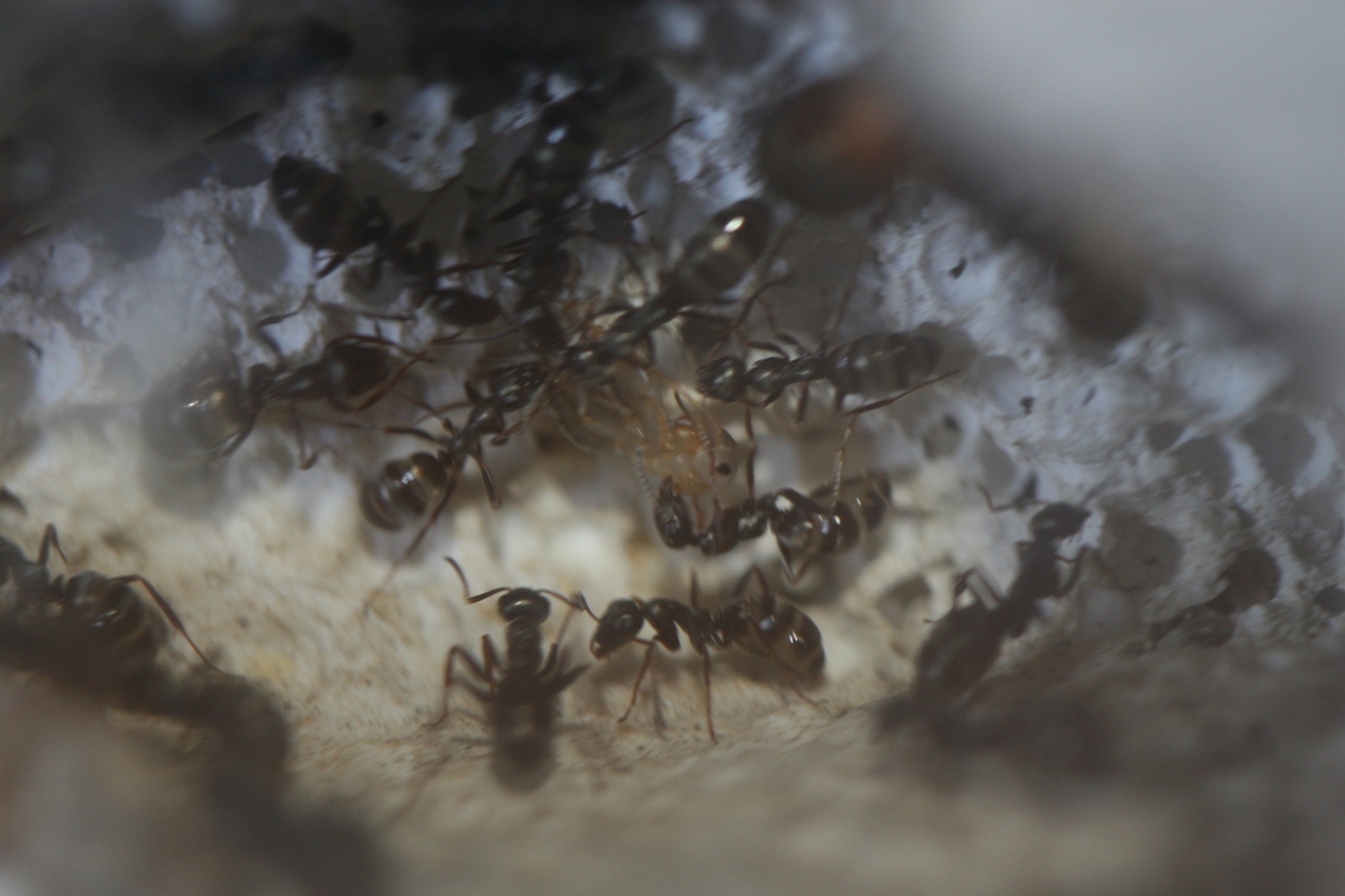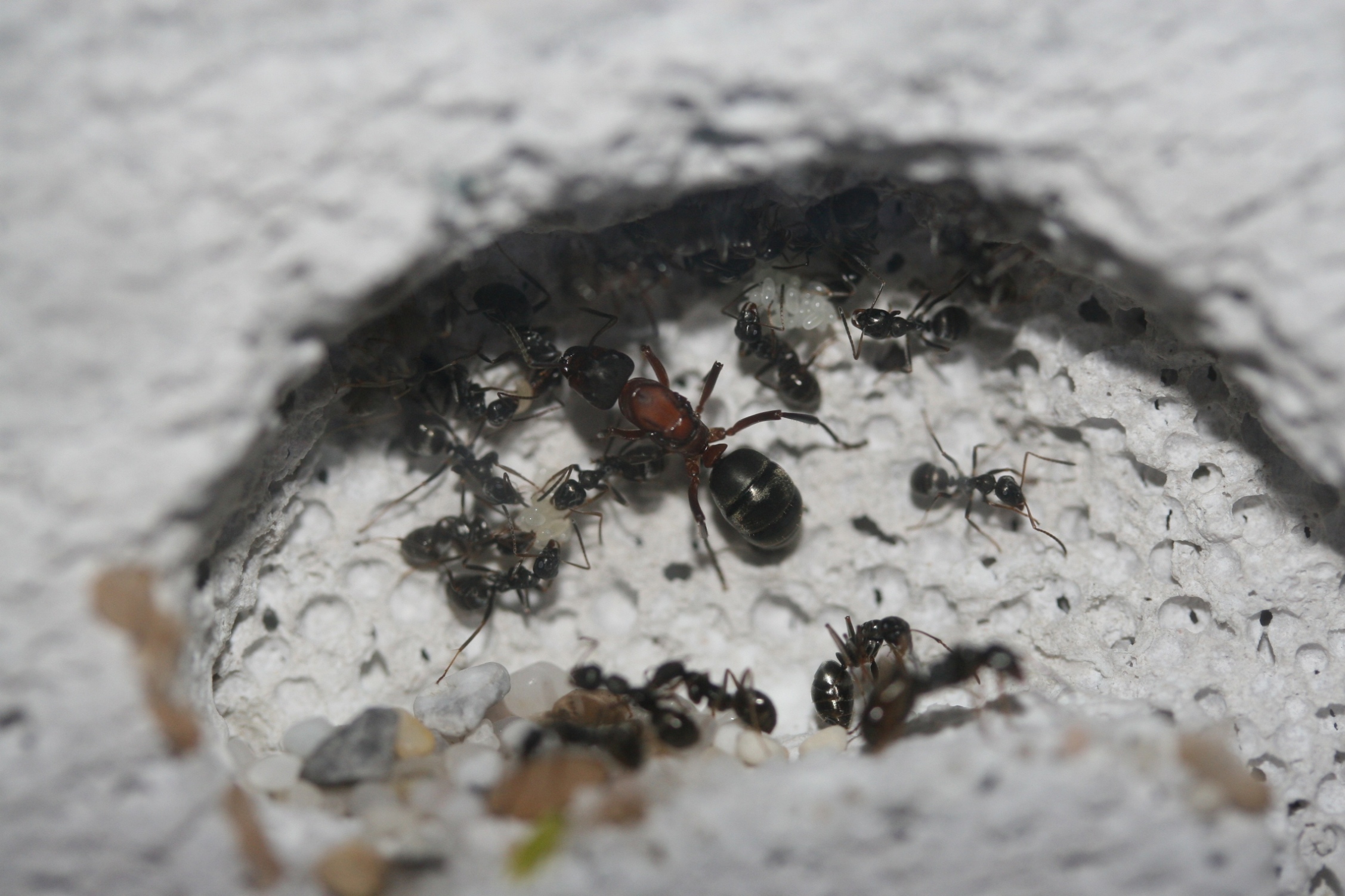 Außerdem hatte ich mich dann doch dazu entschlossen sie in einen kleineren Ytong umziehen zu lassen, da sie die leeren Geschlechtstierpuppen nicht mehr abtransportierten. Die waren mittlerweile durch den Schimmel mehr oder weniger zusammengewachsen.