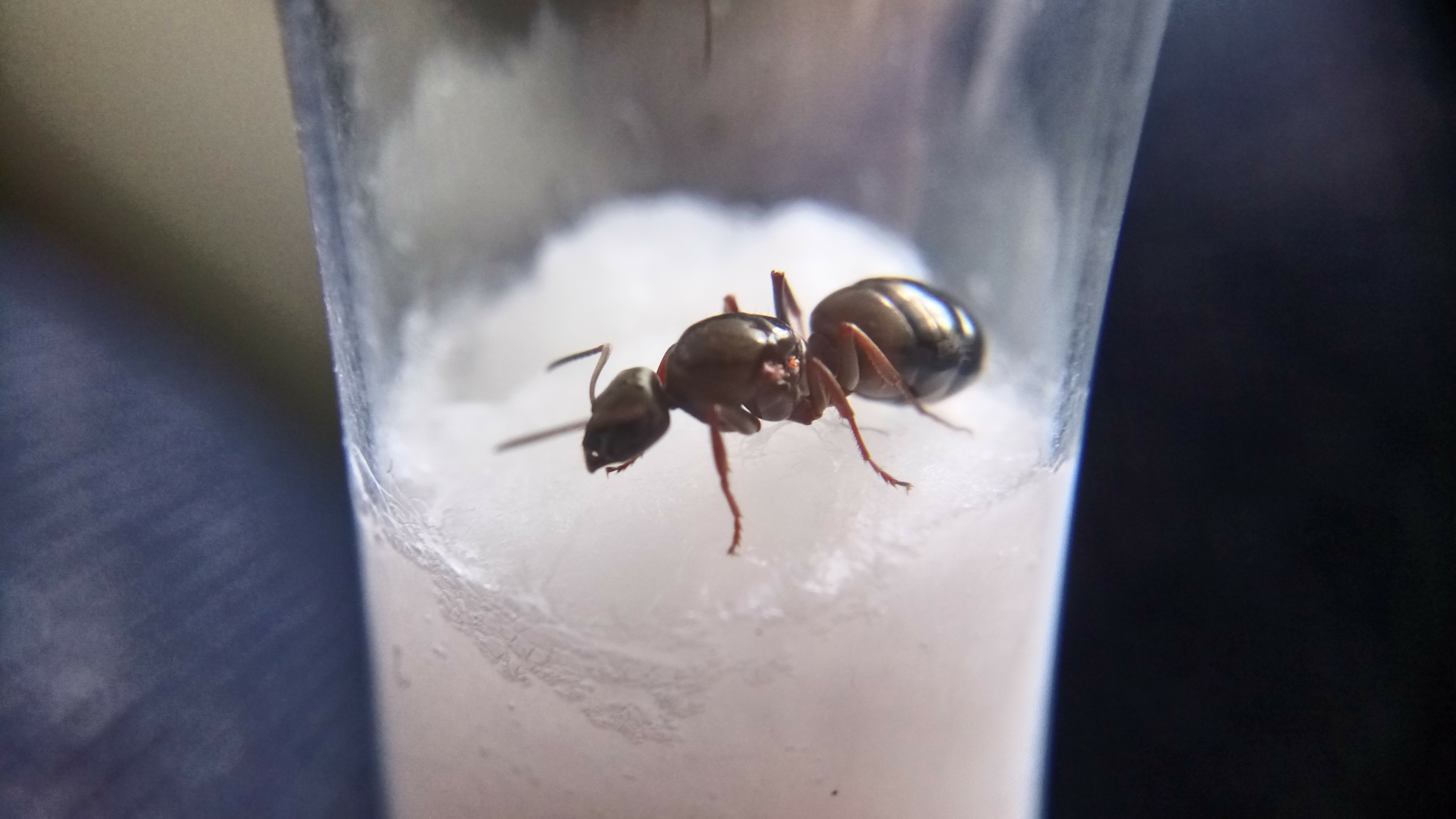 Das Reagenzglas ist relativ voll mit Substrat, Watte, Futterresten und beinhaltet einige Staubläuse. Ich werde vor der