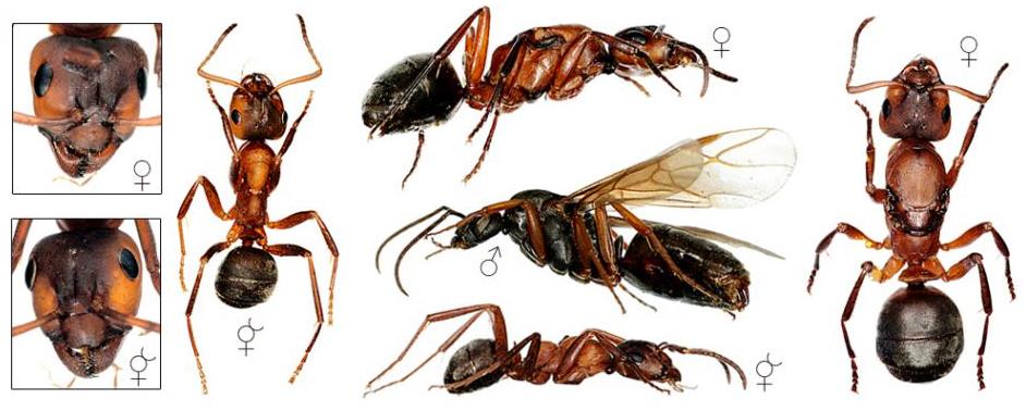 Die Gyne in diesem Thread, auf Bild-1 und 2 ist die Selbe und zeigt deutlich die Kopfkerbe. Wie soll man das anders erklären, wenn es keine Raptiformica wäre? Ich beziehe mich hier auf die Beschreibungen der ameisenschutzwarte.de. Der Texter will Farbnuancen nur anhand einer Fotografie unter Kunstlicht der Formbestimmung vorziehen? Bei ziemlich jeder Tierart gibt es begrenzte Farbnuancen. Setzt man 5 Eichhörnchen nebeneinander, gibts hellrote, braune, schwarze... Sind das deshalb plötzlich eigenständige Arten? Hier eine Tafel zur "Gesichtsmaske" der Raptiformica vom Fotografen Josef Dvorak. (Keine Angst, ich habe seine schriftliche Einwilligung zur Verwendung seines Bildmaterials erhalten, als ich das PDF des Exkursionshandbuchs erarbeitete)